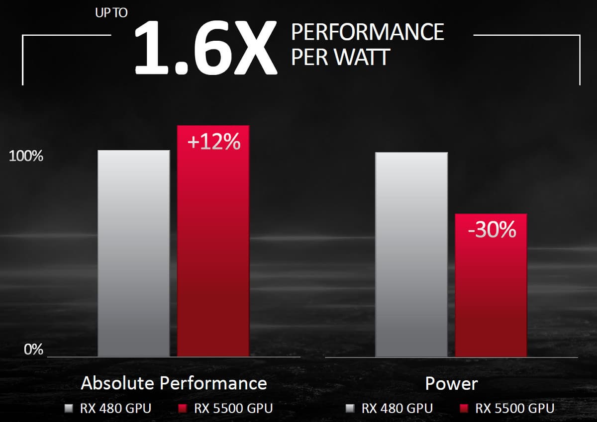 Все архитектурные улучшения RDNA по сравнению с GCN привели к тому, что эффективность (общая производительность GPU при равной тактовой частоте) выросла на четверть, а энергоэффективность — на все 50%. При этом преимущество конкретно от техпроцесса 7 нм составило лишь около 25%-30%, а остальной прирост был достигнут за счет архитектурных улучшений в RDNA и модернизированной системы питания.