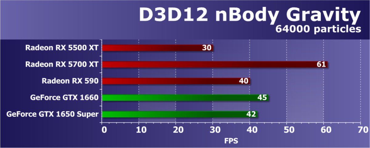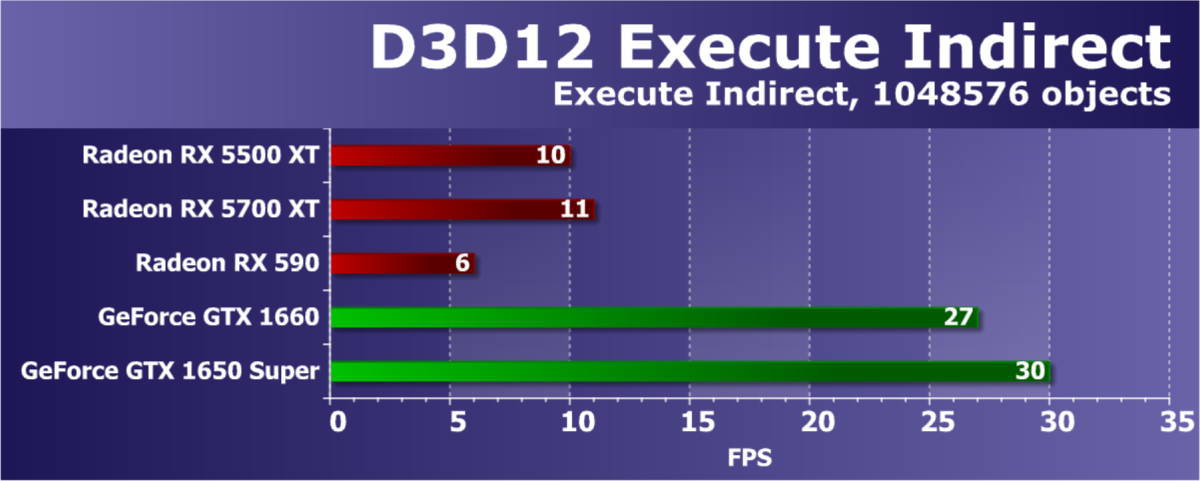 Из более-менее новых бенчмарков мы начали использовать несколько примеров, входящих в DirectX SDK и пакет SDK компании AMD (скомпилированные примеры применения D3D11 и D3D12), а также несколько тестов для измерения производительности трассировки лучей. В качестве полусинтетического теста у нас также используется и довольно популярный 3DMark Time Spy, помогающий определить прирост от асинхронных вычислений в том числе.