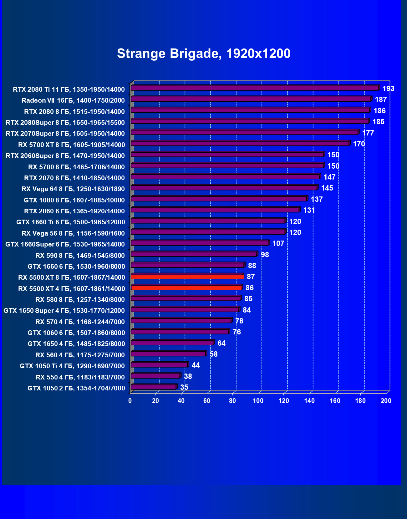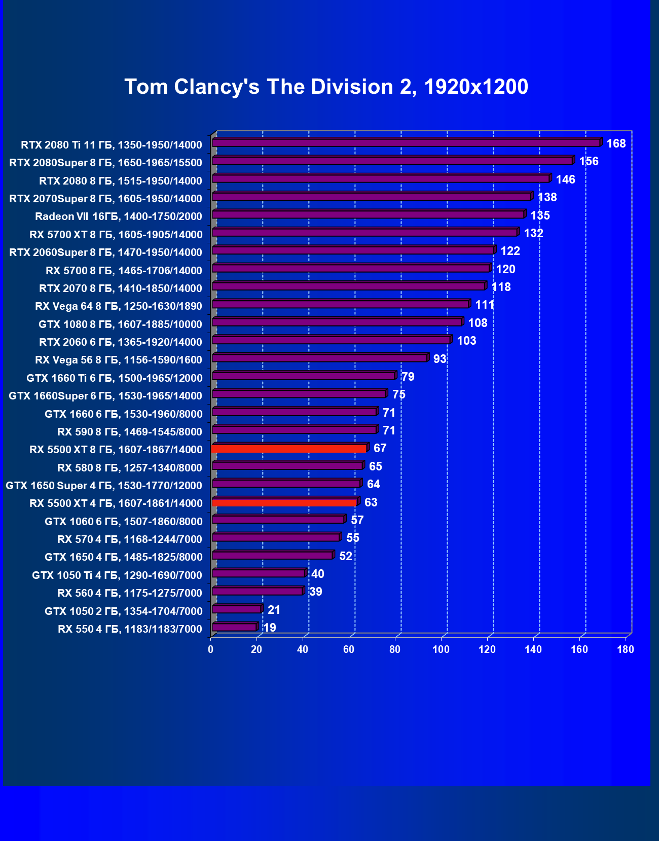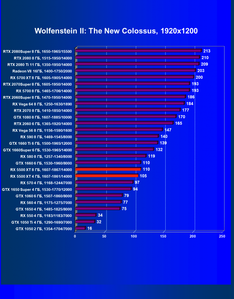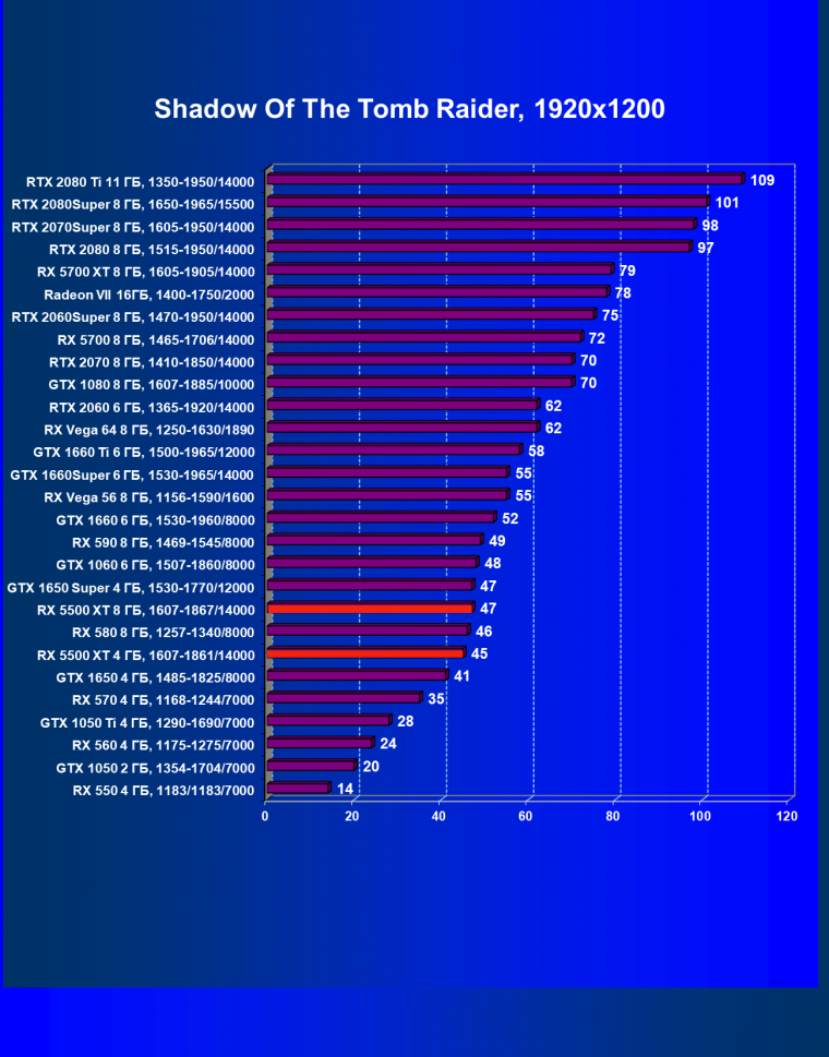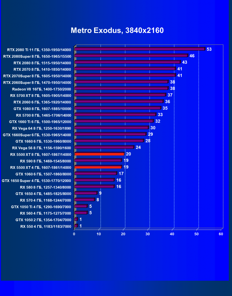 | 20 | RX 5500 XT 4 ГБ, 1607—1861/14000 | 420 | 326 | 12 900 |