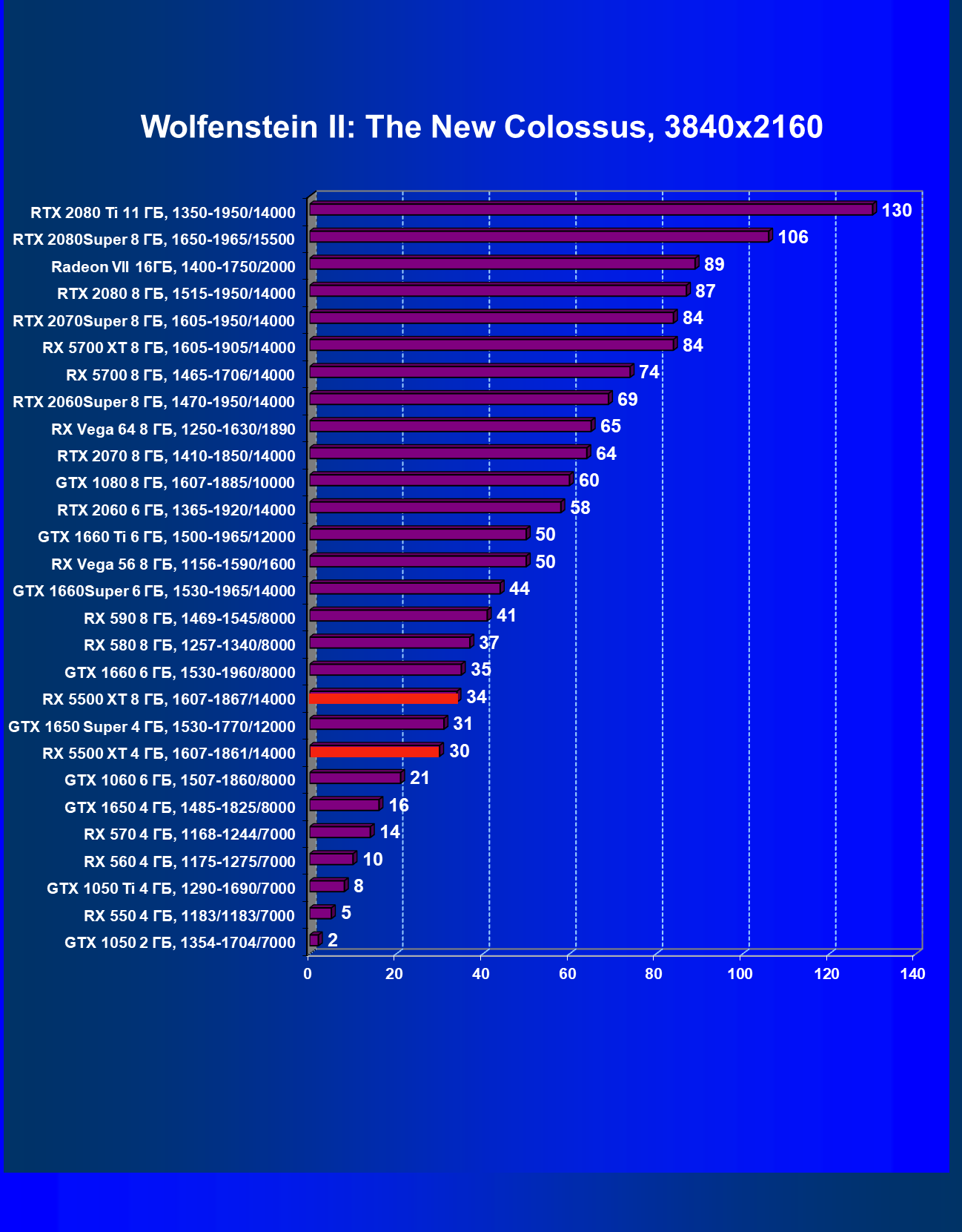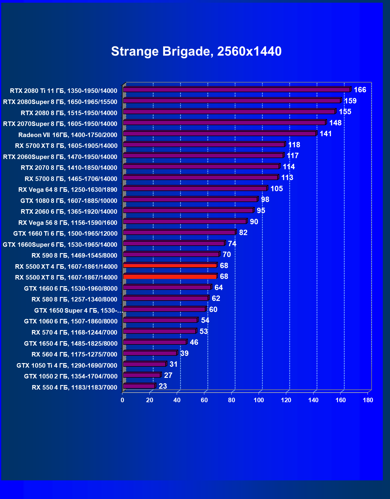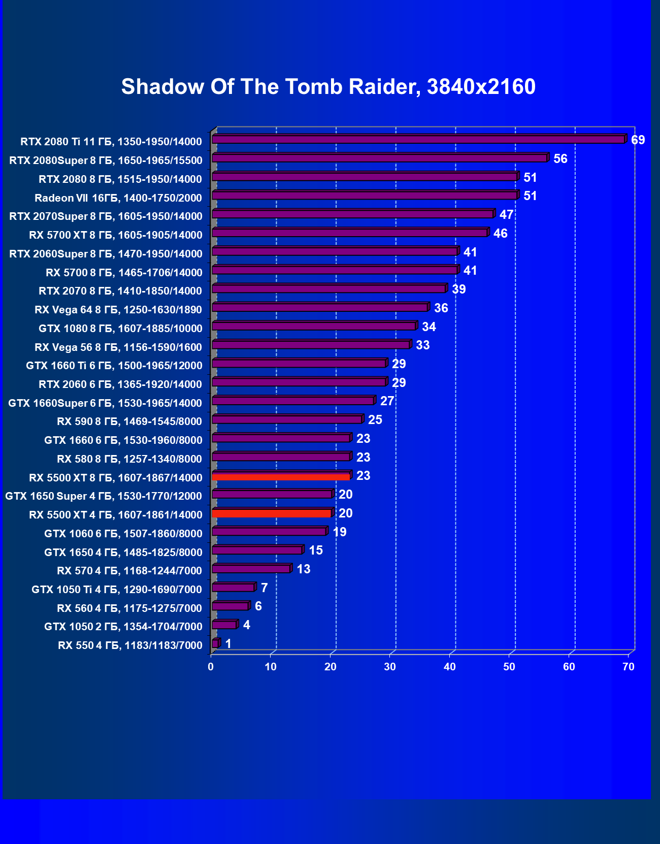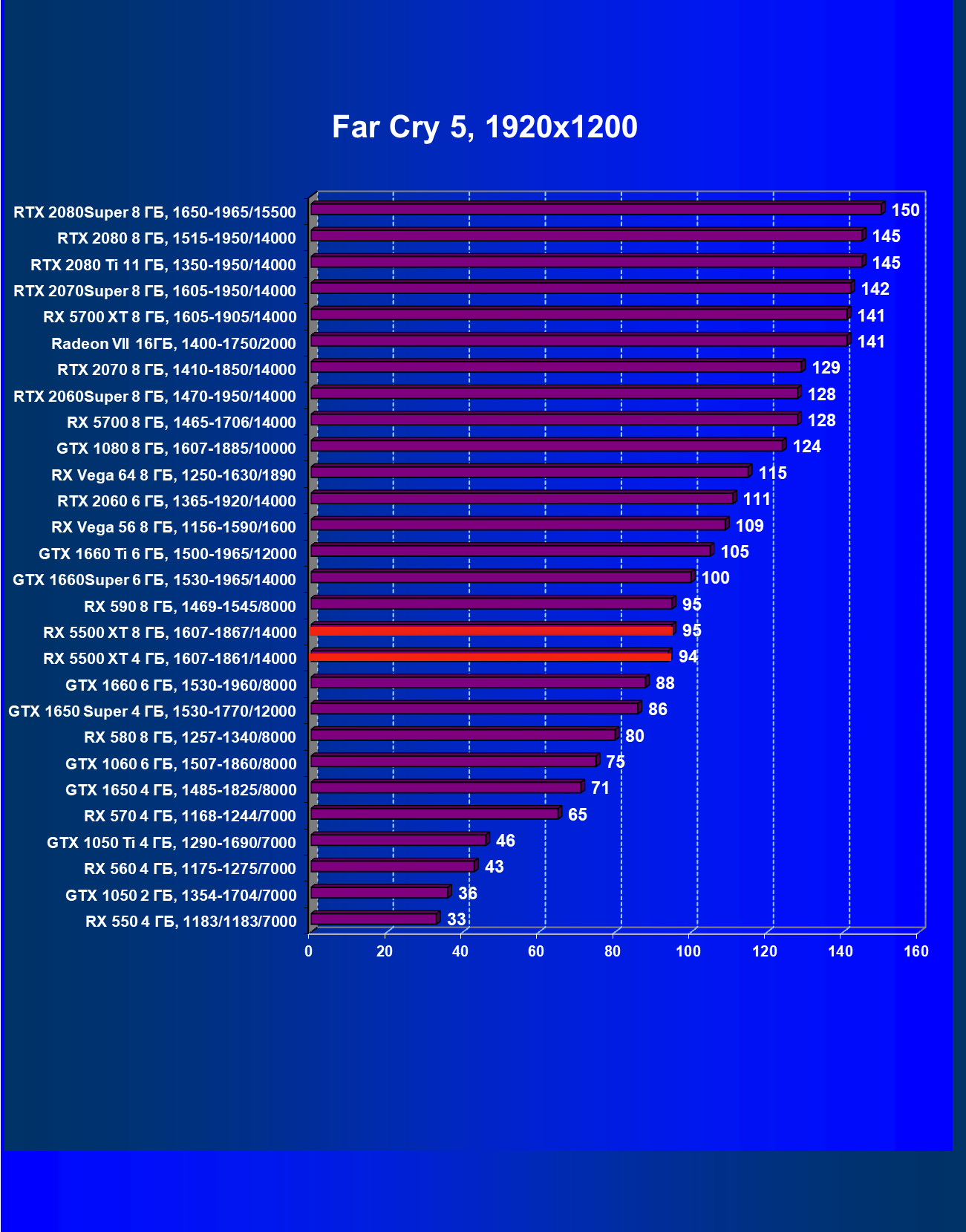| 20 | RX 5500 XT 4 ГБ, 1607—1861/14000 | 420 | 326 | 12 900 |