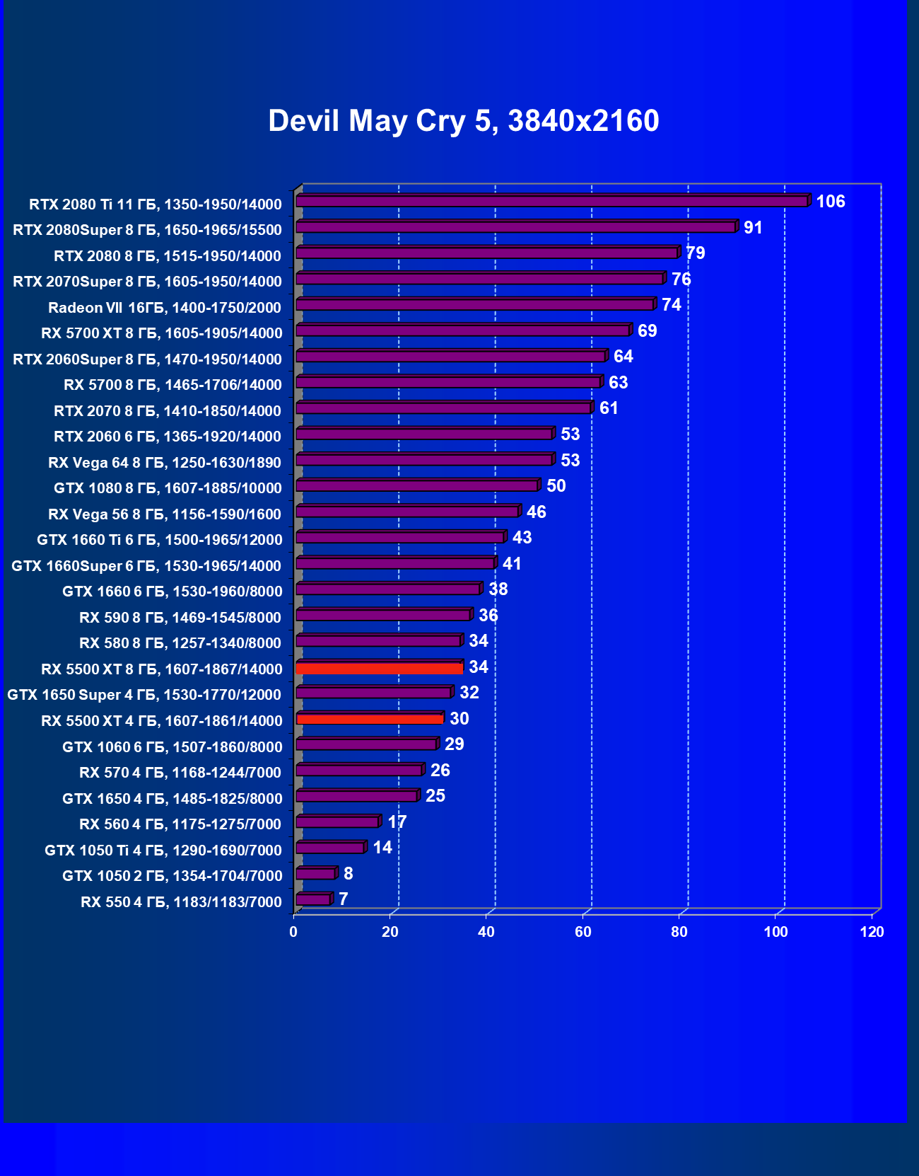 | 11 | RX 5500 XT 4 ГБ, 1607—1861/14000 | 326 | 420 | 12 900 |