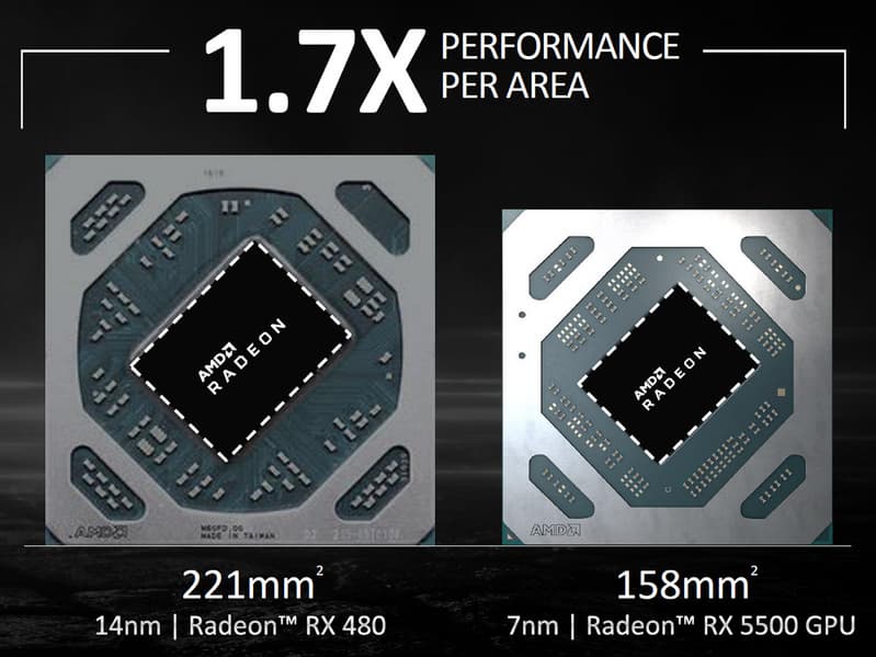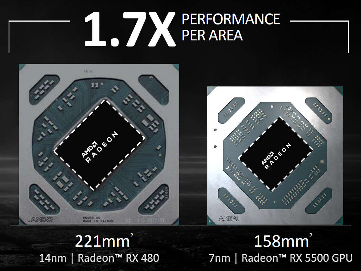 Если говорить о количестве транзисторов и площади чипов, то младший GPU получил на 38% меньше транзисторов, чем Navi 10. Площадь в 158 мм² также примерно на столько же (37%) меньше у Navi 14. С чипами семейства Polaris сравнивать особого смысла нет, новый GPU на 12% сложнее и при этом значительно меньше по площади — примерно на треть. Конечно же, благодарить за это нужно, прежде всего, техпроцесс TSMC 7 нм. Компания AMD перевела все свои CPU и GPU на один из самых современных и совершенных техпроцессов, получив некоторое преимущество, так как Nvidia до сих пор использует так называемый 12 нм (по сути, это улучшенный 16 нм) той же TSMC, что дает AMD возможность сэкономить на сложности чипов, позволяя снизить энергопотребление и повысить тактовые частоты.