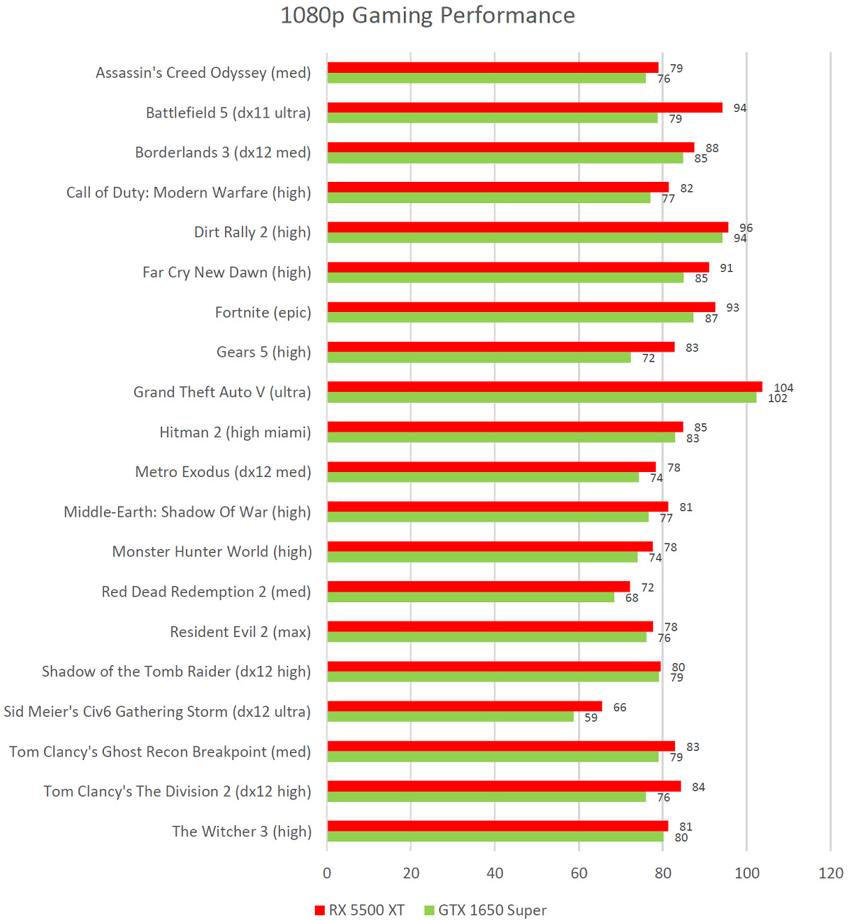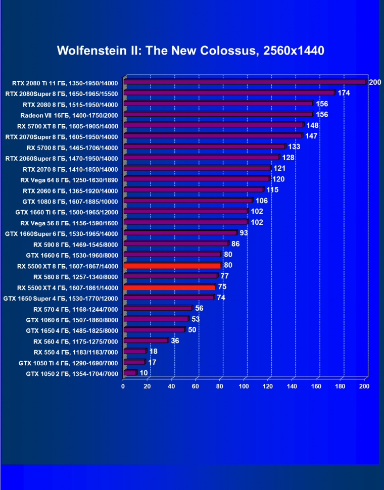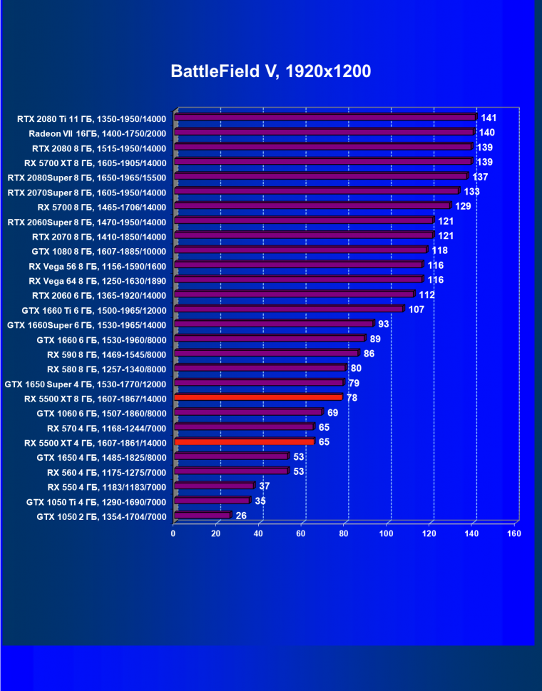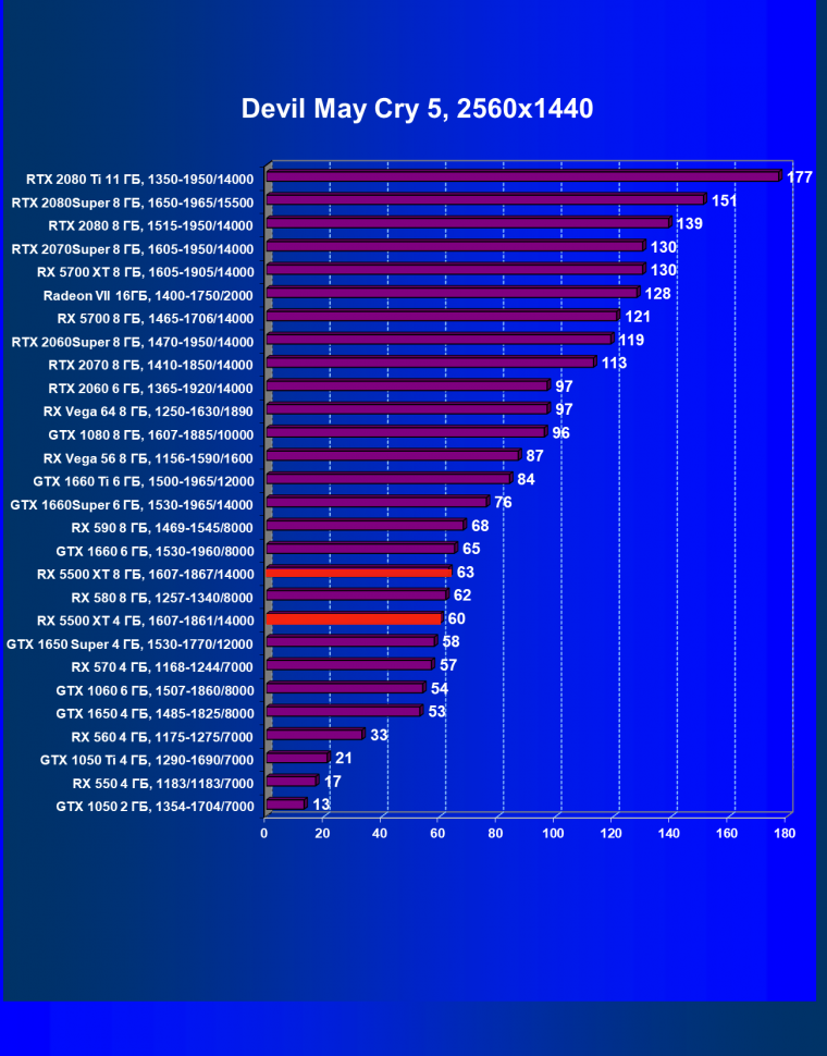 Прежде всего отметим, что даже у относительно бюджетных ускорителей даже в разрешении Full HD на производительности иногда сказывается разница в объеме памяти между 4 и 8 ГБ. То есть современные игры требуют все больше и больше видеопамяти, и 4 ГБ становится тем базовым объемом, меньше которого для игровых видеокарт иметь просто недопустимо (мы не говорим про самые бюджетные решения, сопоставимые по скорости с интегрированной графикой). Хорошо видно, что старшая версия RX 5500 XT (с 8 ГБ памяти) обошла предшественника в лице RX 580 и лишь немного не дотянула по производительности до GTX 1660. Версия RX 5500 XT c 4 ГБ памяти показала результат в среднем идентичный своему конкуренту в лице GTX 1650 Super, заняв в рейтинге место под RX 580.