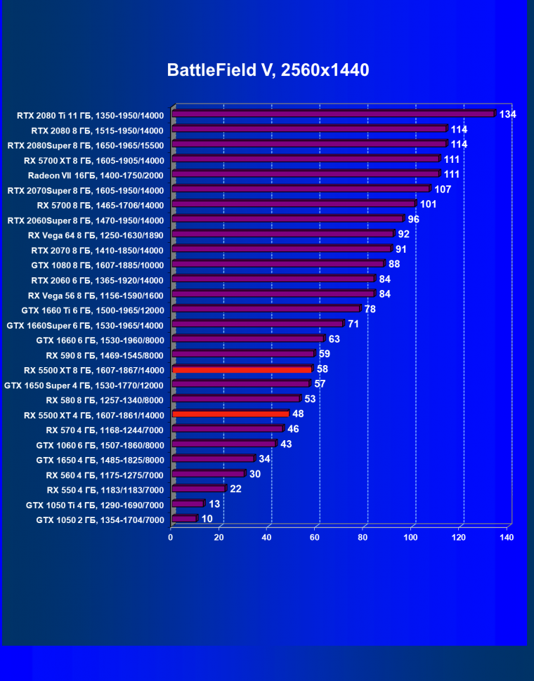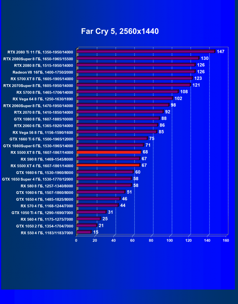 | 13 | RX 5500 XT 8 ГБ, 1607—1867/14000 | 310 | 450 | 14 500 |