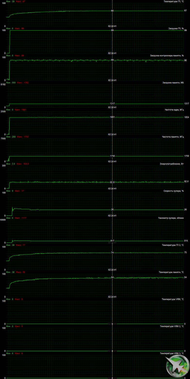 После 6-часового прогона под нагрузкой максимальная температура ядра не превысила 67 градусов, что является очень хорошим результатом для видеокарт такого уровня.