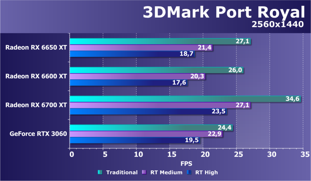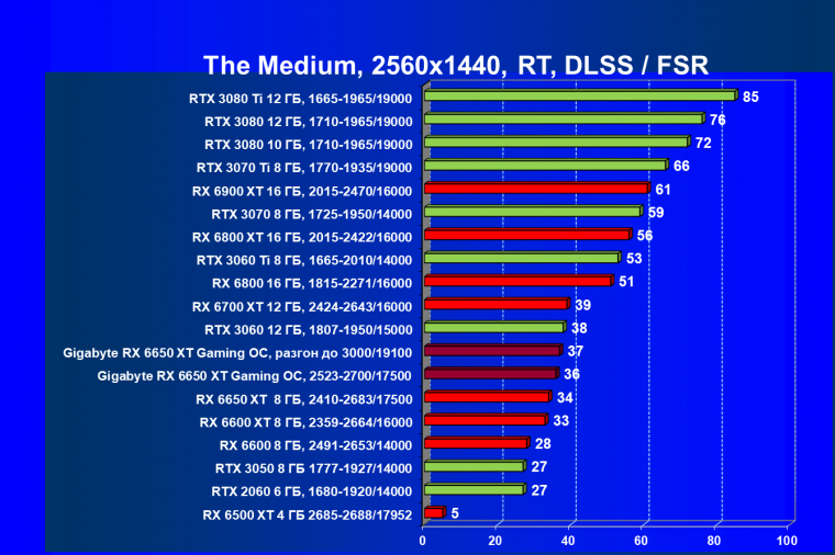 В целом AMD Radeon RX 6650 XT (как и его предшественник Radeon RX 6600 XT) продемонстрировал свою принадлежность к числу ускорителей среднего уровня, конкурируя с GeForce RTX 3060/Ti и показывая промежуточный между ними результат (ближе к GeForce RTX 3060 Ti). В играх с трассировкой лучей без поддержки FSR новый Radeon RX 6650 XT демонстрирует производительность лишь на уровне GeForce RTX 3050, однако сейчас уже много игр имеют поддержку AMD FSR, что позволяет в значительной мере компенсировать потери от включения RT. Поэтому в целом даже в играх с трассировкой лучей новый ускоритель соответствует уровню GeForce RTX 3060. Основным отличием Radeon RX 6650 XT от Radeon RX 6600 XT является использование более быстрой памяти, а частота работы ядра у Radeon RX 6650 XT повышена незначительно. Заметного прироста производительности нововведения не обеспечивают, потому присвоение обновленным картам промежуточного номера (6x50) абсолютно оправдано.