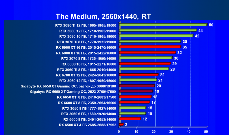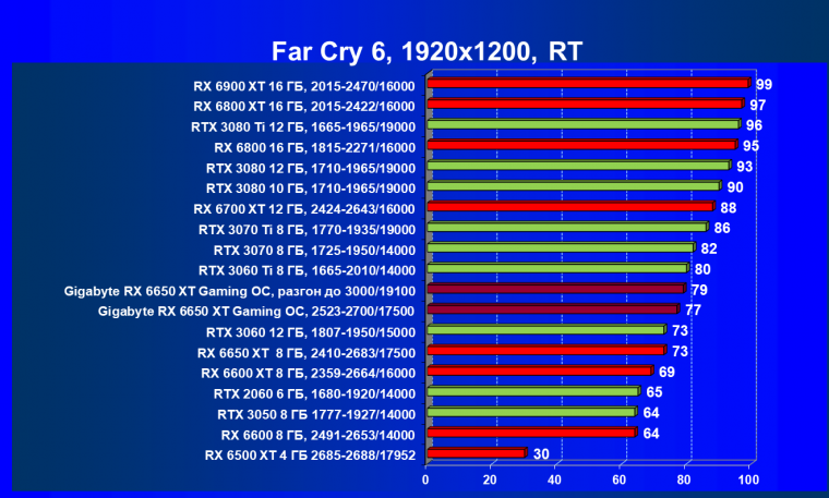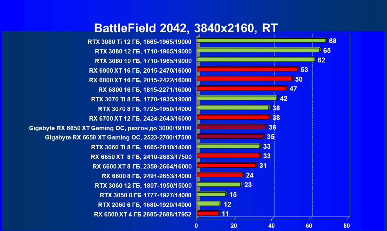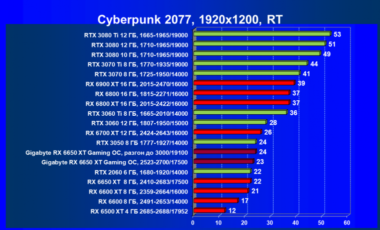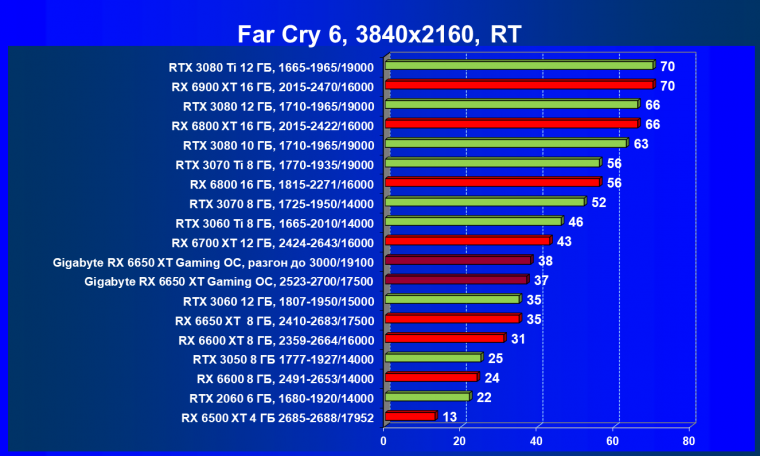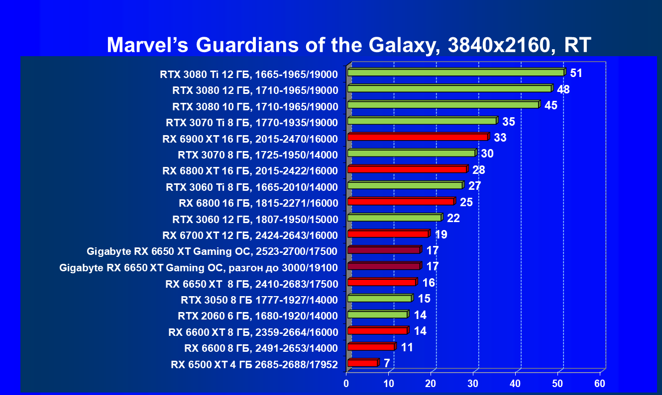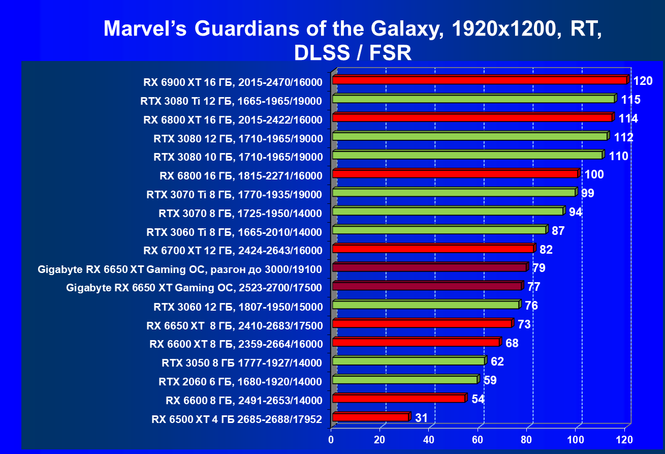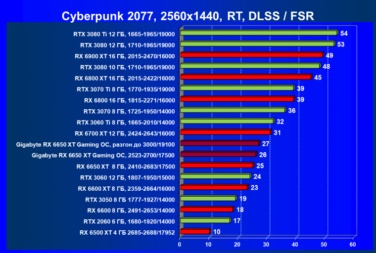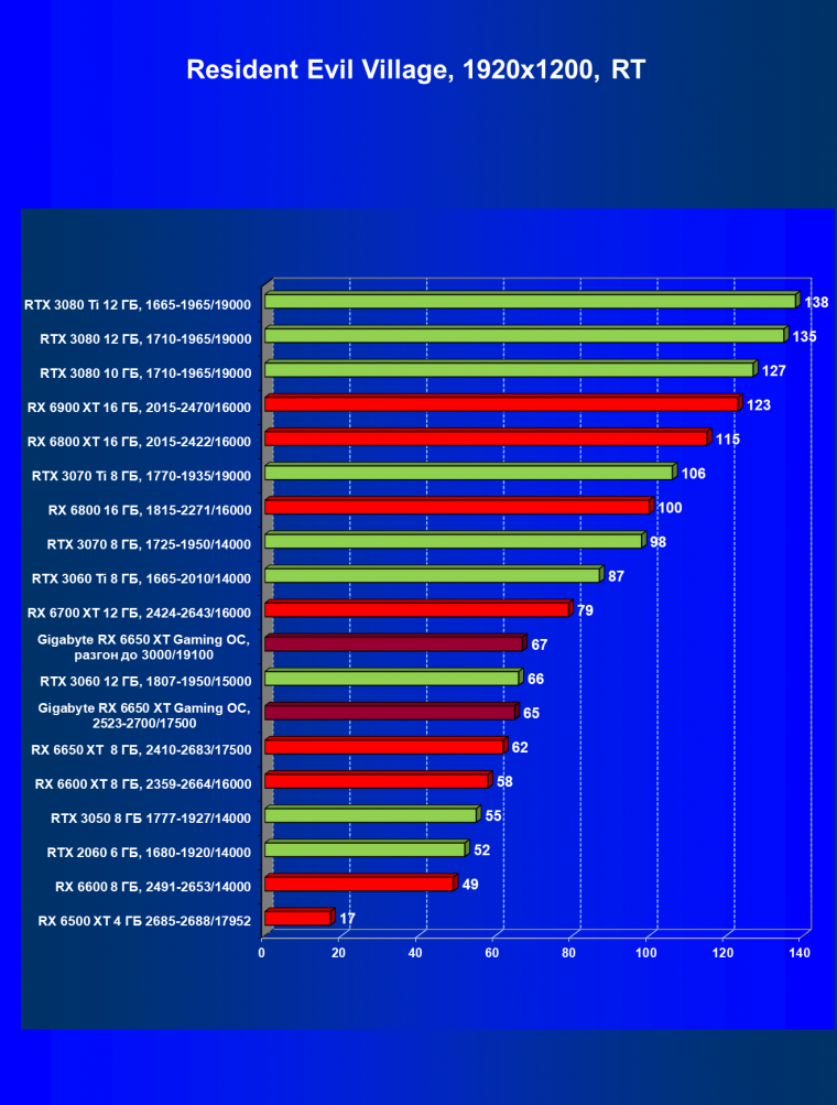 При задействовании трассировки лучей расклад сил поменялся весьма незначительно: GeForce RTX 3060 Ti смог чуть-чуть опередить базовый Radeon RX 6650 XT, однако карта Gigabyte сохранила лидерство в группе, а с разгоном — и в общем зачете.
