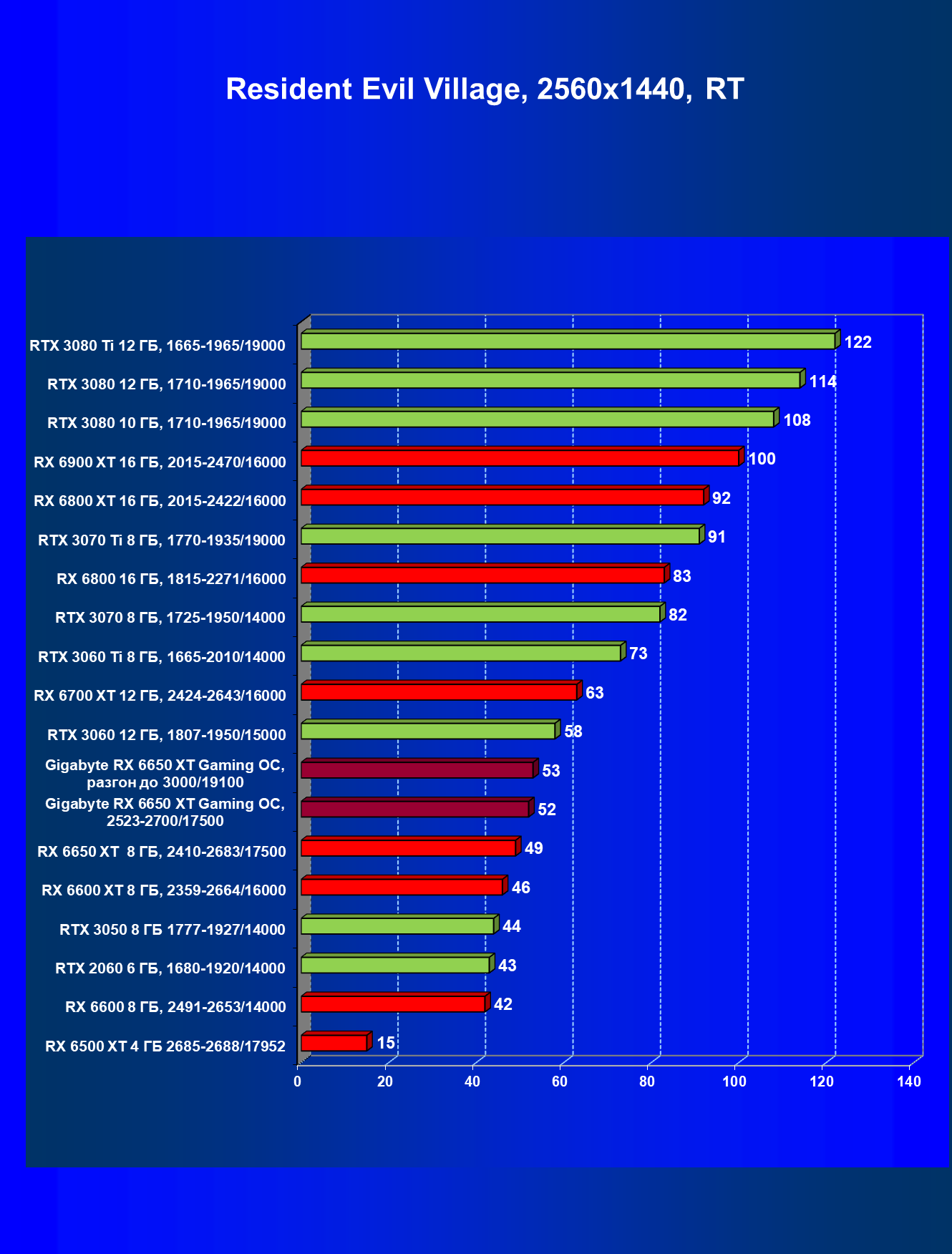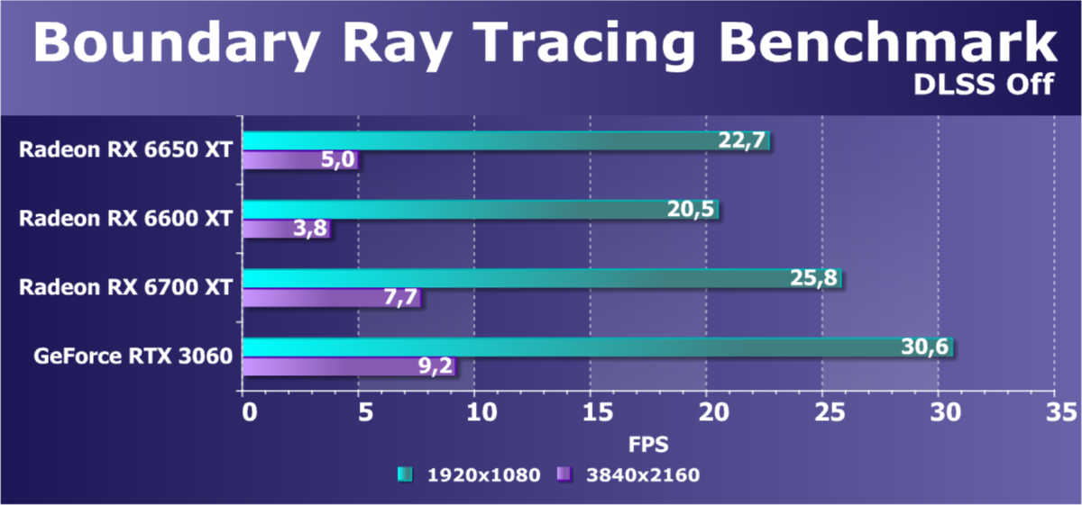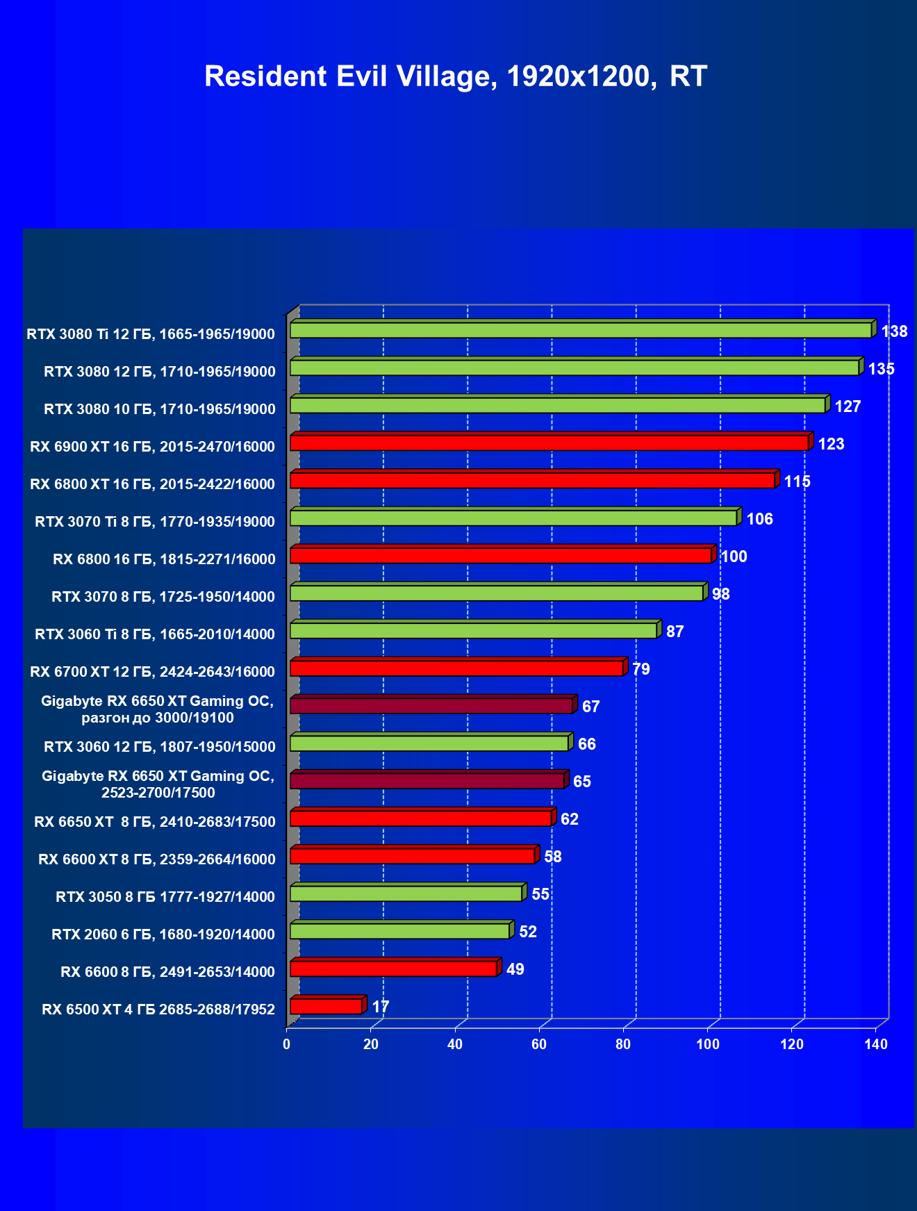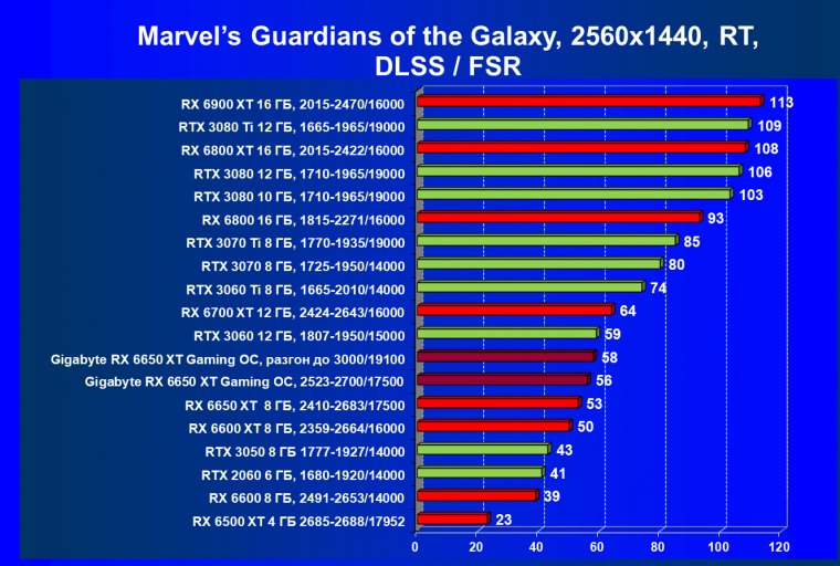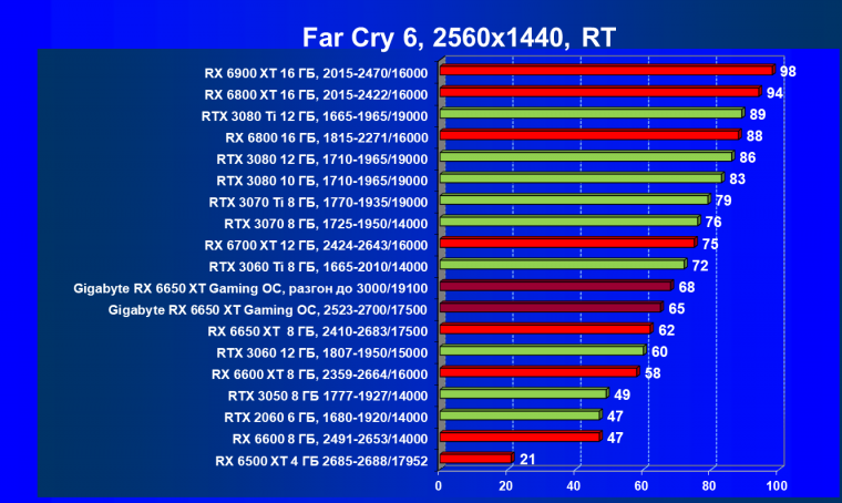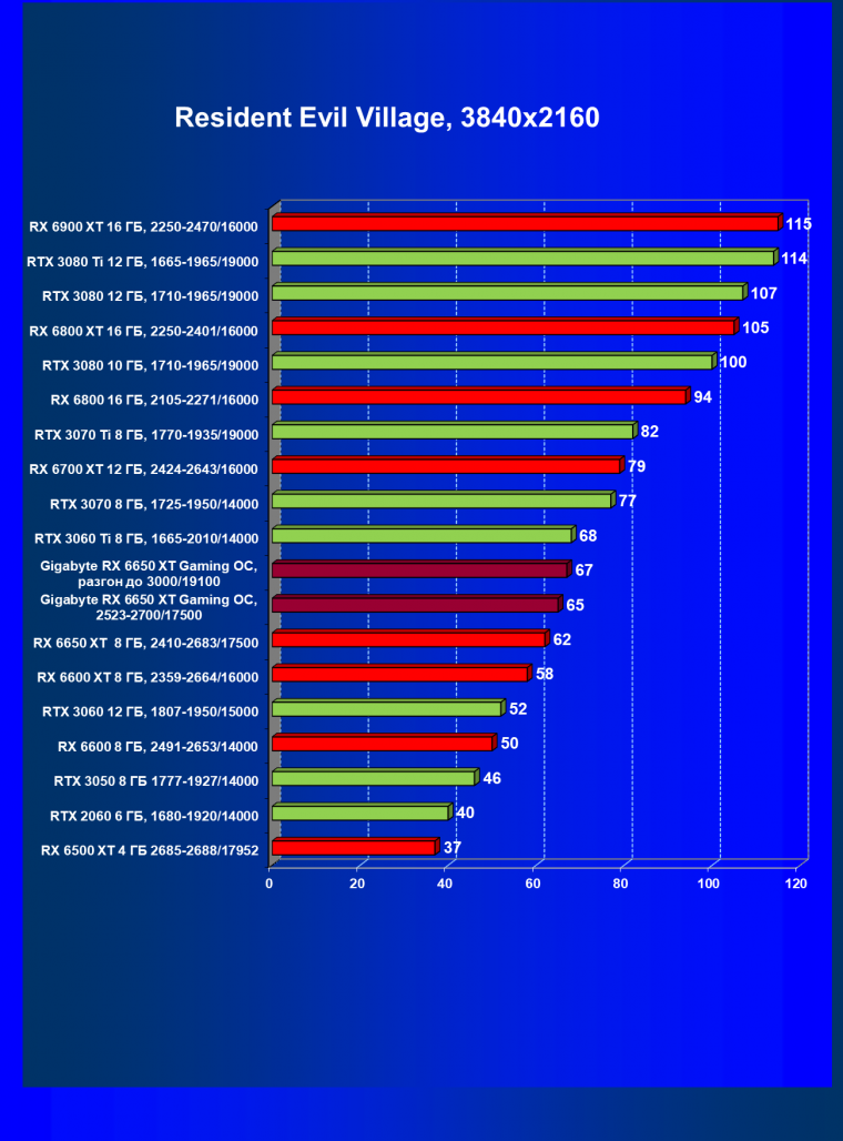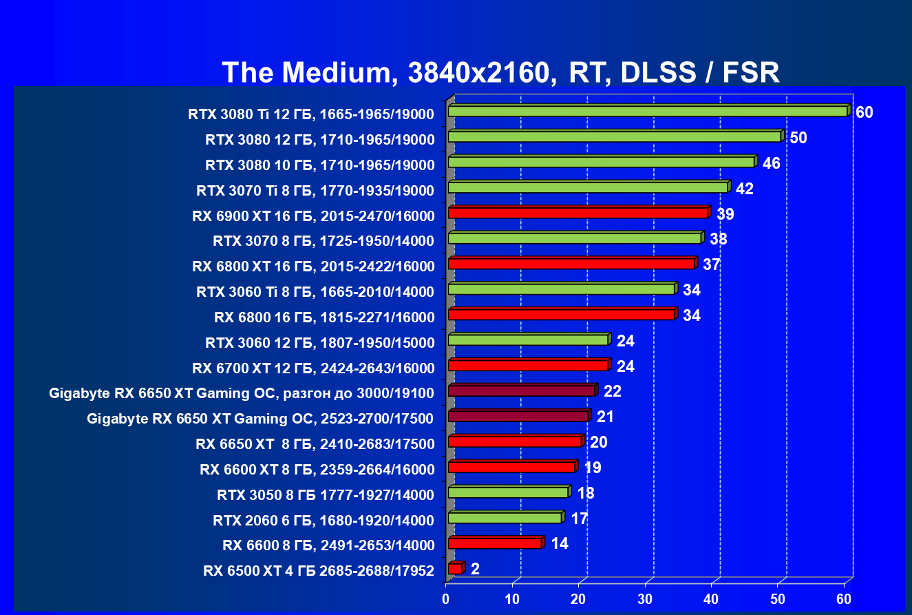 При задействовании трассировки лучей расклад сил поменялся весьма незначительно: GeForce RTX 3060 Ti смог чуть-чуть опередить базовый Radeon RX 6650 XT, однако карта Gigabyte сохранила лидерство в группе, а с разгоном — и в общем зачете.