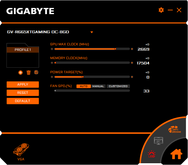- по умолчанию (лимит потребления снижен до 70%, частота GPU снижена на 200 МГц, частота памяти по умолчанию, вентиляторы выставлены в ручном режиме на 70%)