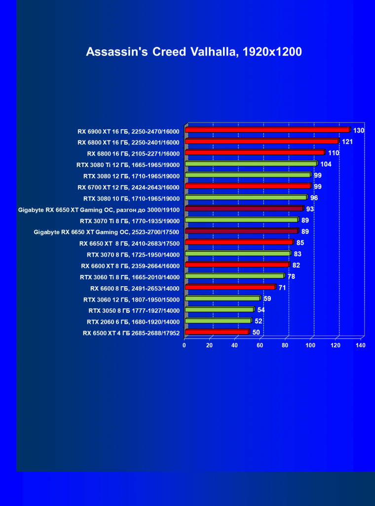 | 13 | RX 6650 XT 8 ГБ, 2523—2683/17500 | 230 | 46 | 50 000 |