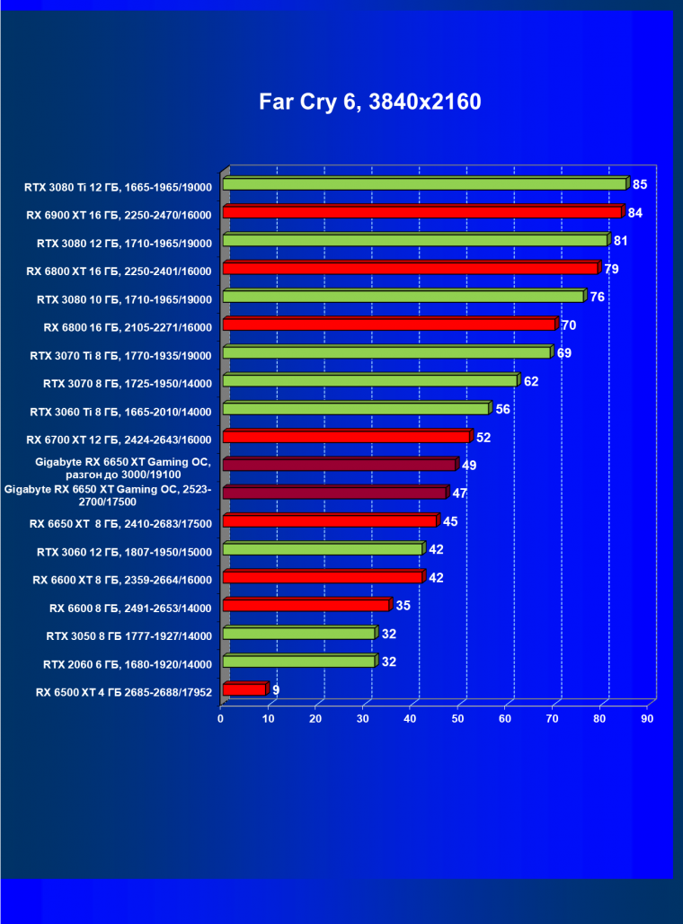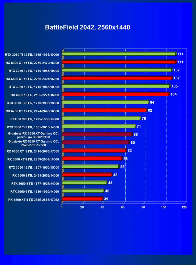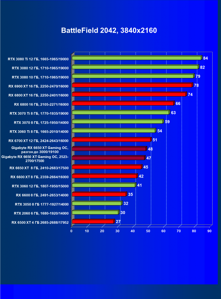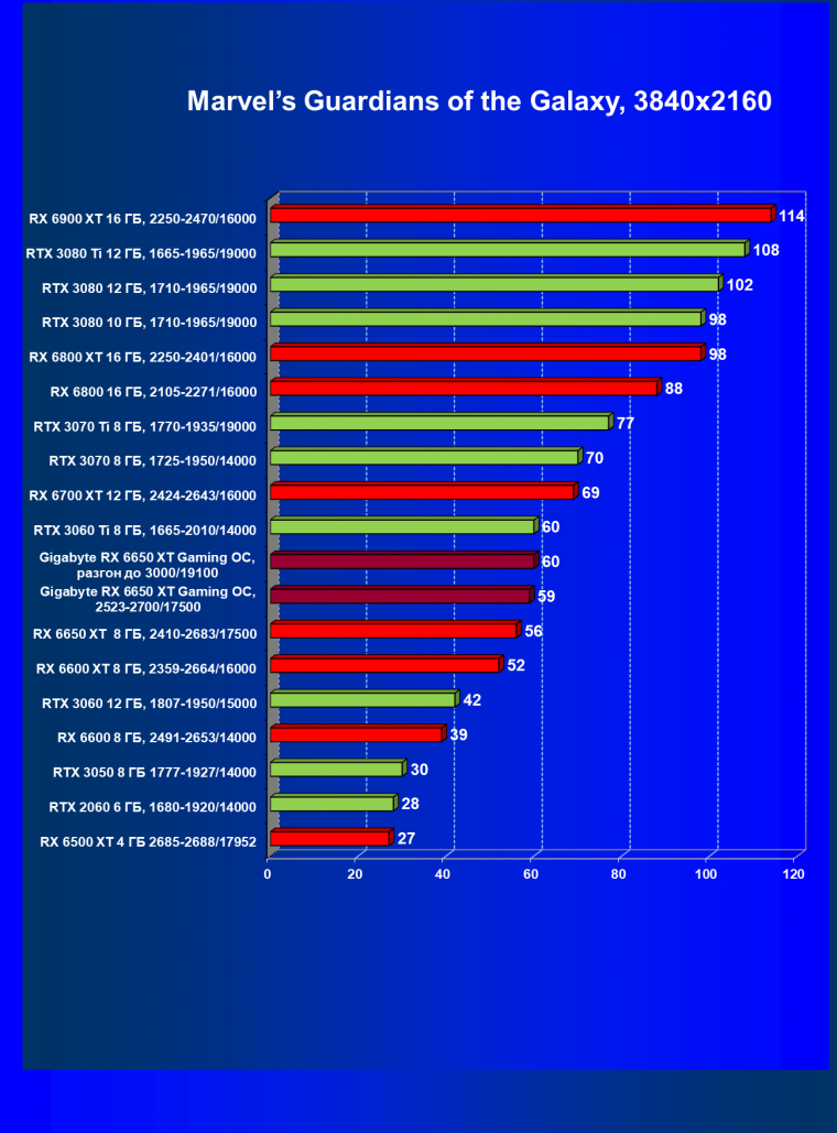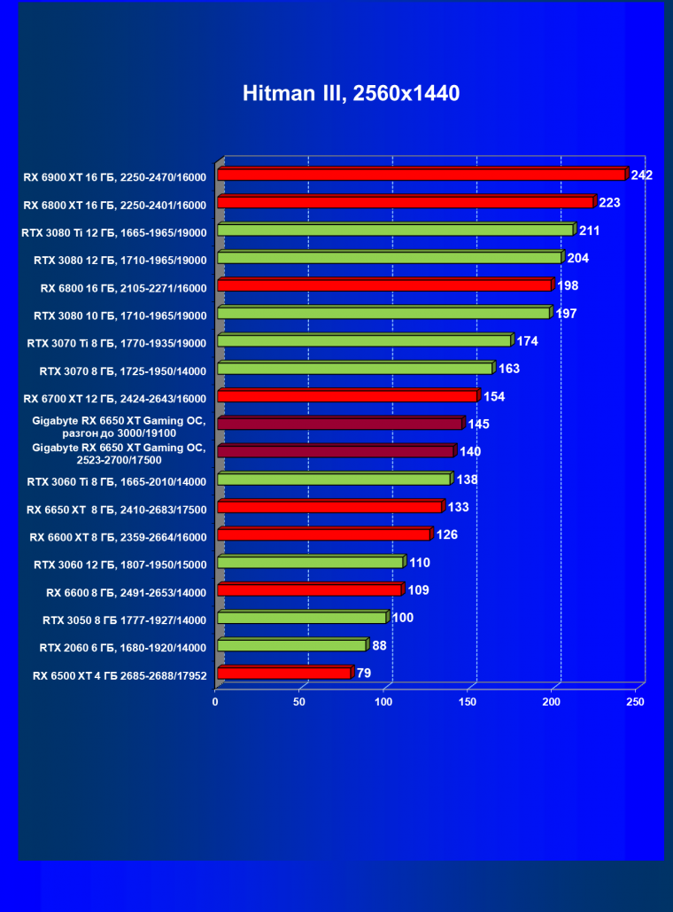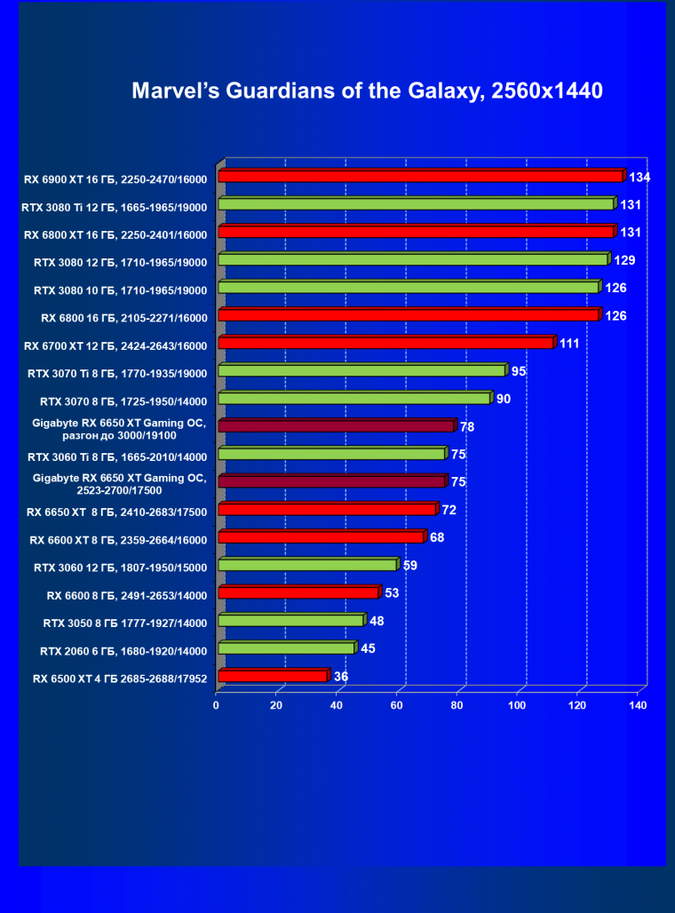| 04 | Gigabyte RX 6650 XT Gaming OC, 2523—2700/17500 | 47 | 240 | 51 000 |