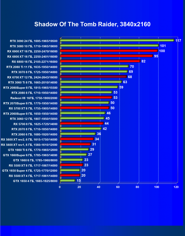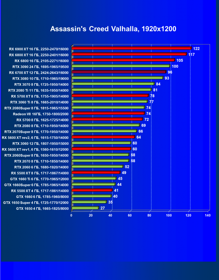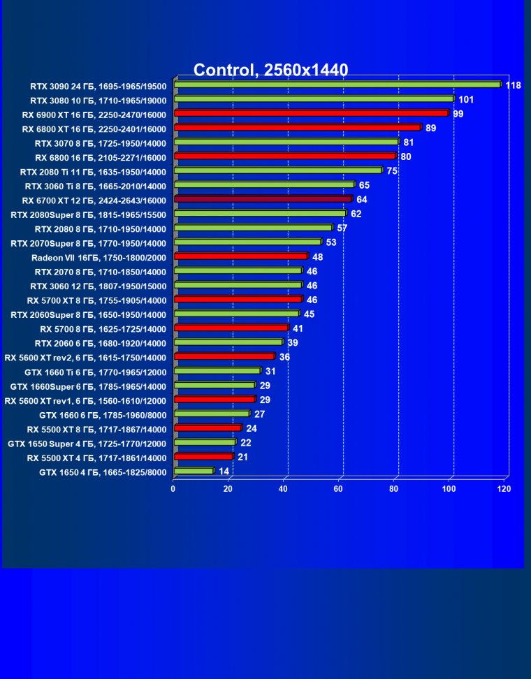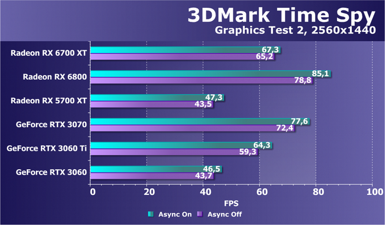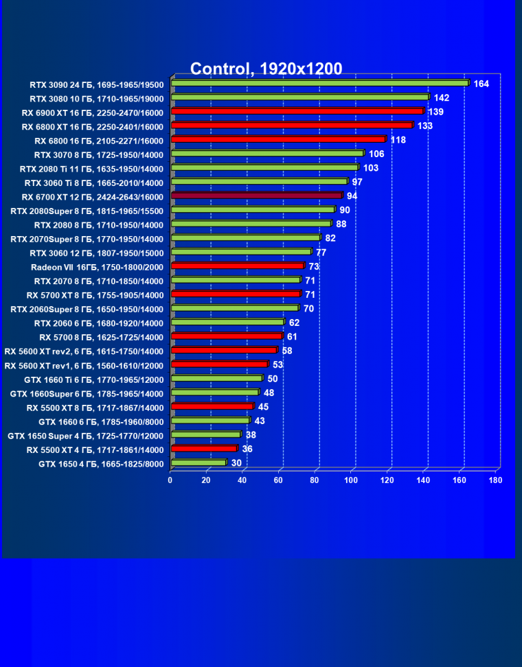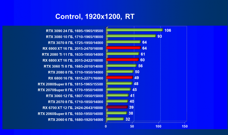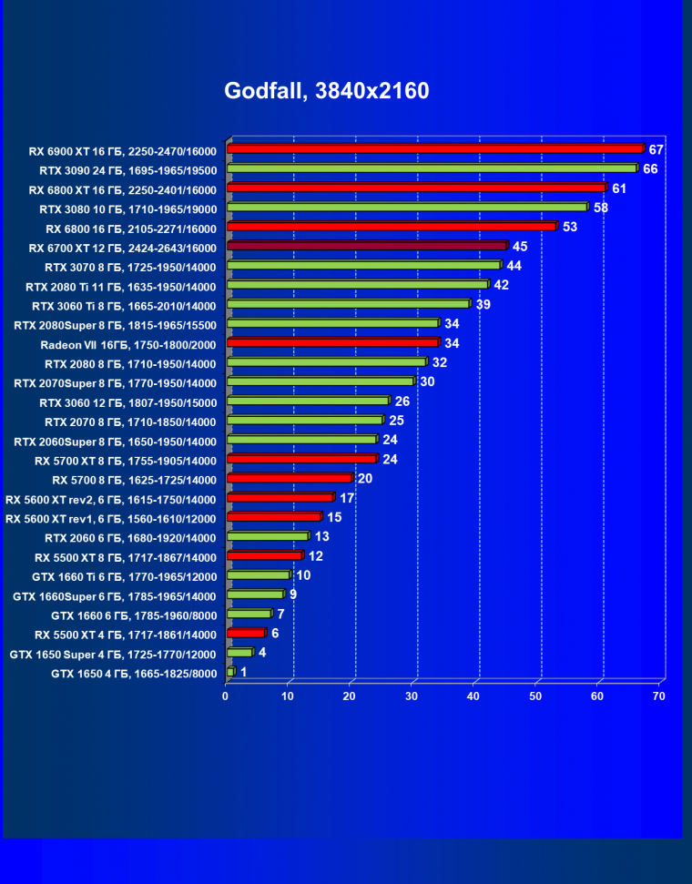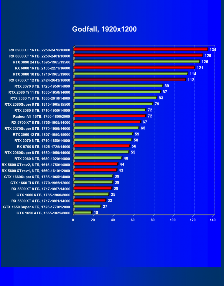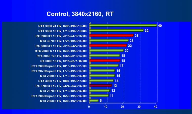 В целом Radeon RX 6700 XT оказался где-то между GeForce RTX 3070 и GeForce RTX 3060 Ti: точнее говоря, в ряде игр и разрешений он поднимался выше GeForce RTX 3070, но иногда падал даже ниже GeForce RTX 3060 Ti. Сейчас в игровых тестах соотношение сил иногда оказывается существенно различным в зависимости от поддержки AMD и/или Nvidia разработчиков этой игры.