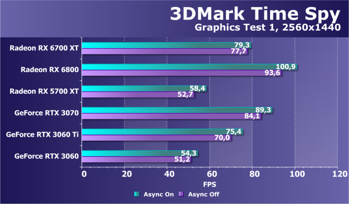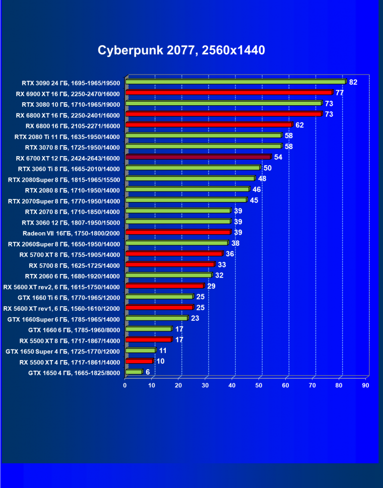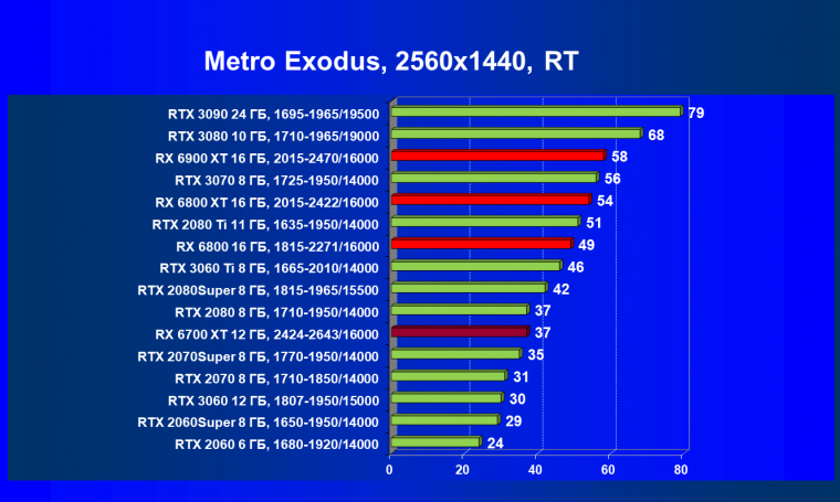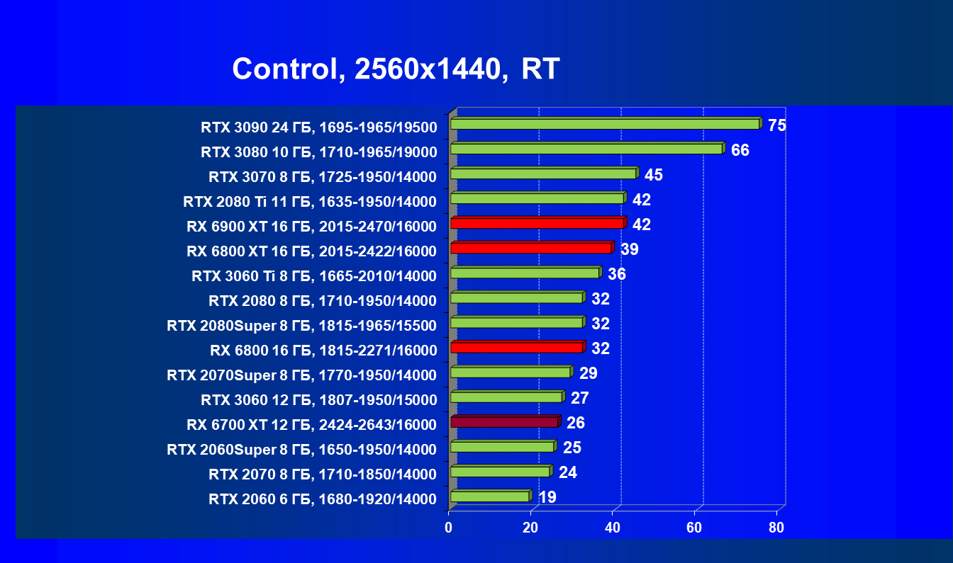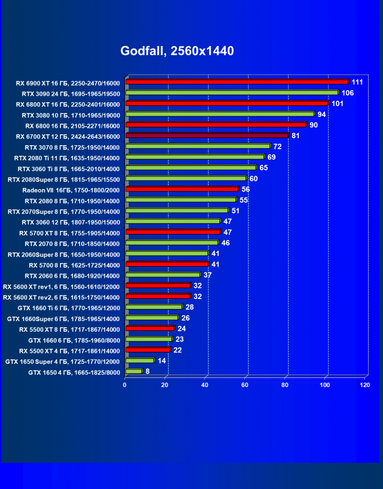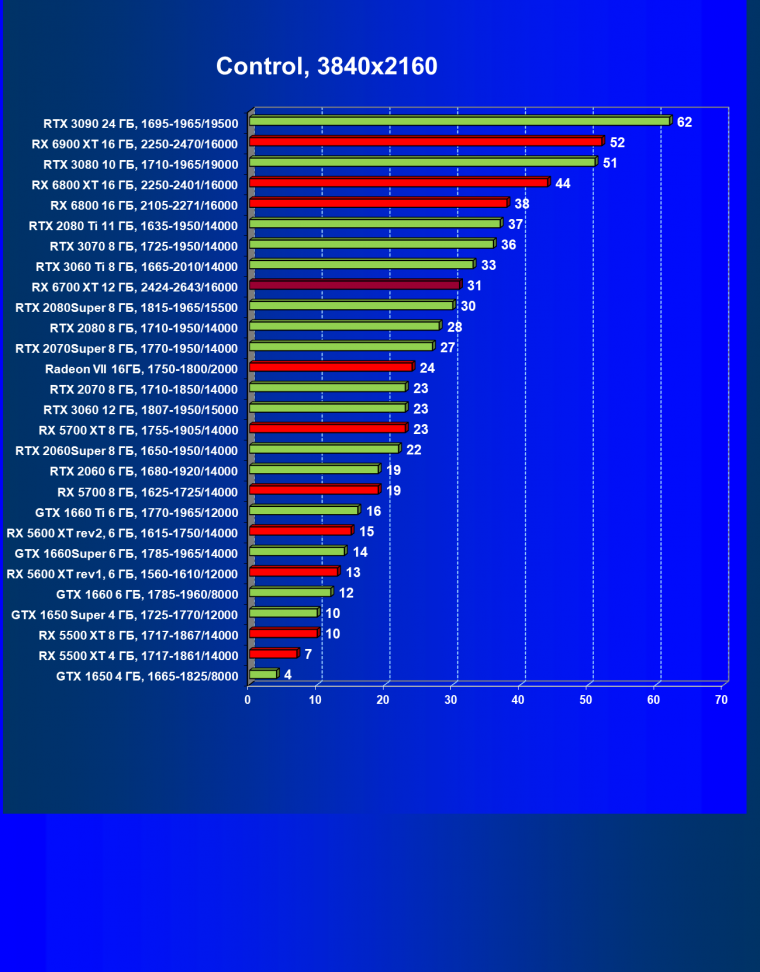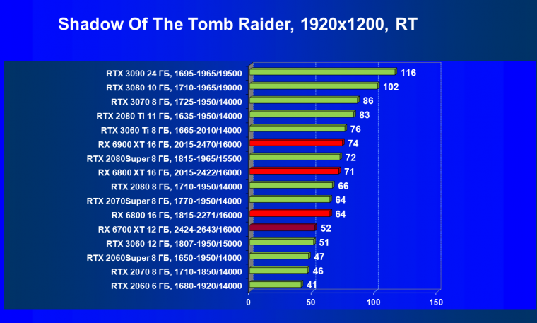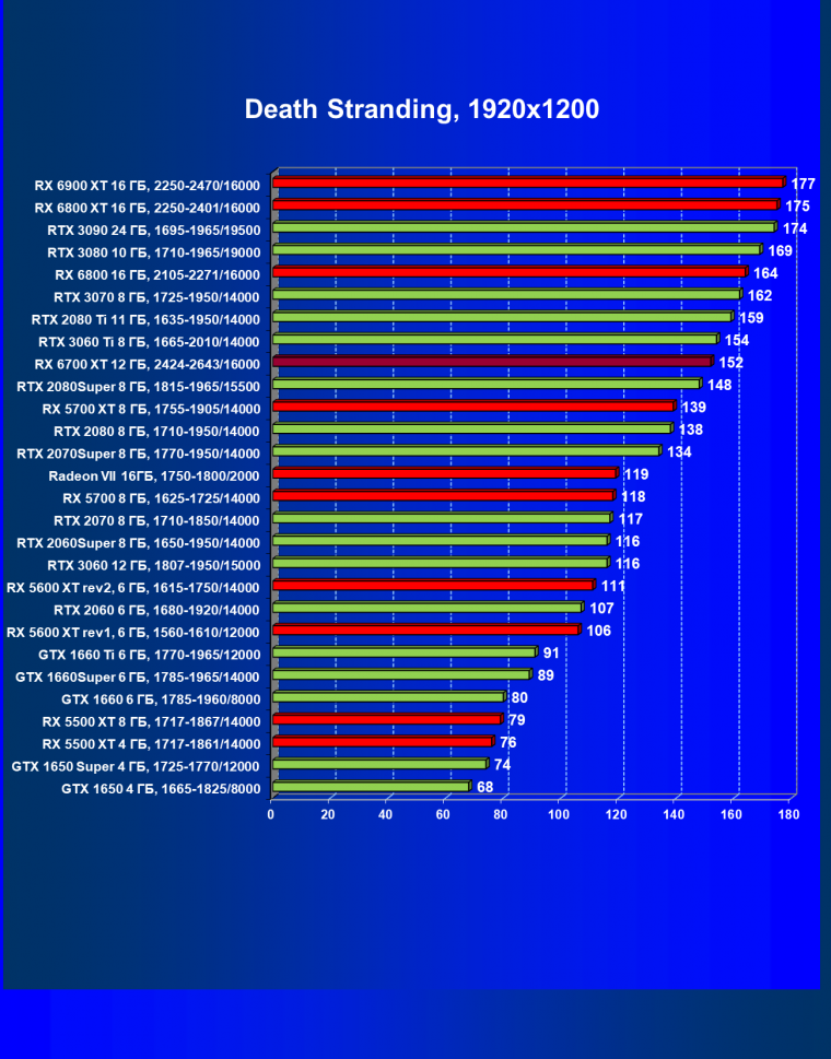 В целом Radeon RX 6700 XT оказался где-то между GeForce RTX 3070 и GeForce RTX 3060 Ti: точнее говоря, в ряде игр и разрешений он поднимался выше GeForce RTX 3070, но иногда падал даже ниже GeForce RTX 3060 Ti. Сейчас в игровых тестах соотношение сил иногда оказывается существенно различным в зависимости от поддержки AMD и/или Nvidia разработчиков этой игры.
