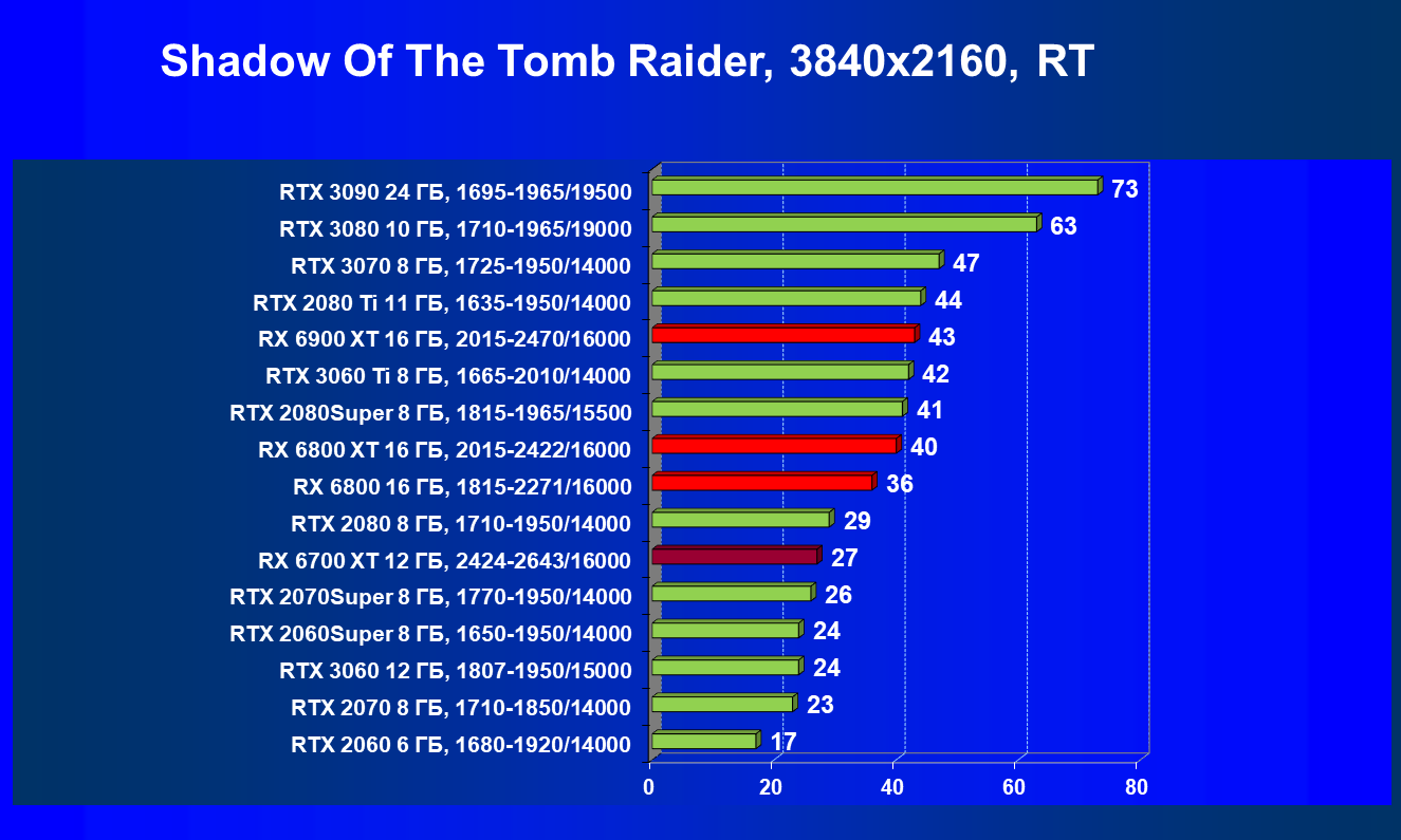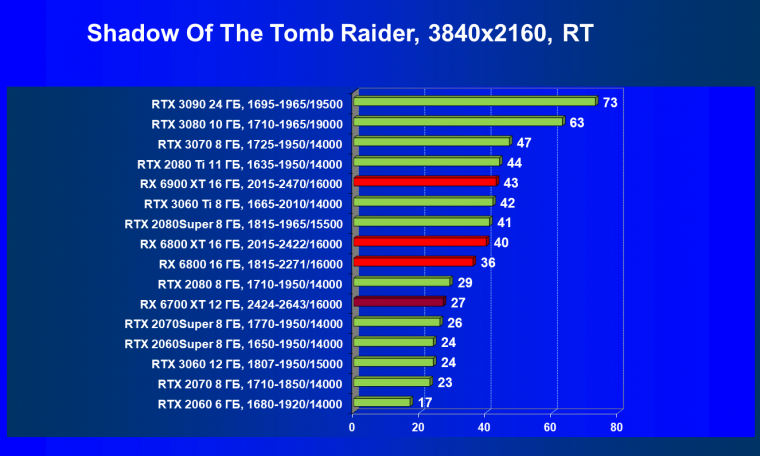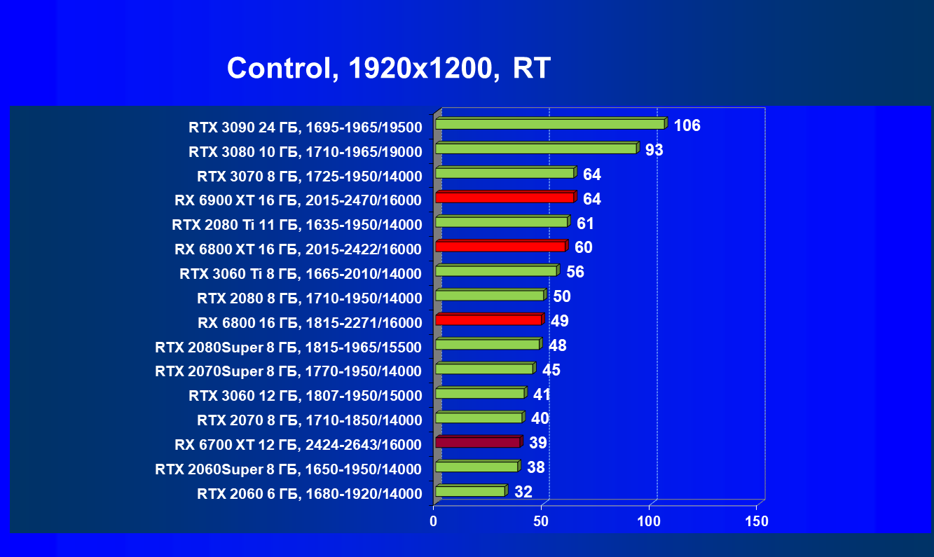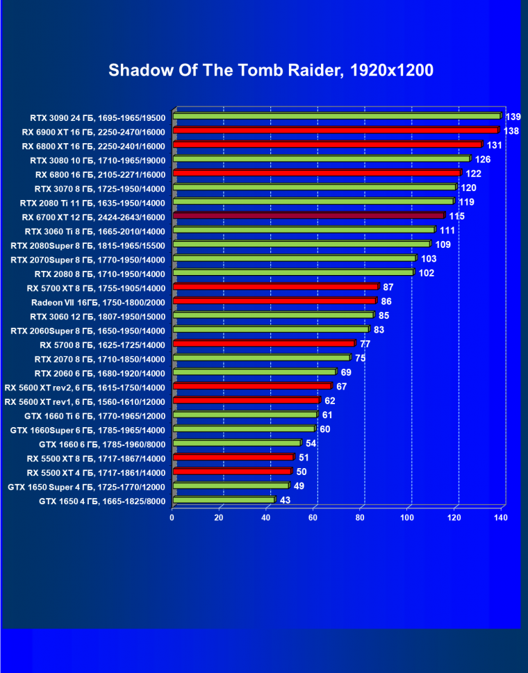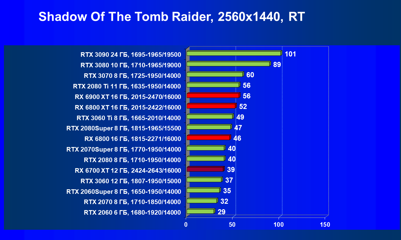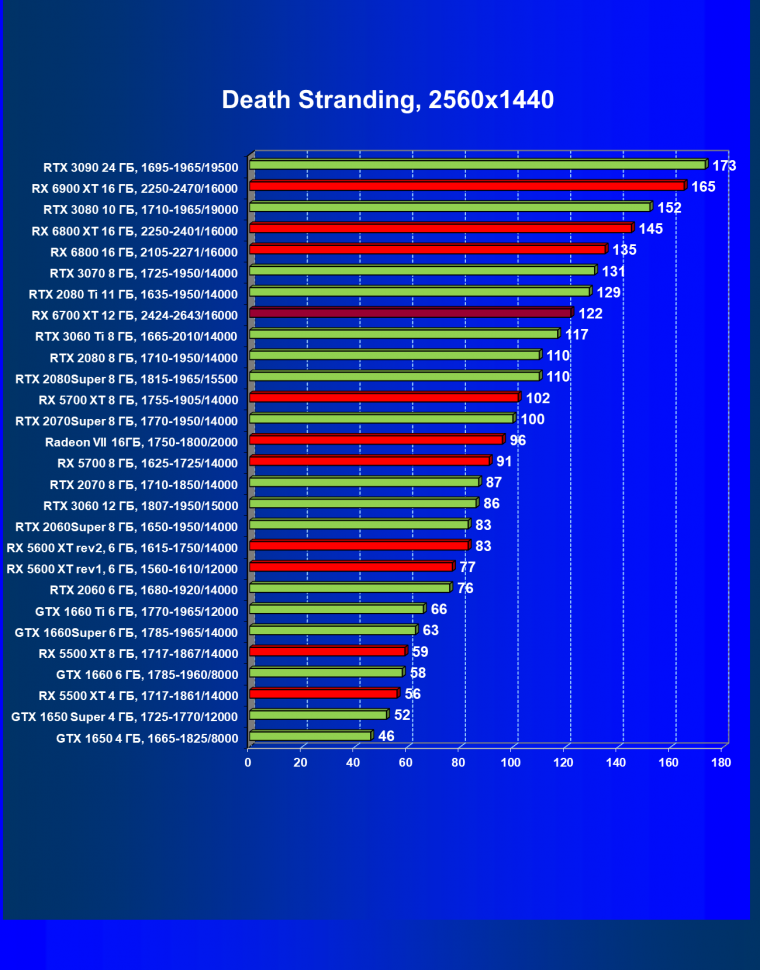 В целом Radeon RX 6700 XT оказался где-то между GeForce RTX 3070 и GeForce RTX 3060 Ti: точнее говоря, в ряде игр и разрешений он поднимался выше GeForce RTX 3070, но иногда падал даже ниже GeForce RTX 3060 Ti. Сейчас в игровых тестах соотношение сил иногда оказывается существенно различным в зависимости от поддержки AMD и/или Nvidia разработчиков этой игры.