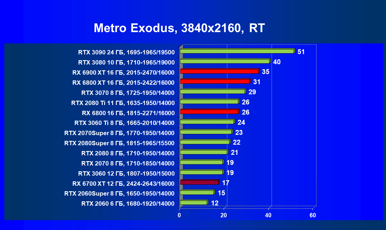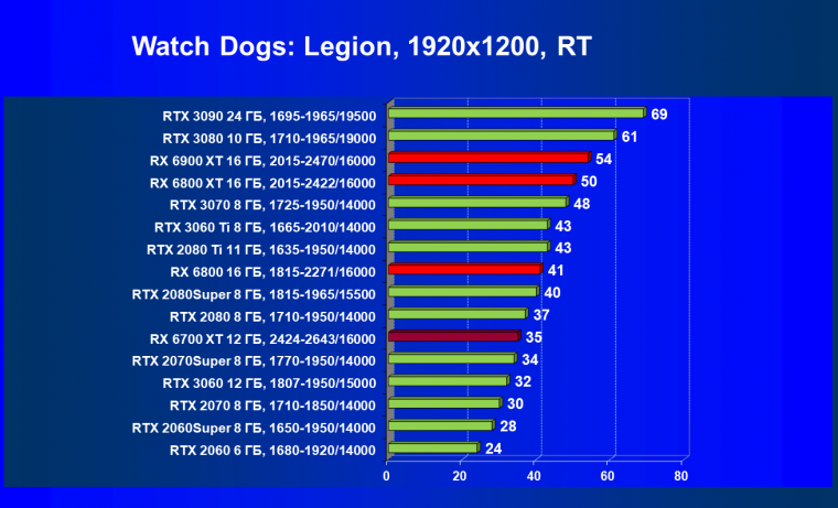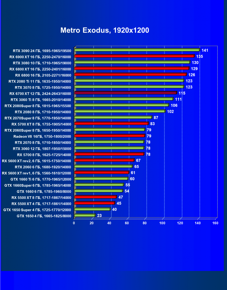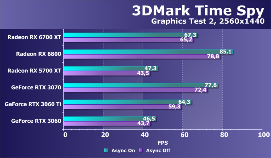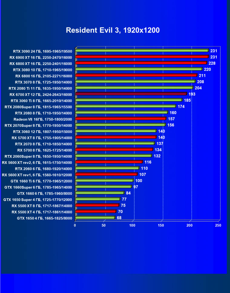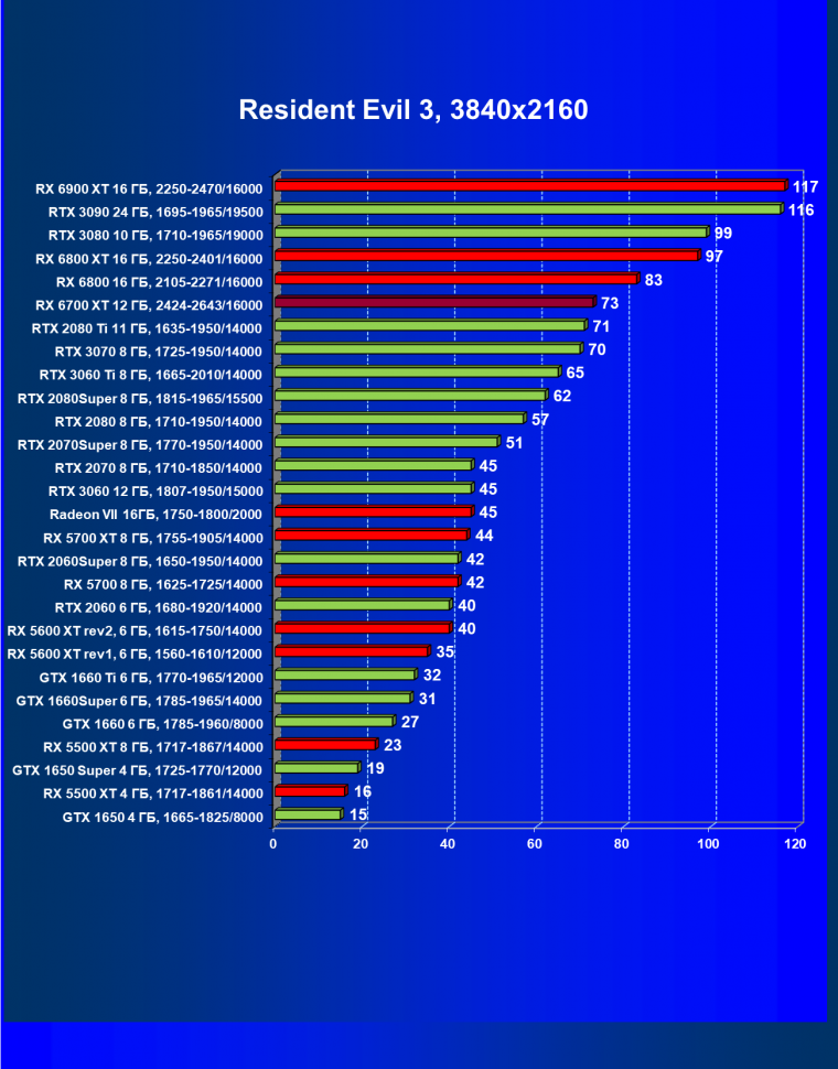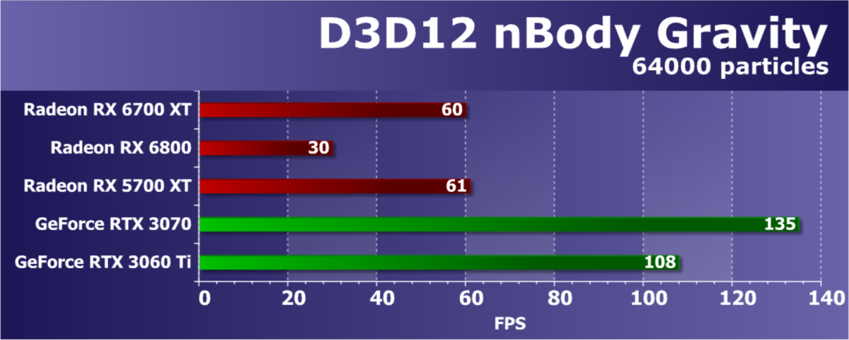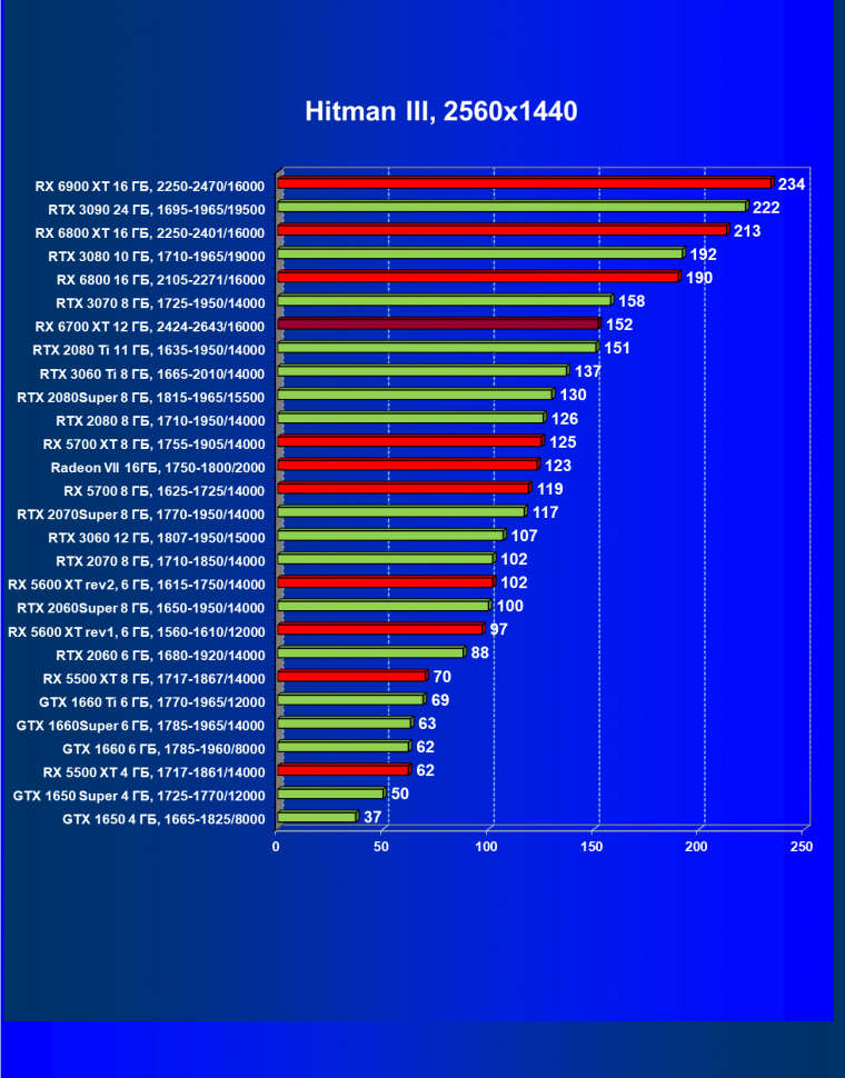 В целом Radeon RX 6700 XT оказался где-то между GeForce RTX 3070 и GeForce RTX 3060 Ti: точнее говоря, в ряде игр и разрешений он поднимался выше GeForce RTX 3070, но иногда падал даже ниже GeForce RTX 3060 Ti. Сейчас в игровых тестах соотношение сил иногда оказывается существенно различным в зависимости от поддержки AMD и/или Nvidia разработчиков этой игры.