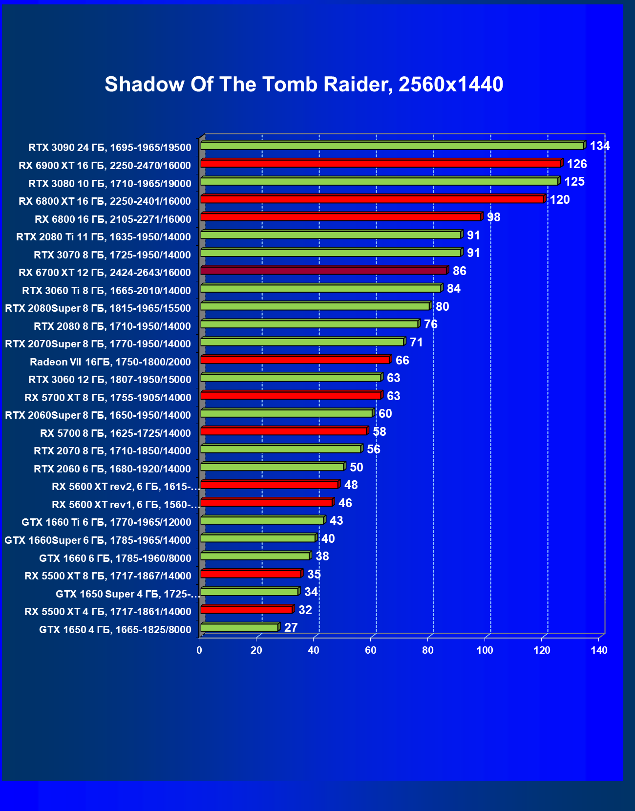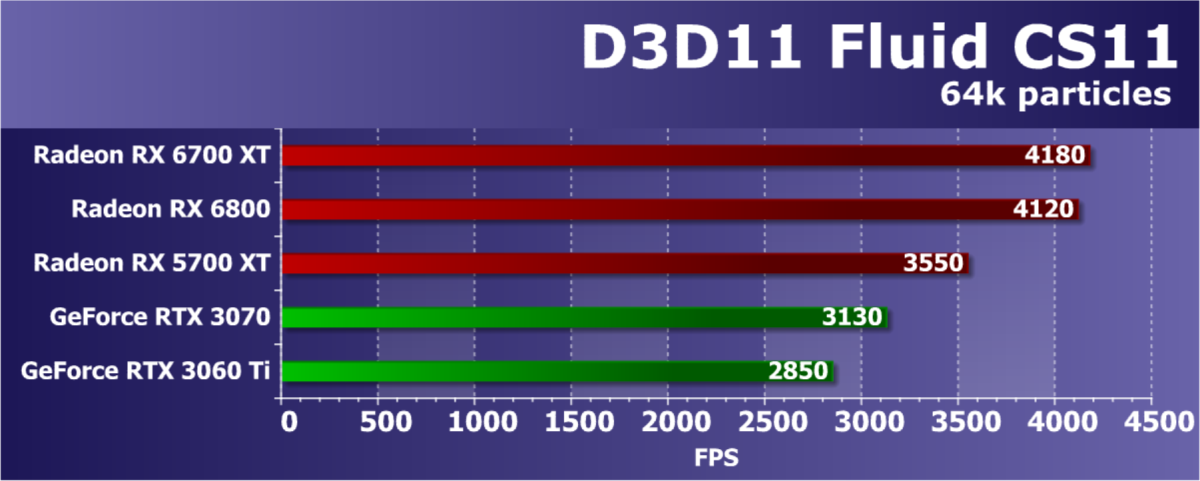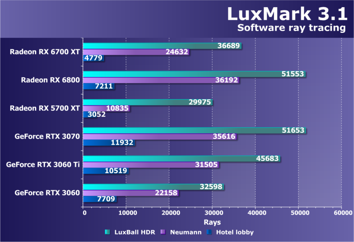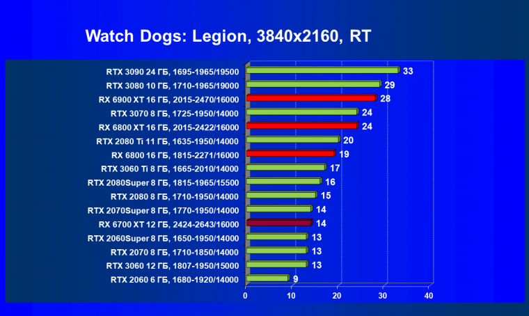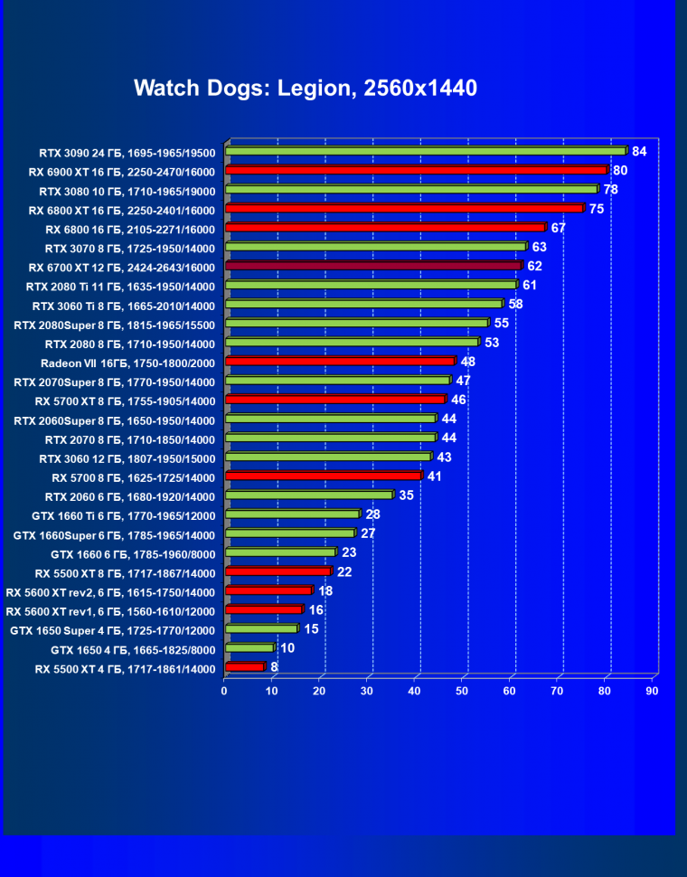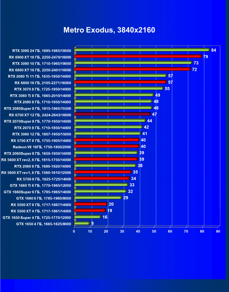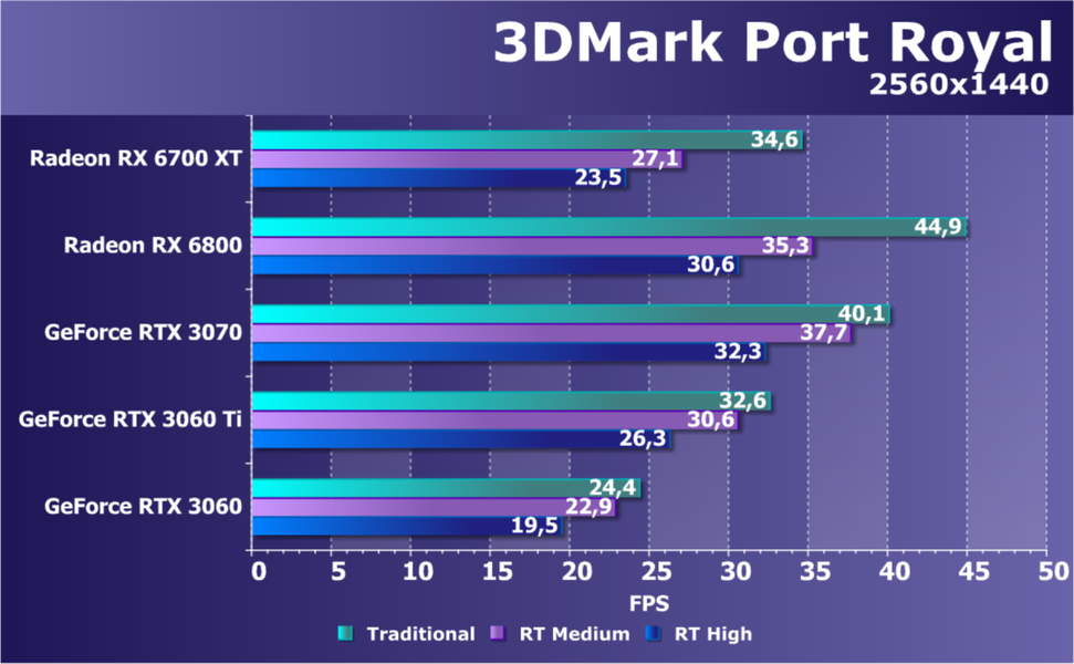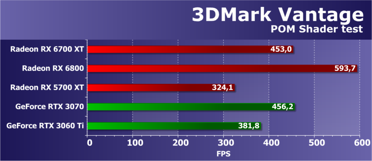 В целом Radeon RX 6700 XT оказался где-то между GeForce RTX 3070 и GeForce RTX 3060 Ti: точнее говоря, в ряде игр и разрешений он поднимался выше GeForce RTX 3070, но иногда падал даже ниже GeForce RTX 3060 Ti. Сейчас в игровых тестах соотношение сил иногда оказывается существенно различным в зависимости от поддержки AMD и/или Nvidia разработчиков этой игры.