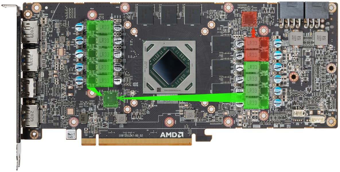 В итоге, новый графический процессор Navi 22 и видеокарта на его основе смотрится как разделенные ровно напополам почти по всем блокам чип Navi 21 и Radeon RX 6900 XT, соответственно. Почти, так как для сохранения эффективности кэширования данных объем Infinity Cache было решено поставить в 96 МБ, что немногим меньше 128 МБ — видимо, 64 МБ было бы слишком мало для компенсации сравнительно низкой пропускной способности GDDR6. Новинка должна быть не вдвое медленнее модели Radeon RX 6900 XT еще и из-за более высоких частот GPU у младшей модели.