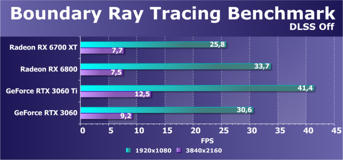 Поскольку ранее выпущенные видеокарты AMD не поддерживают технологии трассировки лучей, а также у них нет поддержки «умных» технологий антиалиасинга типа Nvidia DLSS, мы вынуждены для массового тестирования отключать как трассировку, так и DLSS для адекватного сравнения всех карт. Однако на сегодня уже половина из 28 регулярно тестируемых нами видеокарт поддерживает технологию RT, поэтому мы провели тесты не только с использованием обычных методов растеризации, но и с включением RT. Разумеется, пока в этом списке только видеокарты Nvidia серии GeForce RTX и AMD Radeon RX 6000.
