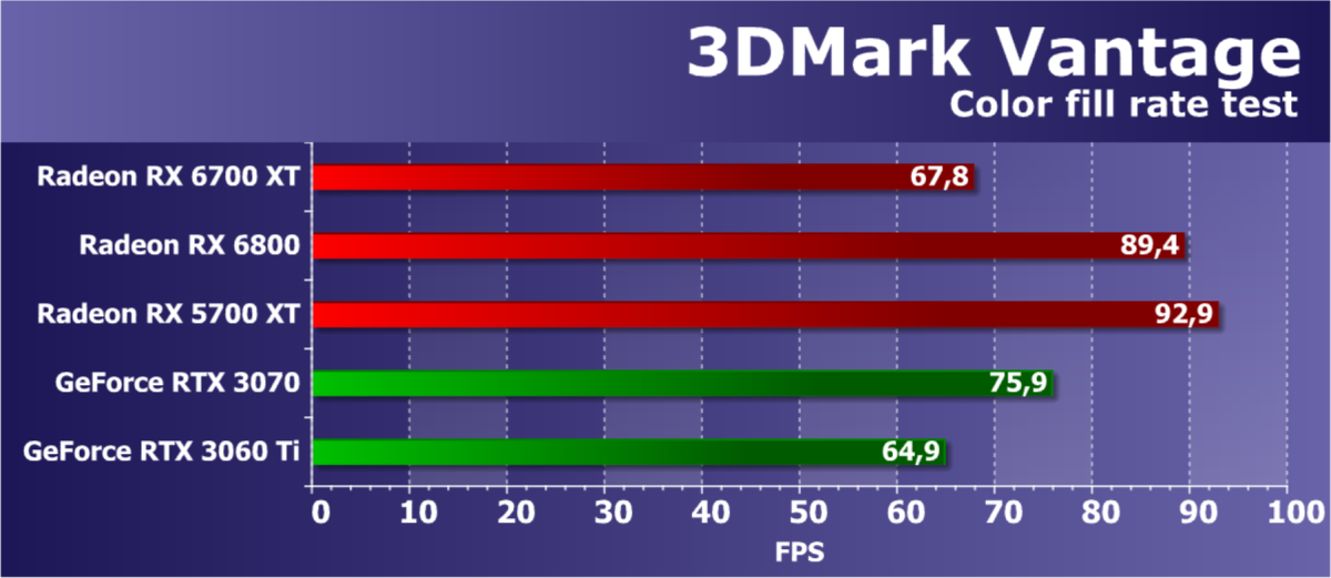 Мы полностью отказались от ранее активно использовавшихся нами тестов RightMark3D, так как они устарели слишком сильно, и на столь мощных GPU или не запускаются вообще, или упираются в различные ограничители, не загружая работой блоки графического процессора и не показывая его истинную производительность. А вот синтетические Feature-тесты из набора 3DMark Vantage мы все еще оставили в полном составе, так как заменить их попросту нечем, хотя и они уже изрядно устарели.