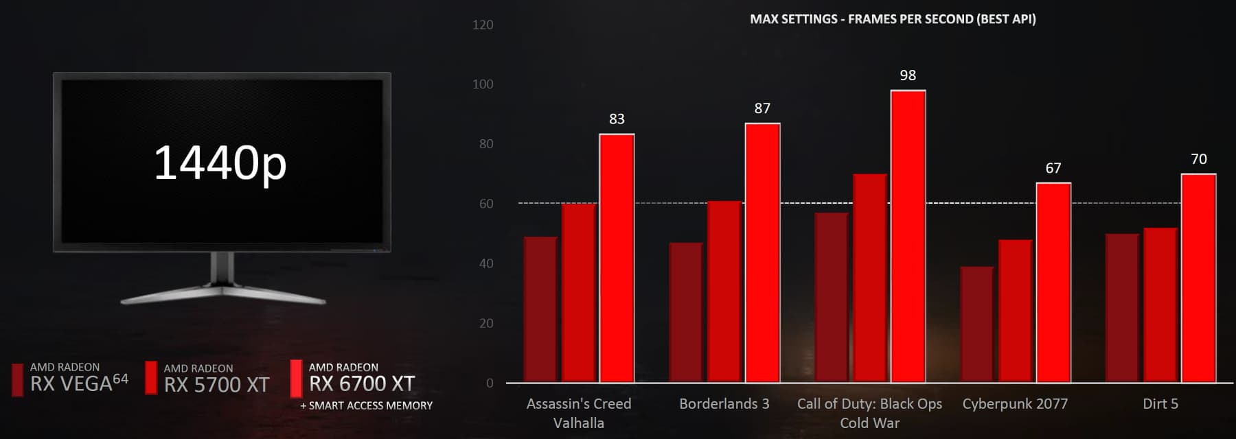 Видеокарта Radeon RX 6700 XT является самым недорогим решением новой линейки и предоставляет производительность, достаточную для любых настроек в разрешении 2560×1440 в играх с растеризацией, а также в Full HD с трассировкой лучей. Новый GPU собрал все достоинства новой архитектуры RDNA 2 — высокоэффективные вычислительные блоки с поддержкой аппаратной трассировки лучей, новый тип кэш-памяти Infinity Cache и многое другое. Для того чтобы уговорить обладателей устаревших GPU на апгрейд, AMD показывает явные преимущества новинки в виде высокой производительности: