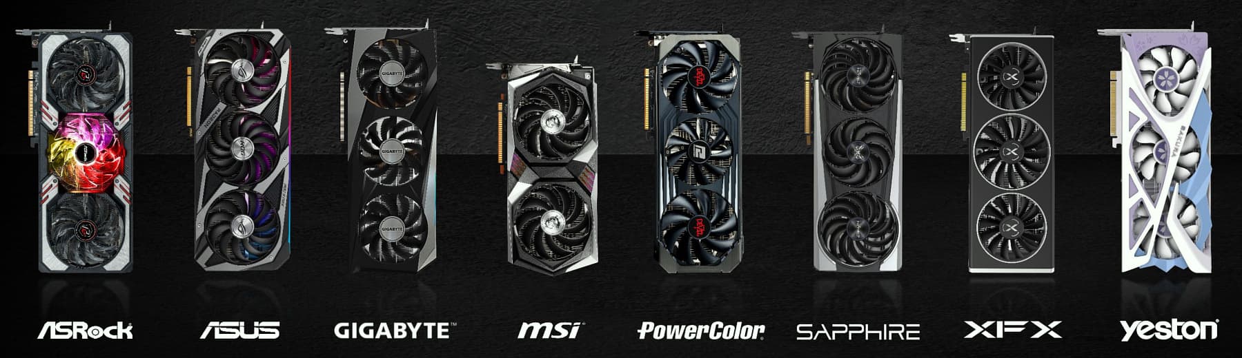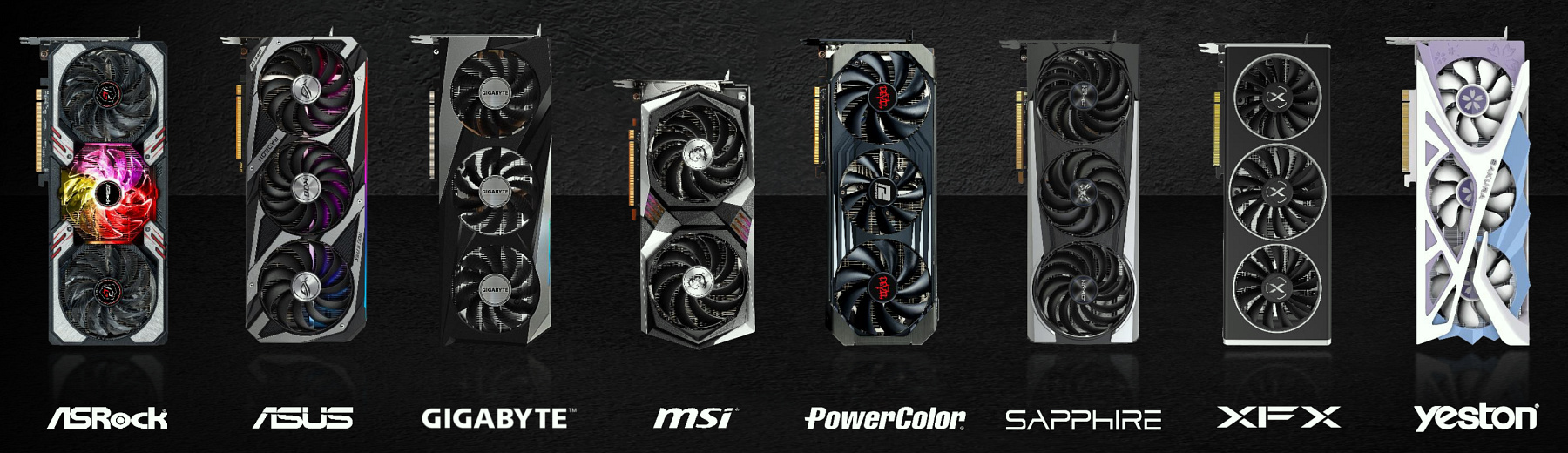 К слову о партнерах: множество вариантов Radeon RX 6700 XT разных компаний с собственным дизайном печатных плат и систем охлаждения уже были анонсированы. Конечно же, от них традиционно можно ожидать лучших показателей производительности при разгоне — фабричном и дополнительном. Партнеры наверняка также повысят предел потребления (и так немалый, впрочем), дополнив это улучшенными системами питания и охлаждения. А вот компактных видеокарт почти не будет, как видно на коллаже, сейчас модны трехвентиляторные монстры.