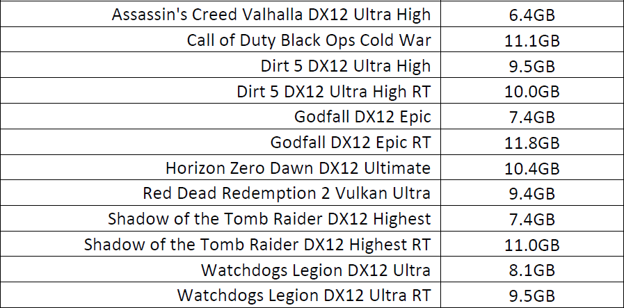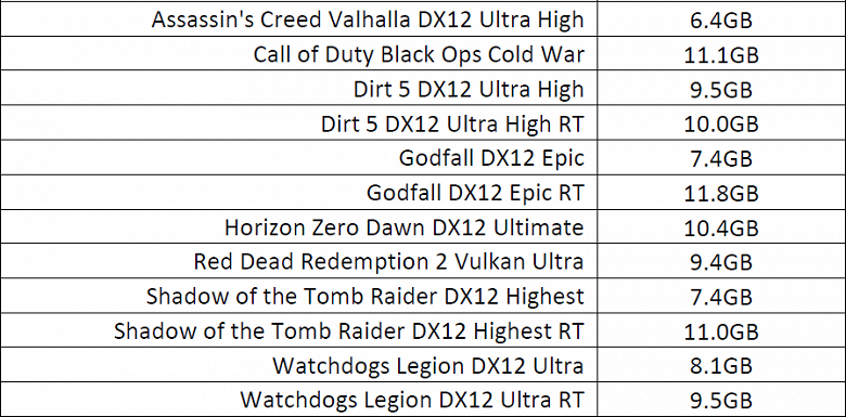 В таблице показана загрузка видеопамяти всей системой в определенных играх, включая самые современные проекты с использованием трассировки лучей. Естественно, везде были максимальные настройки. Как видите, 8 ГБ у конкурентов сегодняшней новинки может не хватать, и некоторые игры занимают по 10-11 ГБ места в памяти. Но ключевое слово тут «может», так как практика показывает, что несмотря на значения занятого объема VRAM, видеокарты с меньшим объемом могут совсем не пострадать.