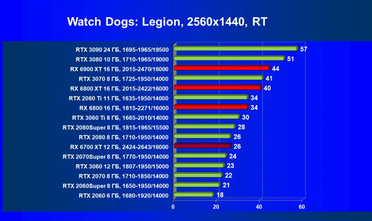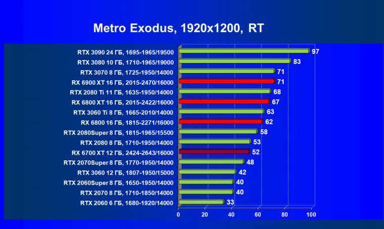 Ничего нового мы тут не скажем. В играх с трассировкой лучей соперничество новых Radeon с GeForce RTX происходит на уровень ниже: Radeon RX 6700 XT оказался слабее, чем GeForce RTX 2080. Впрочем, опять же, последний был дороже на момент написания статьи. И кто его знает, что будет через месяц или два.