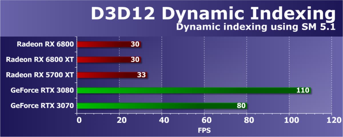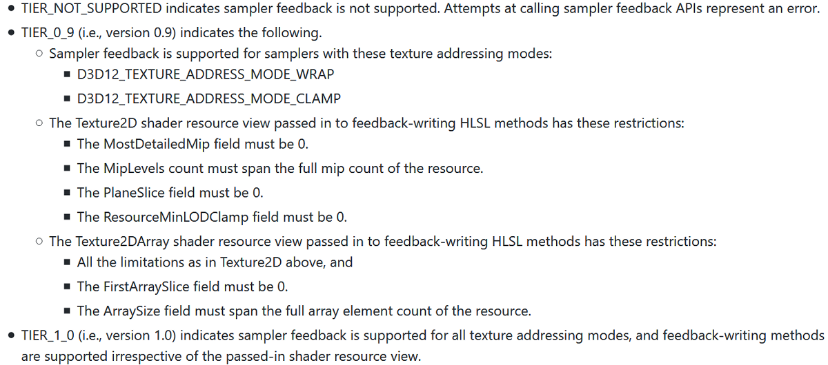 Заметили требуемую версию Tier 0.9 для sampler feedback? А ведь существует и уровень Tier 1.0, который как раз и означает полную поддержку sampler feedback для всех режимов адресации текстур, а вот 0.9 имеет некоторые ограничения. Именно в этой маленькой детали и заключается разница между поддержкой DX12 Ultimate графическими процессорами AMD и Nvidia. Причем RDNA 2 поддерживает Tier 1.0, а Turing и Ampere — только 0.9, и поддержка 1.0 этими решениями не планируется. Это связано с особенностью, которая не поддерживается аппаратно решениями Nvidia — в них отсутствует поддержка для редких режимов зеркальной адресации текстур Mirror и Mirror_Once.