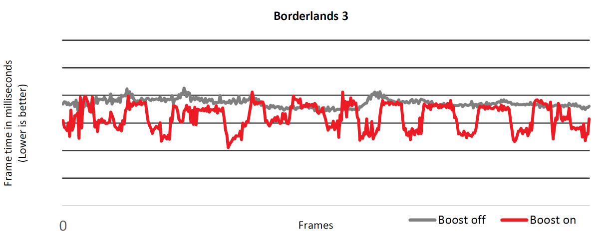 Соответственно, задержки получаются ниже лишь при движении — с включенным Boost время кадра снижается, и некоторые могут подумать, что более стабильное время кадра воспринимается комфортнее. Но эти задержки напрямую влияют на время между действиями игрока и их отображением, и снижение задержек улучшает точность в соревновательных играх — там, где она так сильно нужна.