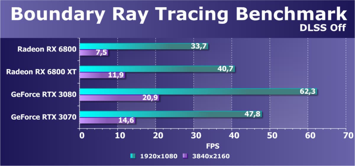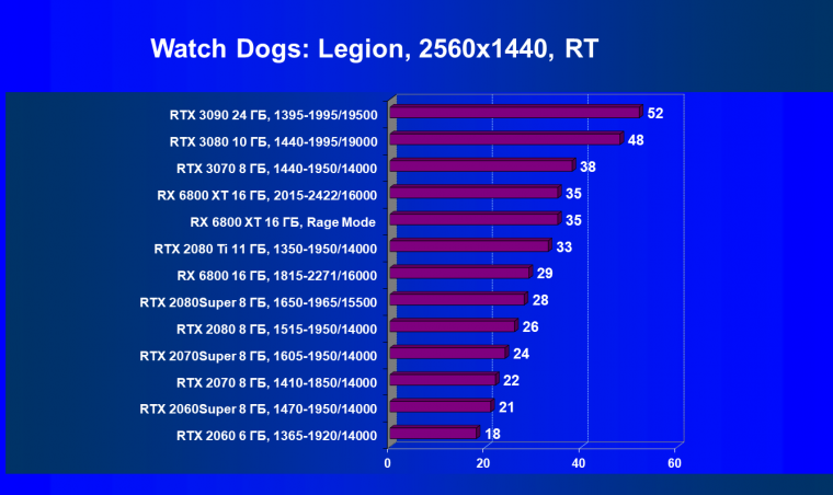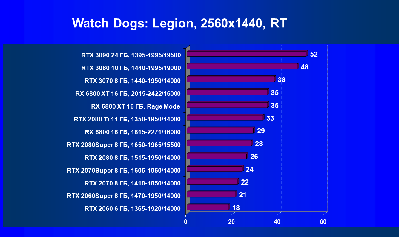 Как и в случае Radeon RX 6800 XT, тут все печально. Наблюдается проигрыш не только своему прямому конкуренту GeForce RTX 3070, но и ускорителю 2-летней давности GeForce RTX 2080. Также надо напомнить, что в ряде игр со включенной трассировкой лучей при использовании видеокарты AMD наблюдаются артефакты, например некорректная отрисовка отражений в Watch Dogs: Legion.