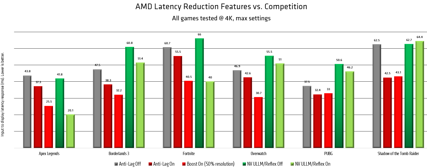 На приведенной выше диаграмме представлены итоговые результаты применения двух технологий снижения задержек по сравнению с аналогами конкурента Nvidia. Хотя кое-где технологии работают весьма схоже, в других играх решения AMD вроде бы дают меньшие задержки и, соответственно, лучший комфорт. Не забывайте лишь то, что это сравнение выполнено самой AMD — заинтересованной стороной. Возможно, когда-нибудь мы сможем все протестировать самостоятельно.