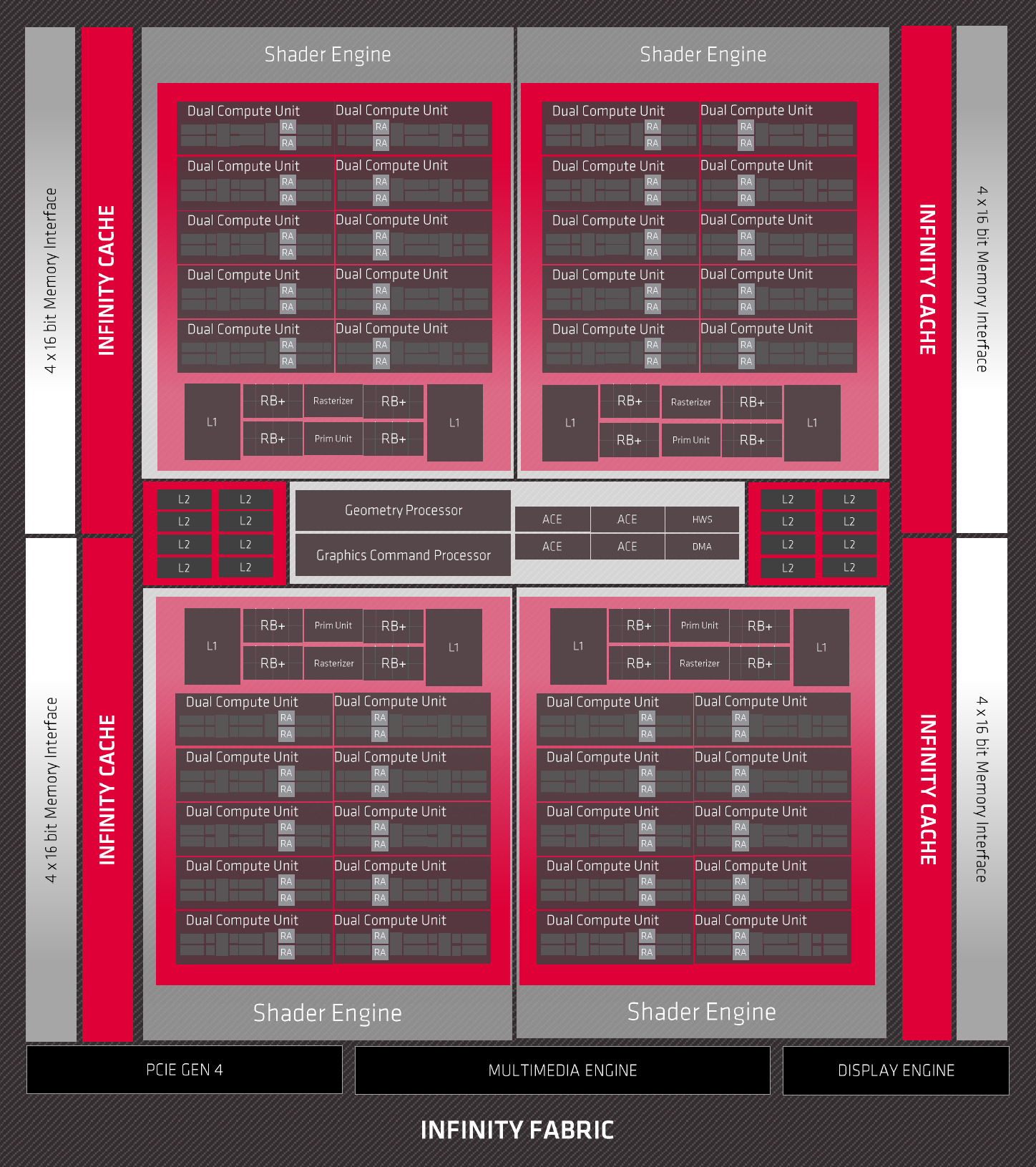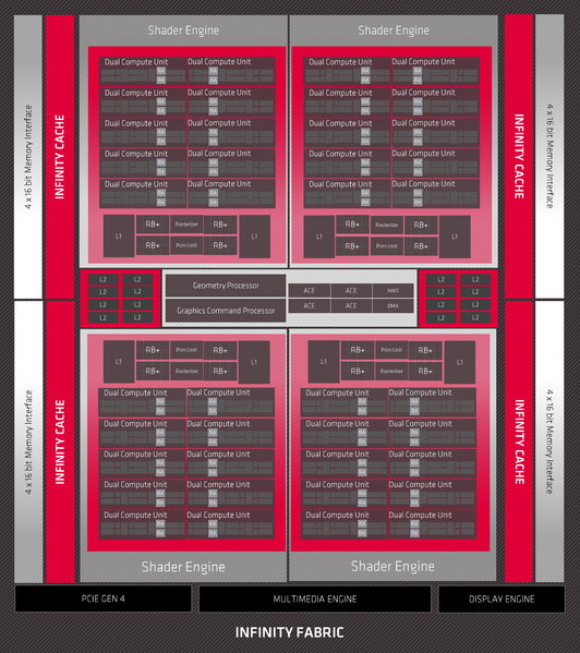 Базовые блоки Navi 21 — те же вычислительные блоки Compute Unit (CU), из которых собраны все графические процессоры AMD последних лет. Каждый CU имеет выделенное локальное хранилище данных для обмена данными или расширения локального регистрового стека, а также кэш-память и полноценный текстурный конвейер с блоками выборки и фильтрации. Каждый из таких блоков самостоятельно занимается планированием и распределением работы. Схема полной версии Big Navi выглядит так: