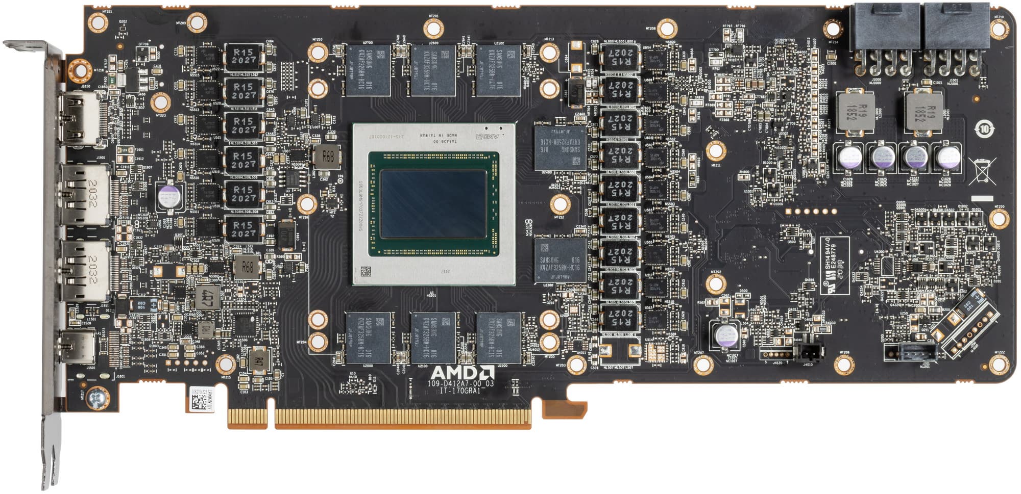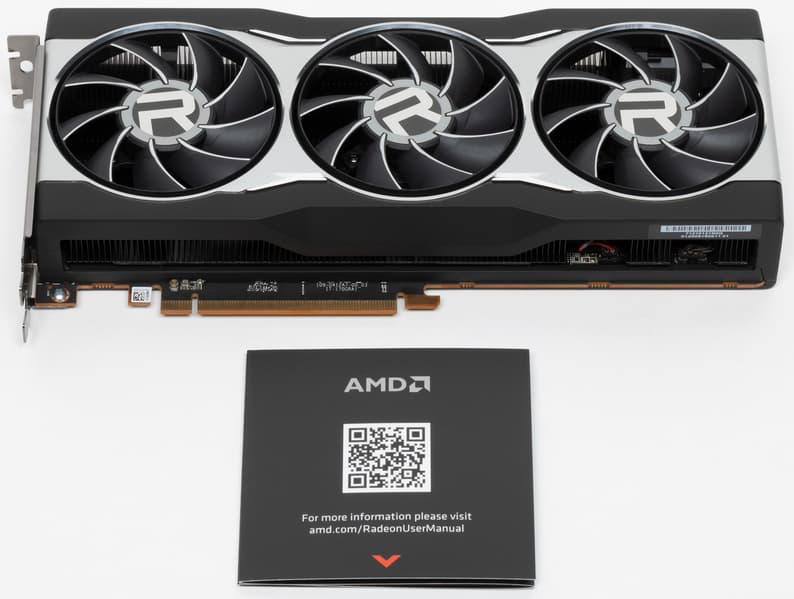Референсный дизайн видеокарты Radeon RX 6800 схож с исполнением старшего решения, но при меньшем потреблении в 250 Вт младшая модель ограничивается двумя слотами в корпусе, что в глазах многих пользователей также будет небольшим, но преимуществом. Длина платы составляет стандартные 267 мм, а система охлаждения с большим радиатором и тремя большими вентиляторами работает довольно эффективно. Электропитание плате обеспечивают два стандартных 8-контактных разъема питания, плата предлагает один HDMI 2.1, пару разъемов DisplayPort и один USB-C.