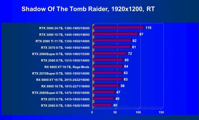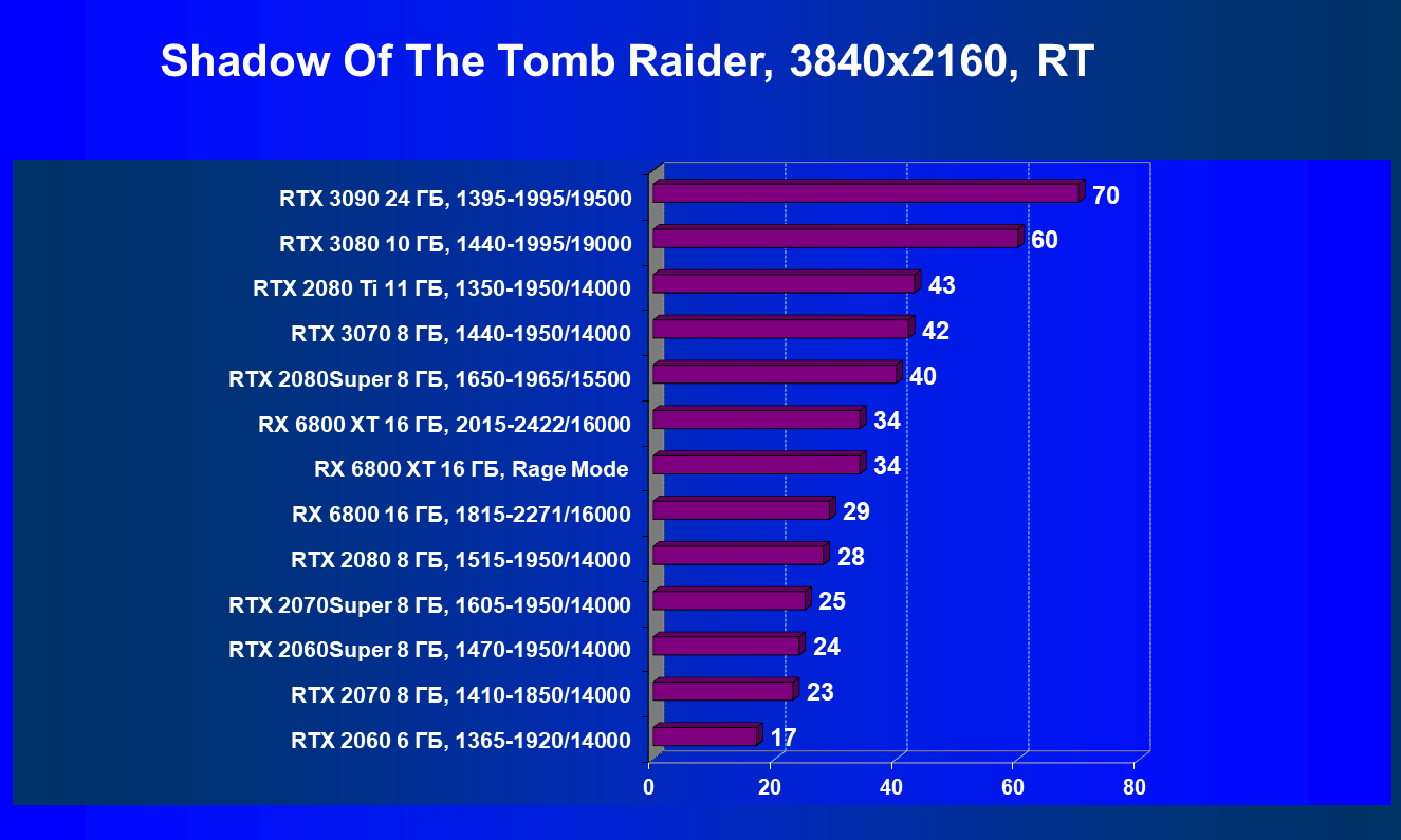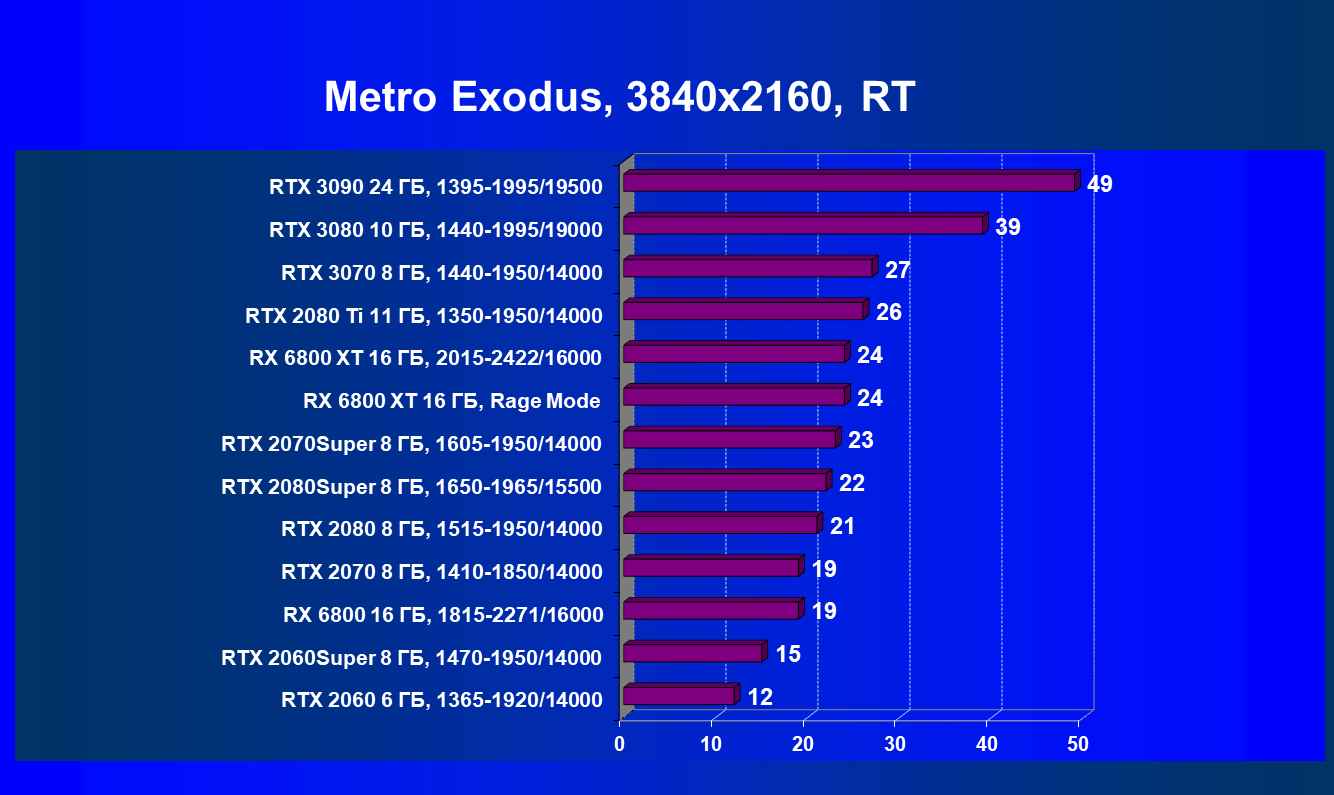 Radeon RX 6800 обгоняет прежние самые быстрые карты AMD (Radeon VII и Radeon RX 5700 XT) и тоже позволяет играть в 4К, обеспечивая в этом разрешении приемлемую производительность при высоких настройках графики, но опять же при условии, что игрок не будет включать трассировку лучей! Увы, у AMD пока нет полного аналога для «умного» метода сглаживания Nvidia DLSS, который смог бы без потерь в качестве картинки нивелировать падение производительности от включения RT.