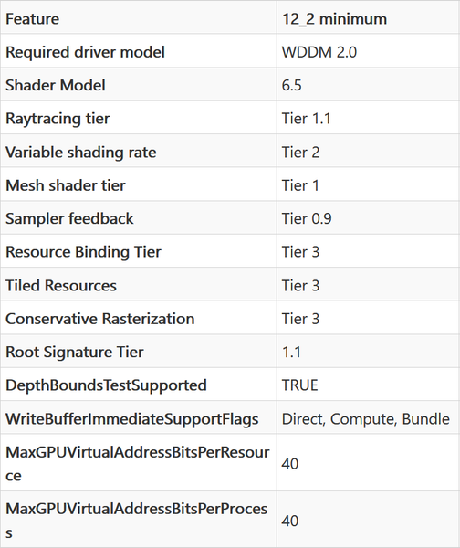 Новый уровень возможностей 12_2 потребовался в Direct3D 12 из-за того, что в современных GPU появилась новая функциональность, не описанная в предыдущих уровнях: трассировка лучей DirectX raytracing, mesh shaders, variable rate shading и sampler feedback. Но там есть важные тонкости — почти у каждой функции есть еще и уровни поддержки (Tier). Например, у трассировки лучей есть уровни 1.0 и 1.1, и все решения AMD и Nvidia поддерживают 1.1. Для того, чтобы получить звание GPU с полной поддержкой feature level 12_2 (и DX12 Ultimate, соответственно), нужна поддержка DXR Tier 1.1, VRS Tier 2, mesh shader Tier 1, sampler feedback Tier 0.9, Resource Binding Tier 3, Tiled Resources Tier 3, Conservative Rasterization Tier 3, Root Signature Tier 1.1 и еще некоторых менее важных вещей.