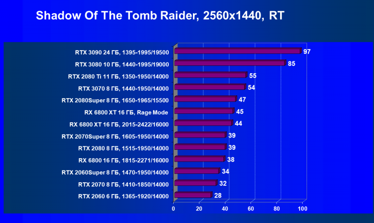 Поскольку ранее выпущенные видеокарты AMD не поддерживают технологии трассировки лучей, а также у них нет поддержки «умных» технологий антиалиасинга типа Nvidia DLSS, мы вынуждены для массового тестирования отключать как трассировку, так и DLSS для получения адекватного сравнения всех карт. Однако на сегодня уже половина из 28 регулярно тестируемых нами видеокарт поддерживает технологию RT, поэтому мы приняли решение, что будем проводить тесты не только с использованием обычных методов растеризации, но и с включением RT. Разумеется, пока в этом списке только видеокарты Nvidia серии RTX и AMD Radeon RX 6800/6800.