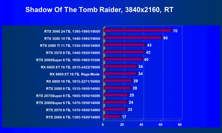 К сожалению, у обеих новинок AMD наблюдается серьезное падение производительности при активизации технологии RT. И Radeon RX 6800 уступает не только RTX 3070, но и более дешевым конкурентам из прошлого поколения.