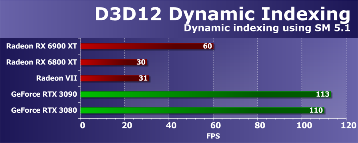 Поэтому, при сложных и многочисленных эффектах с применением трассировки лучей, видеокарты AMD теряют в производительности заметно больше видеокарт Nvidia, причем это касается сравнения и с Ampere и с Turing. Но неужели все потеряно и даже в будущем скорость трассировки лучей на RDNA 2 не удастся повысить хотя бы немного? Некоторые возможности для оптимизации у AMD действительно есть, причем не только со стороны игровых приложений, в которых действительно можно что-то оптимизировать, но и в драйверах. Хотя приросты вряд ли будут настолько большими, чтобы догнать конкурента по этим вычислениям.