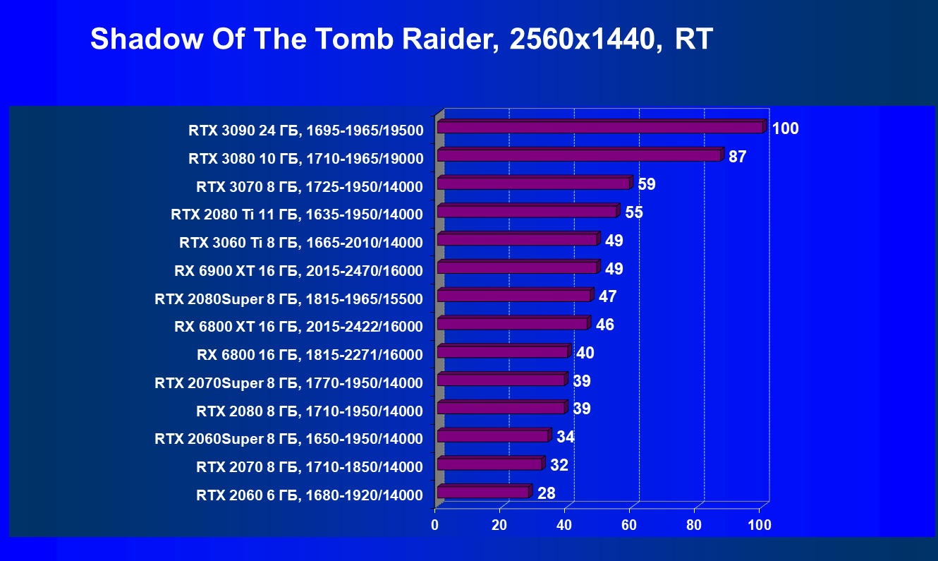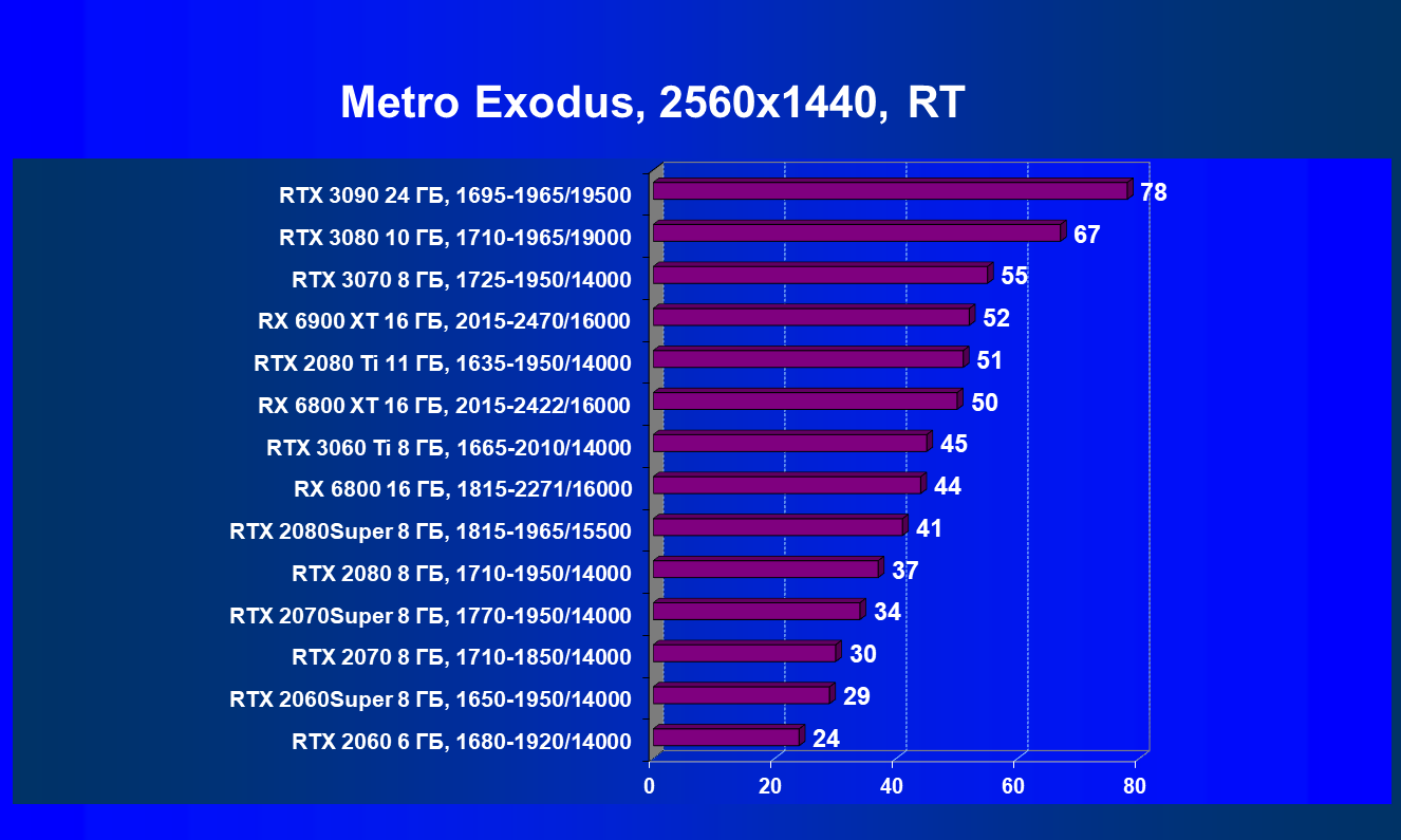 Прямым соперником для нового топового Radeon у компании Nvidia является модель GeForce RTX 3090, скорее всего, хотя она и имеет заметно более высокую рекомендованную цену (а на реальные розничные еще посмотрим, когда карты появятся в продаже). Также взяли в набор и менее производительные решения из последнего поколения RTX 30, так как с той же трассировкой лучей они будут ближе к RX 6900 XT.