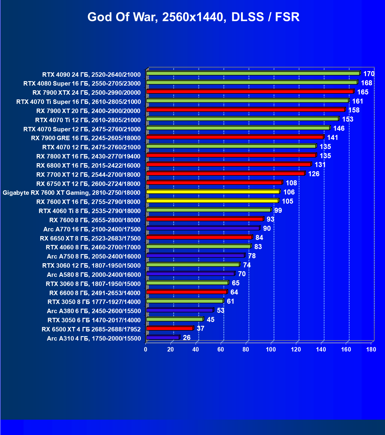 | 13 | Arc A770 16 ГБ, 2100—2400/17500 | 136 | 559 | 41 000 |