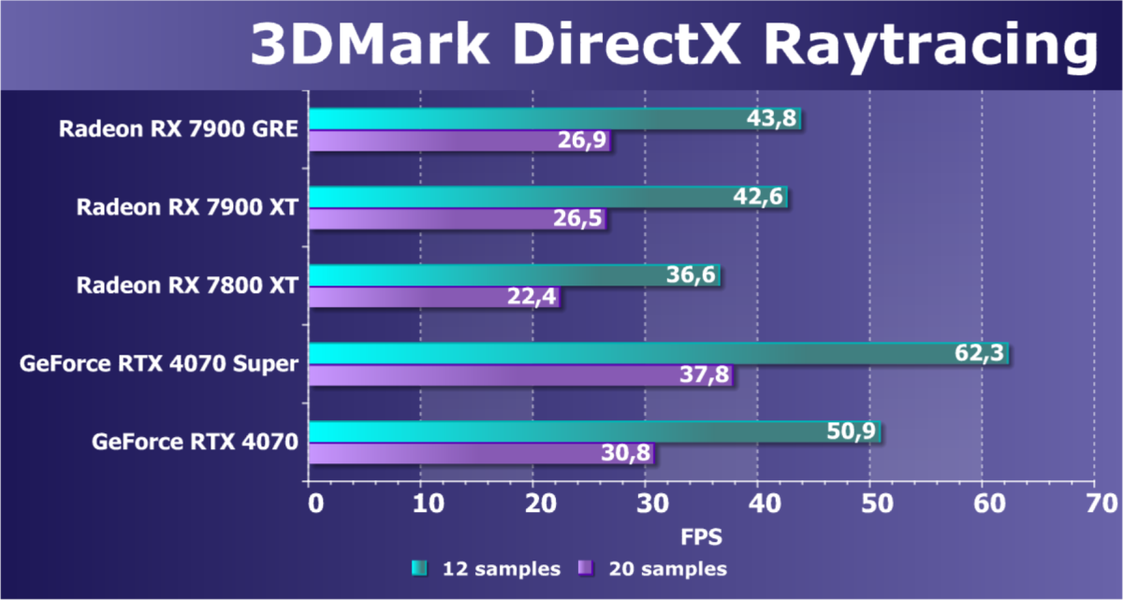 С точки зрения производительности при растеризации, RX 7900 GRE превосходит RTX 4070 на 10%—17% и немного превосходит RTX 4070 Super в играх, использующих исключительно растеризацию, но если покупателя интересуют игры с трассировкой лучей (а кого сейчас они не интересуют?), то тут Nvidia справляется тем лучше, чем более сложная в игре этой трассировка лучей — пусть обе видеокарты могут обеспечить приемлемую частоту кадров при растеризации даже в 4K, но при включении трассировки, модель AMD с этим уже иногда не справляется. Более дорогой конкурент в виде GeForce RTX 4070 Super обойдется дороже, но у него есть свои преимущества в виде более высокопроизводительной трассировки лучей, лучшей энергоэффективности и поддержке всех возможностей DLSS 3.5.