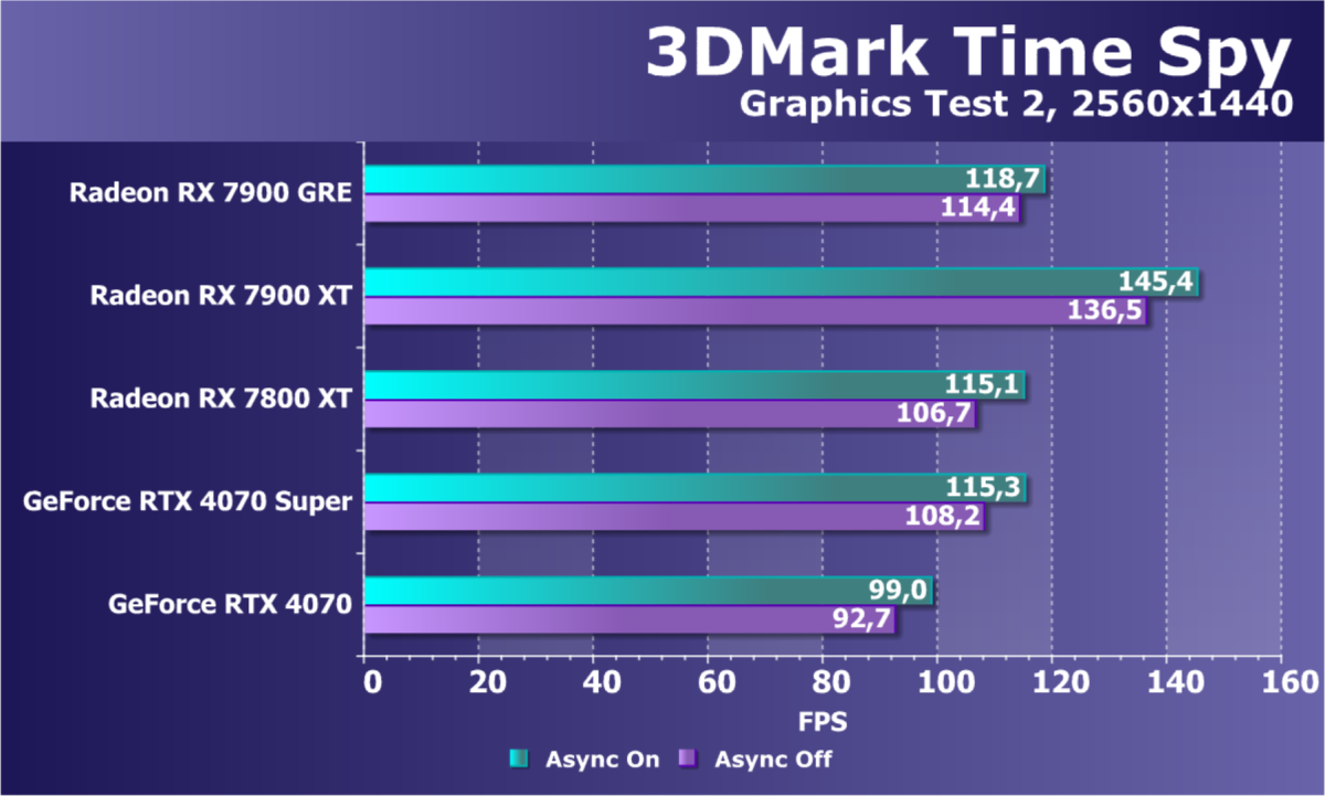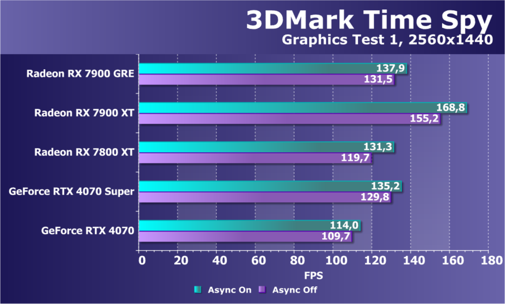 Хотя чипы видеопамяти RX 7900 GRE работают на эффективной частоте в 18 ГГц, что меньше 21 ГГц у RTX 4070 и RTX 4070 Super, но графический процессор AMD имеет 256-битную шину памяти, это дает RX 7900 GRE пропускную способность в 576 ГБ/с по сравнению с 504 ГБ/с для RTX 4070 и 4070 Super. Поначалу AMD существенно ограничила разгон модели GRE, особенно памяти — чтобы она не подбиралась слишком близко к более дорогой RX 7900 XT, но в конце марта они открыли возможность разгона на большую частоту в драйвере Radeon Adrenalin 24.3.1, что в случае GRE оказалось весьма полезным делом - разгон видеопамяти позволил этой модели значительно приблизиться к RX 7900 XT, что сделало рассматриваемую видеокарту еще интереснее.