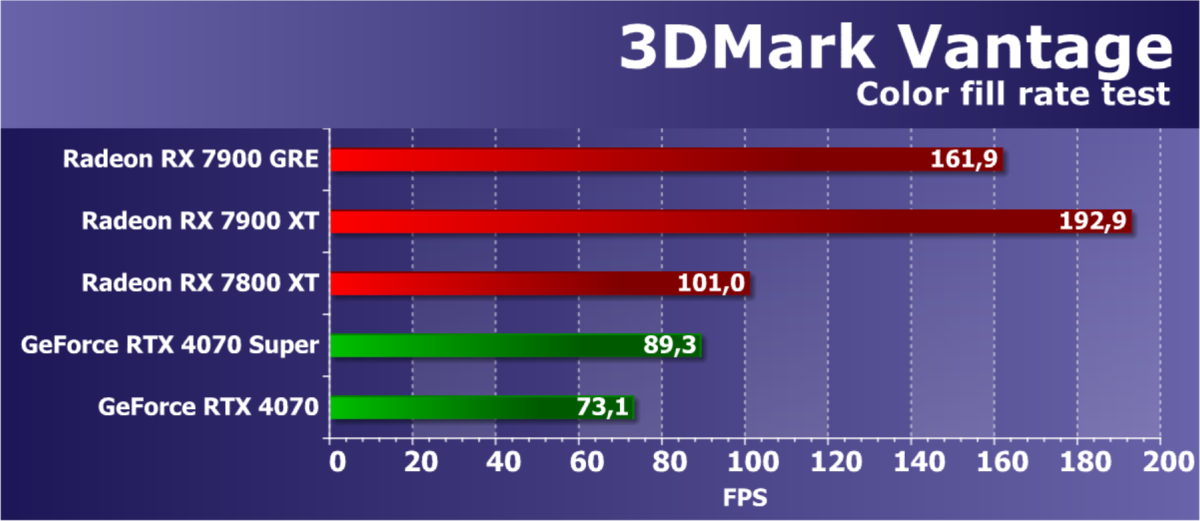 Разница между RX 7800 XT и RX 7900 GRE в основном в вычислительной и текстурной производительности из-за большего количества исполнительных блоков, хотя частота GPU в случае GRE ниже. По реальной игровой производительности RX 7900 GRE находится примерно посередине между RX 7900 XT и RX 7800 XT — в случаях, когда производительность ограничена больше пропускной способностью памяти, GRE ближе к 7800 XT, а в случаях ограничения общей скорости именно вычислительными блоками, GRE приближается к 7900 XT.