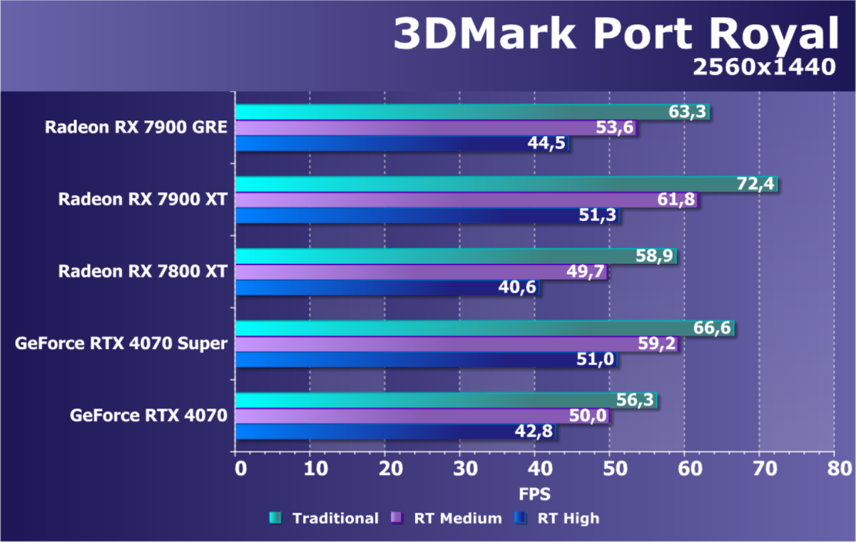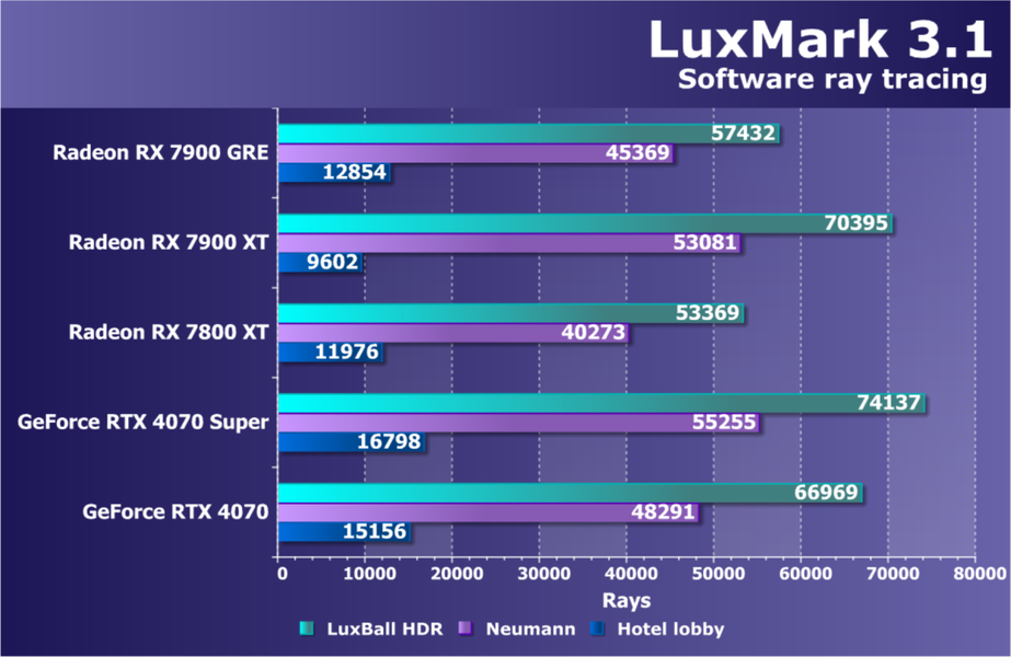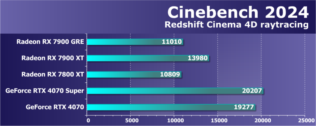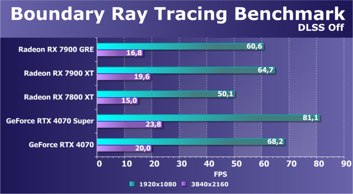 По своим теоретическим характеристикам, видеокарта с суффиксом GRE отлично подходит для заполнения ниши между Radeon RX 7800 XT и Radeon RX 7900 XT. Она успешно конкурировала с GeForce RTX 4070 Ti с более высокой стоимостью, а теперь неплохо выступает и против GeForce RTX 4070 Super. На стороне ускорителя Radeon — объем локальной памяти в 16 ГБ, тогда как GeForce RTX 4070 Ti и GeForce RTX 4070 Super имеют лишь по 12 ГБ памяти, чего может не хватить в редких случаях самых требовательных современных игр. А в качестве минуса Radeon RX 7900 GRE можно назвать привычную ахиллесову пяту карт AMD — производительность аппаратной трассировки лучей, при активном применении которой Radeon RX 7900 GRE не может справиться даже с обычной GeForce RTX 4070.