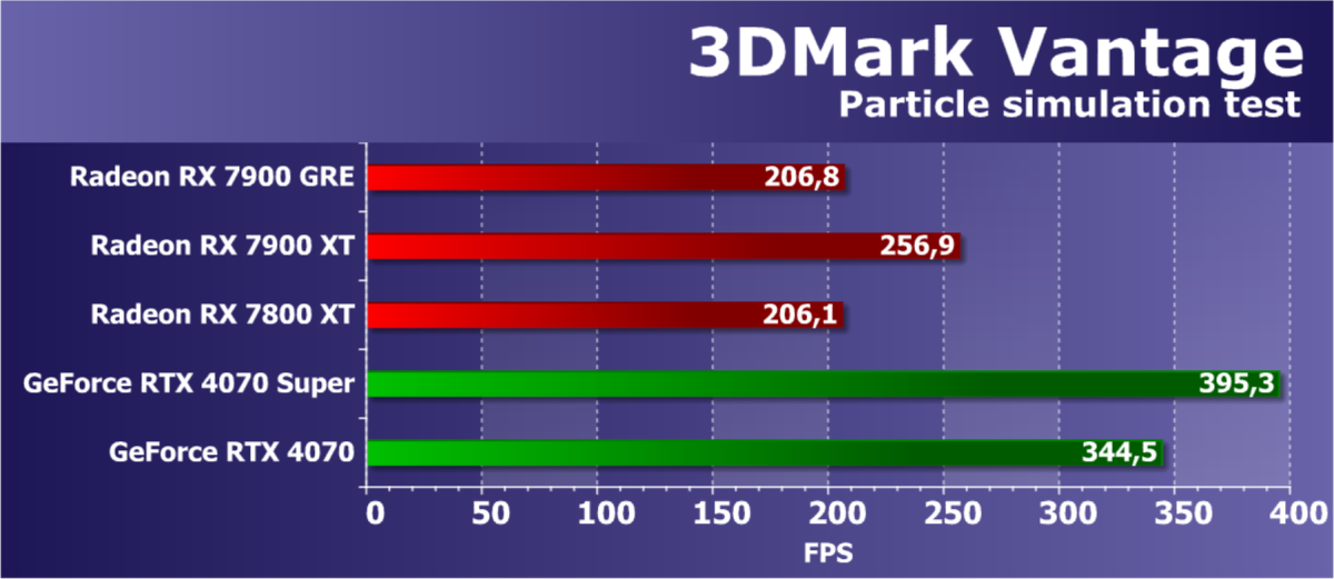 Если посмотреть на энергоэффективность, то GeForce RTX 4070 Super — в лидерах, а Radeon RX 7900 GRE до него далеко.