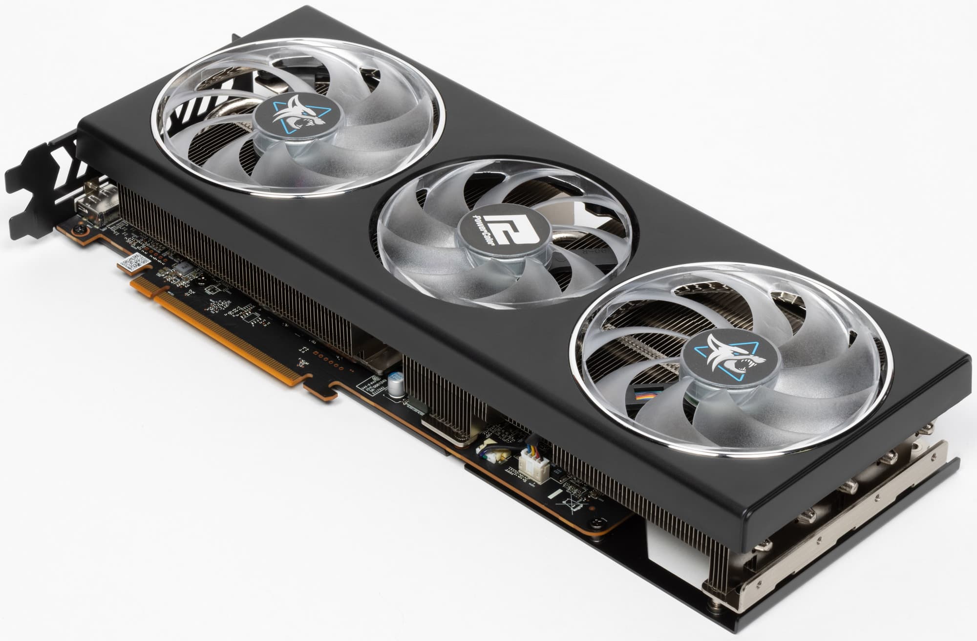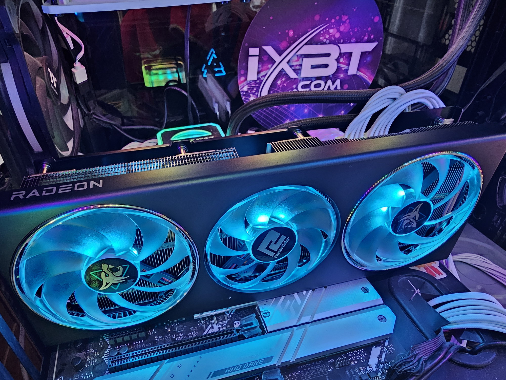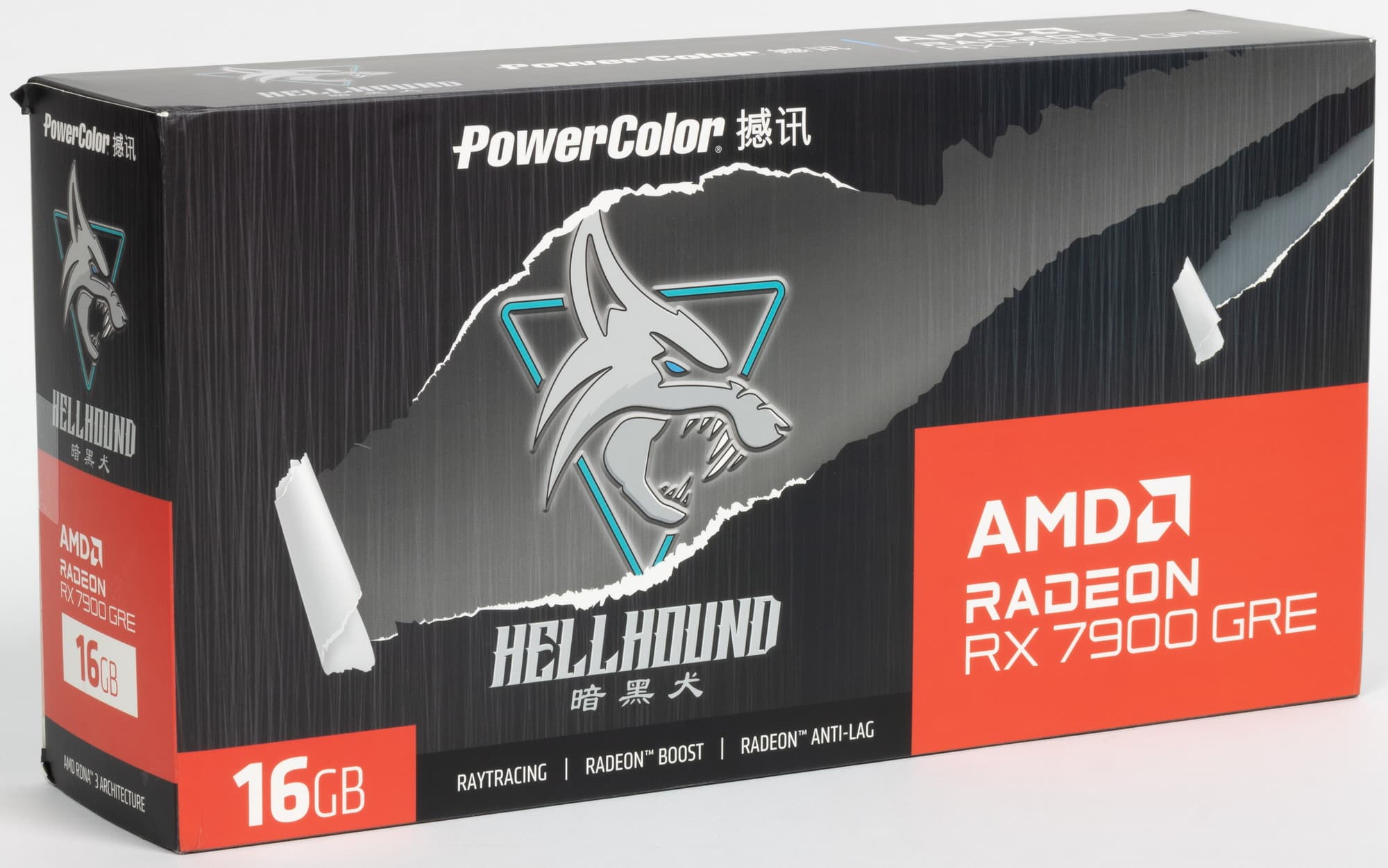 Конкретная протестированная карта PowerColor Radeon RX 7900 GRE Hellhound (16 ГБ) имеет стандартные размеры, занимает три слота в системном блоке. Использованный кулер эффективный и очень тихий, карта может потреблять до 290 Вт и имеет два стандартных 8-контактных разъема питания.
