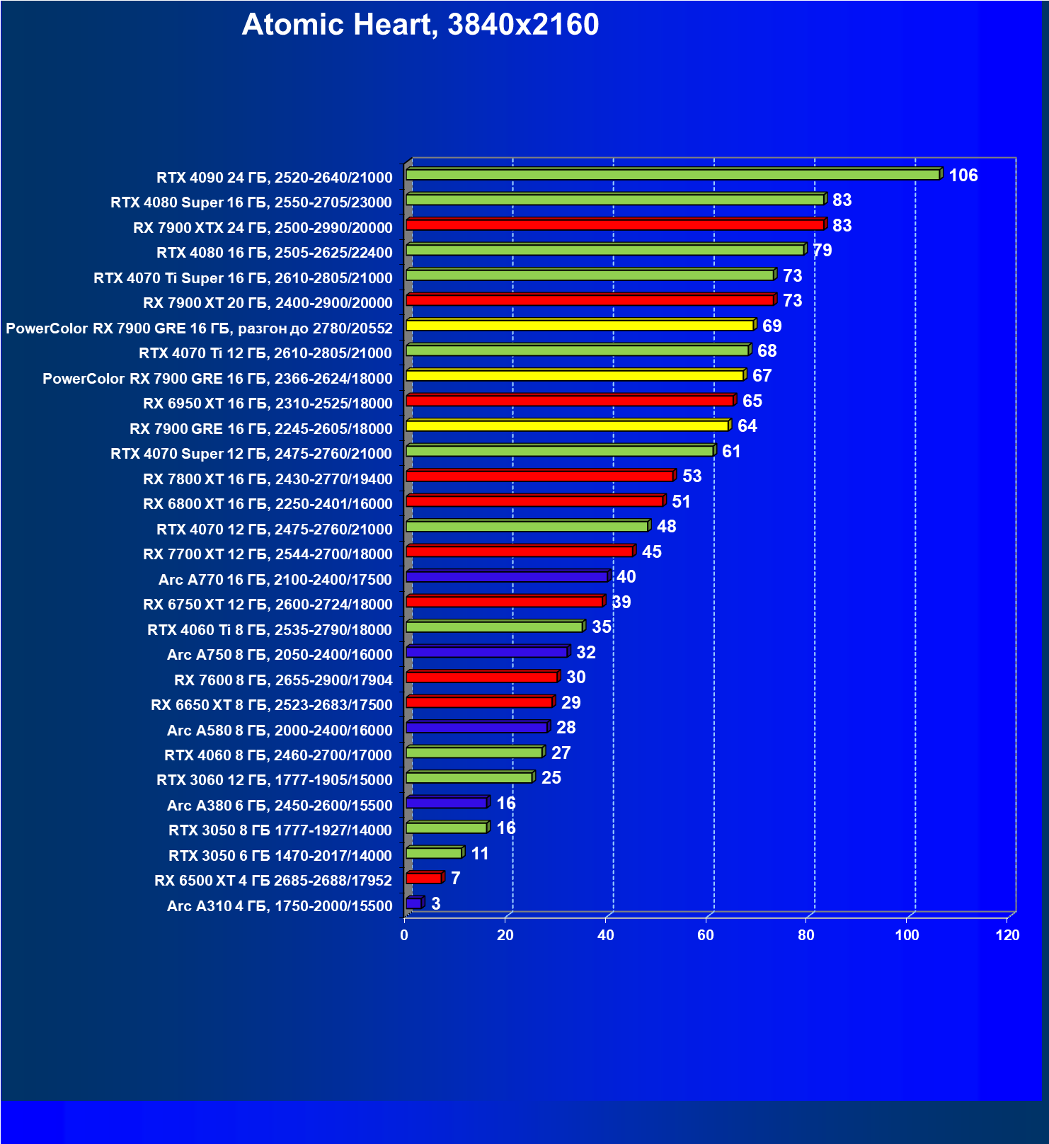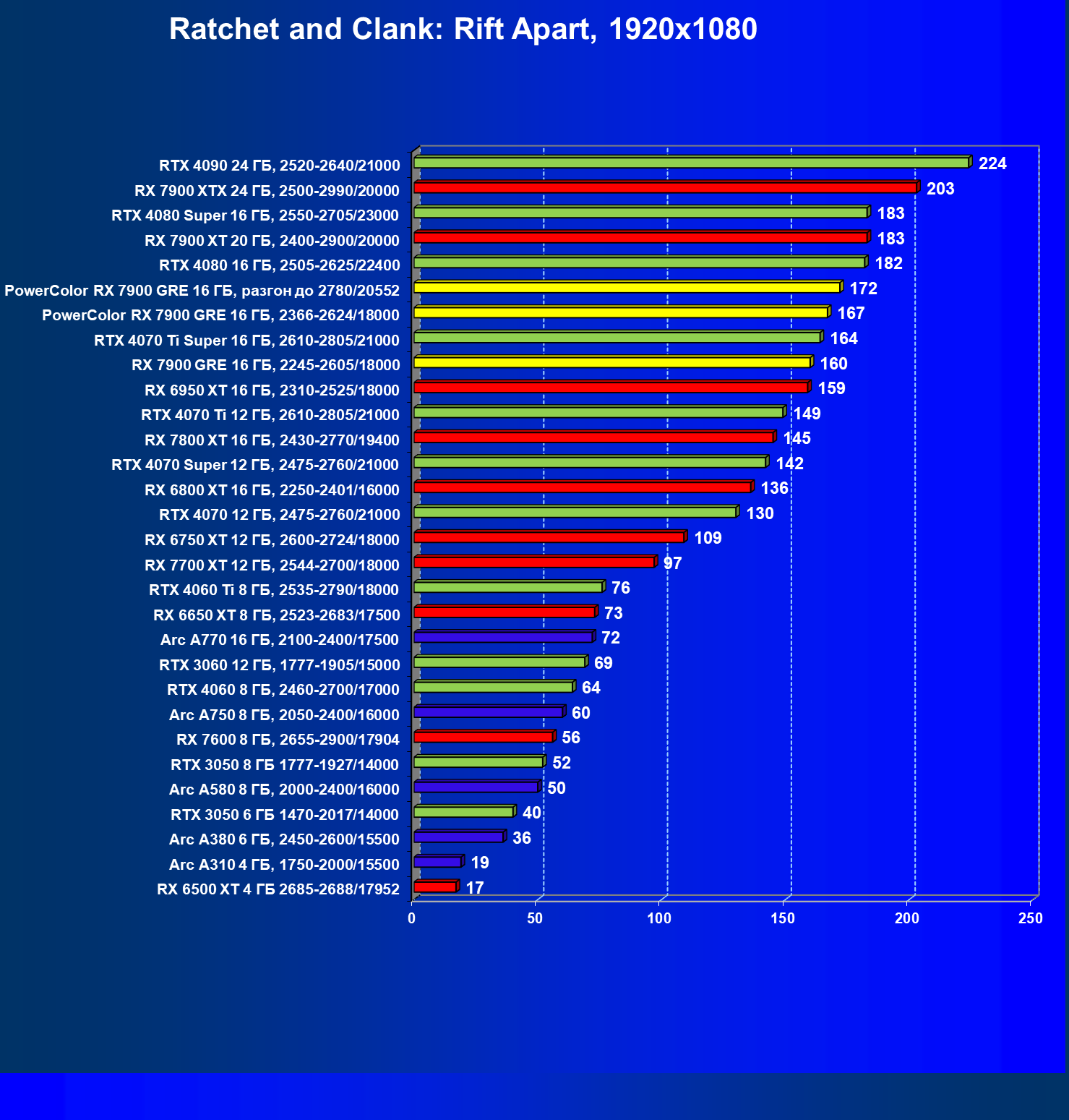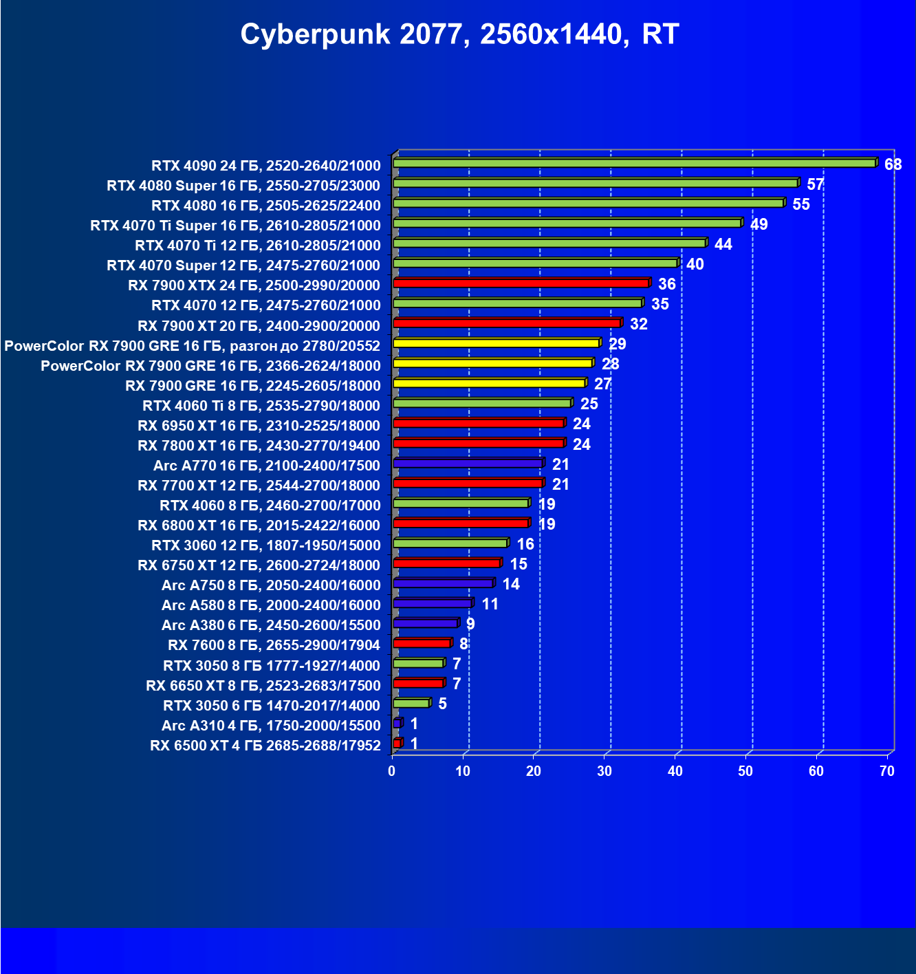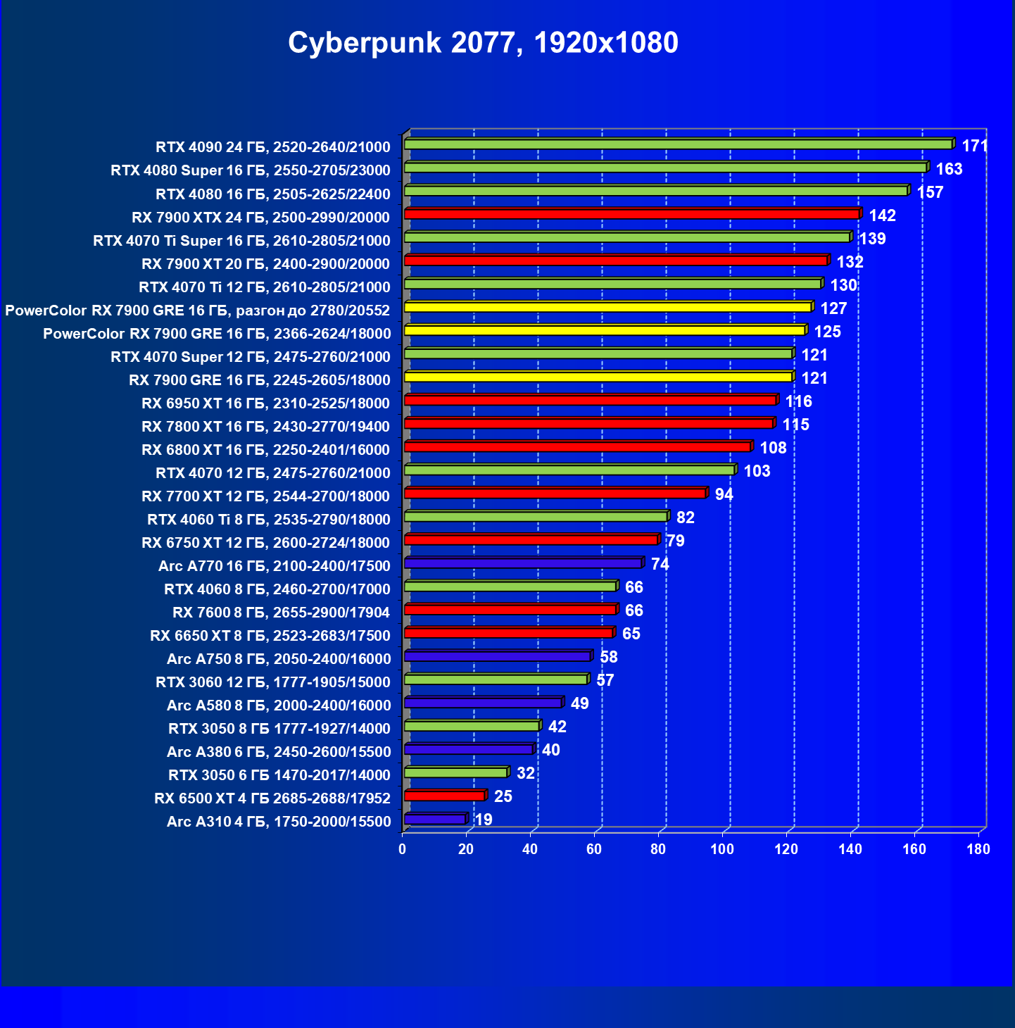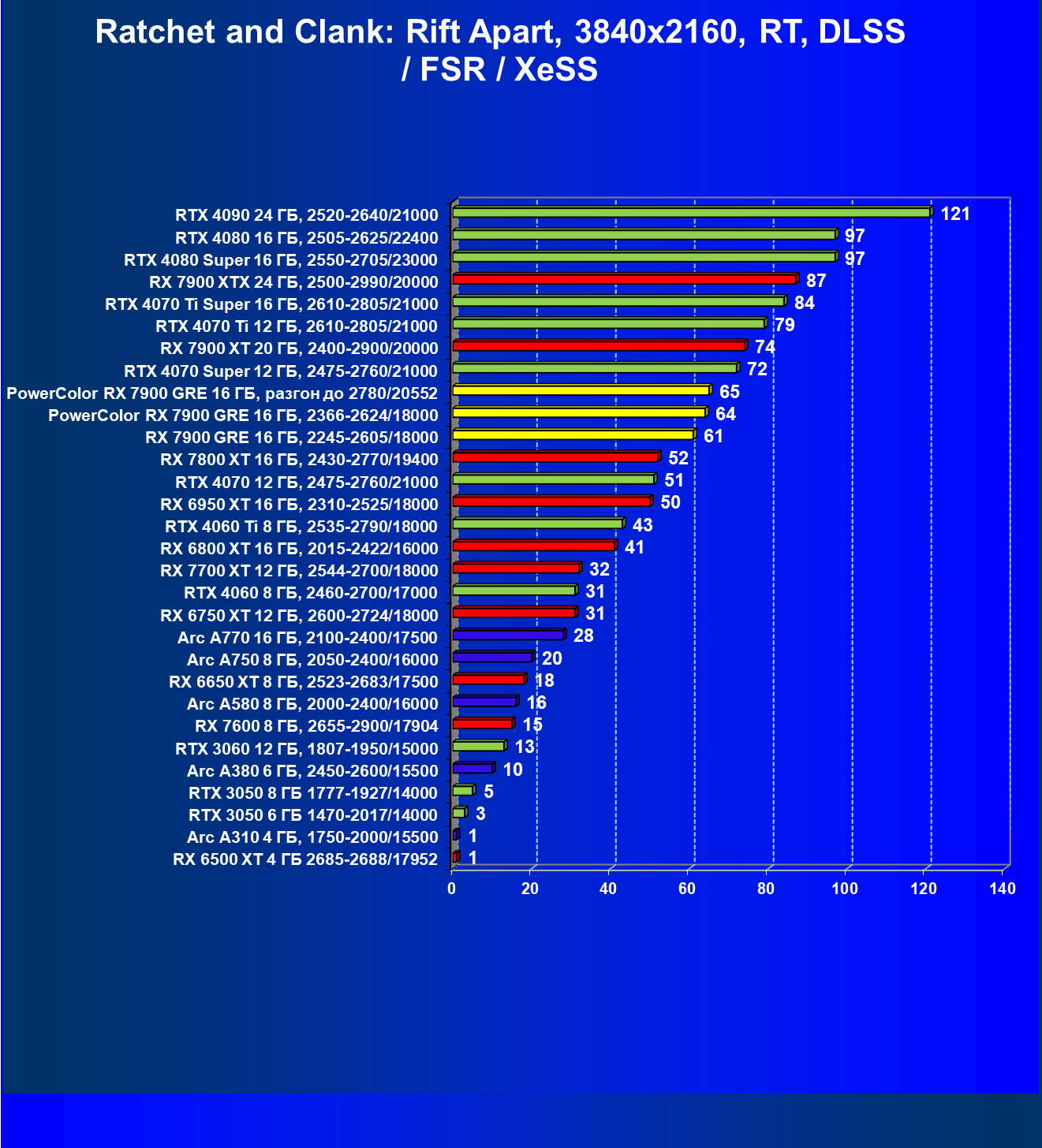 | 07 | PowerColor RX 7900 GRE 16 ГБ, разгон до 2780/20552 | 132 | 885 | 67 000 |