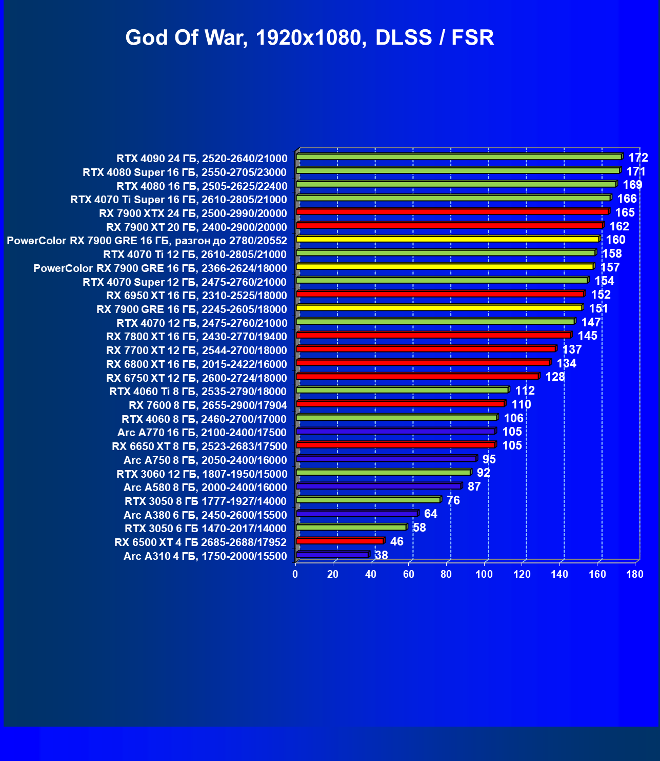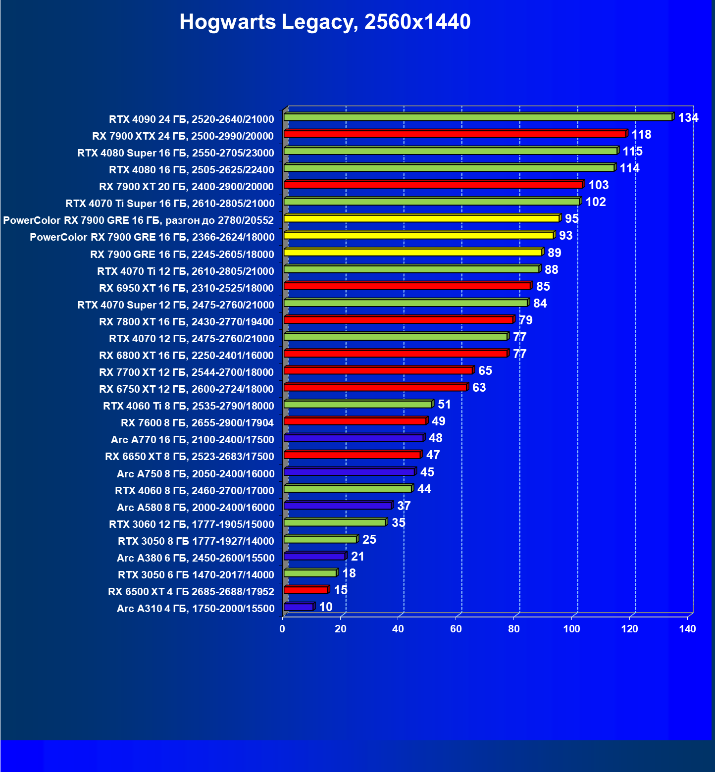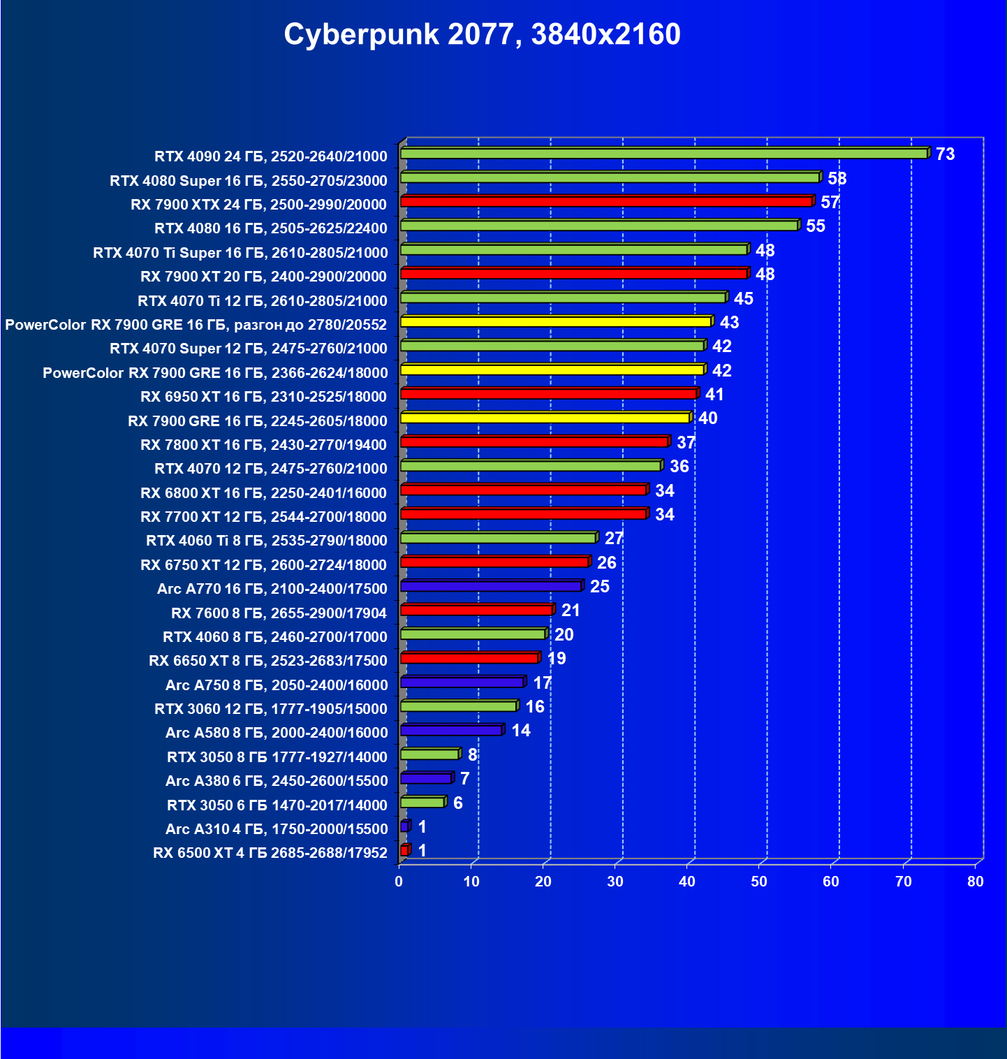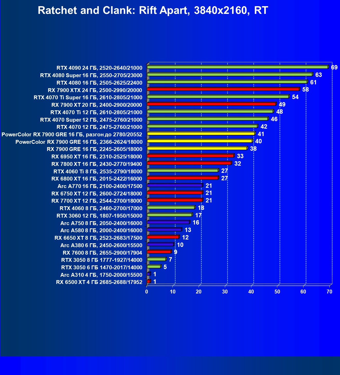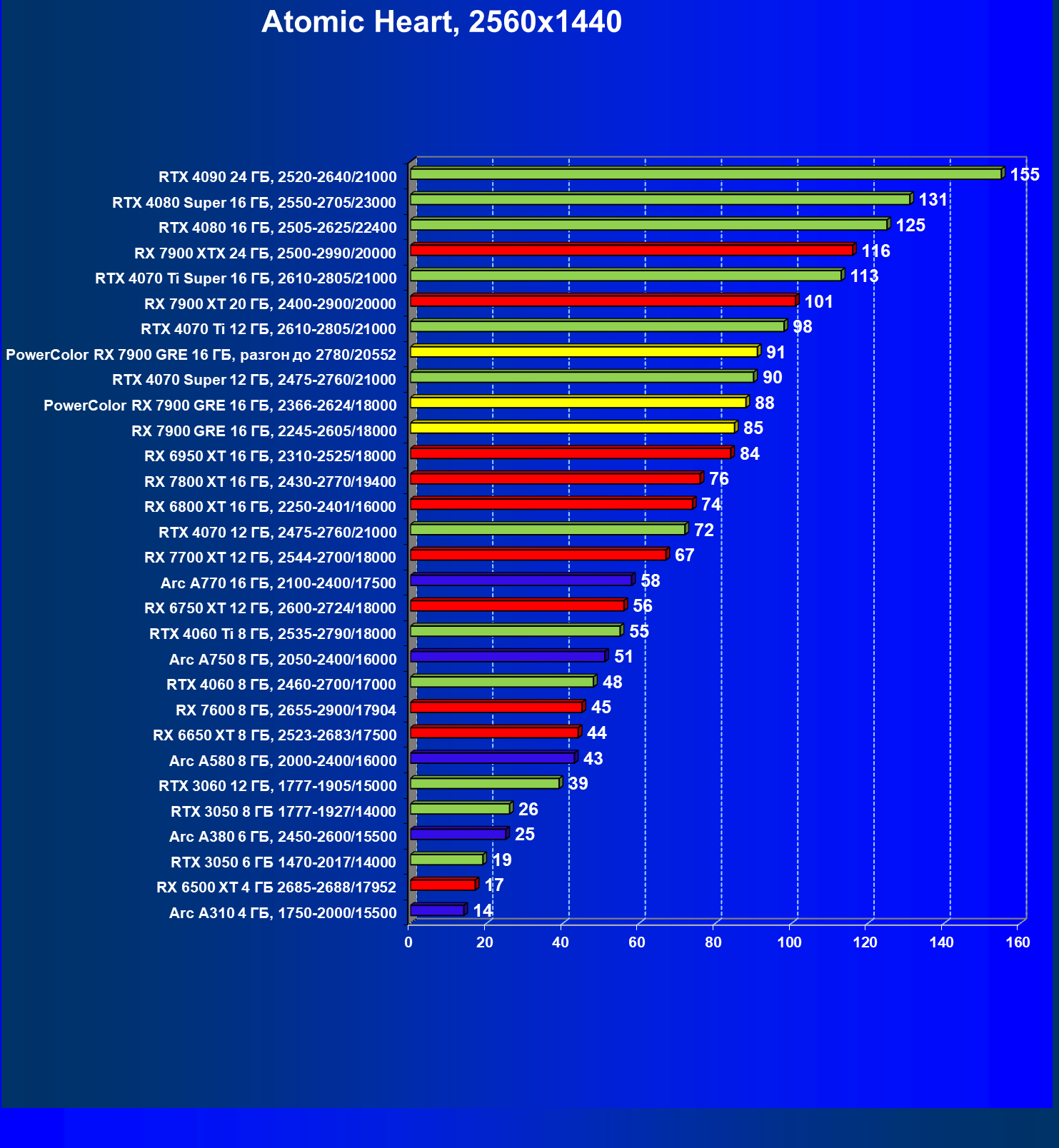 | 07 | PowerColor RX 7900 GRE 16 ГБ, разгон до 2780/20552 | 132 | 885 | 67 000 |