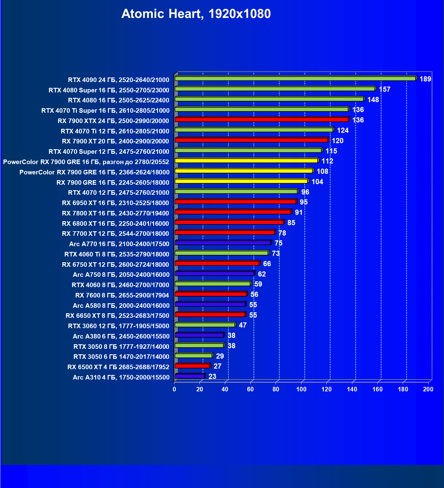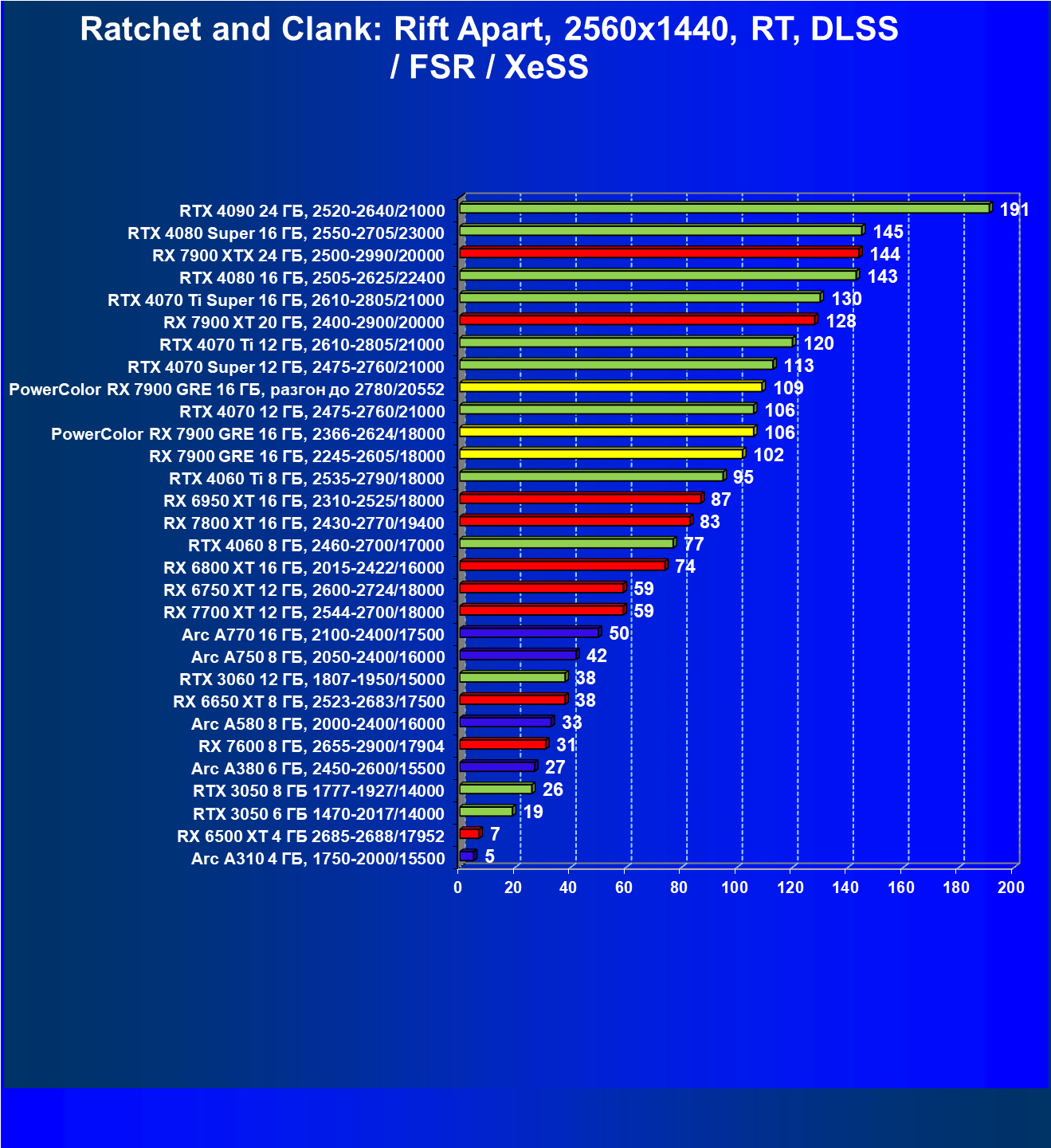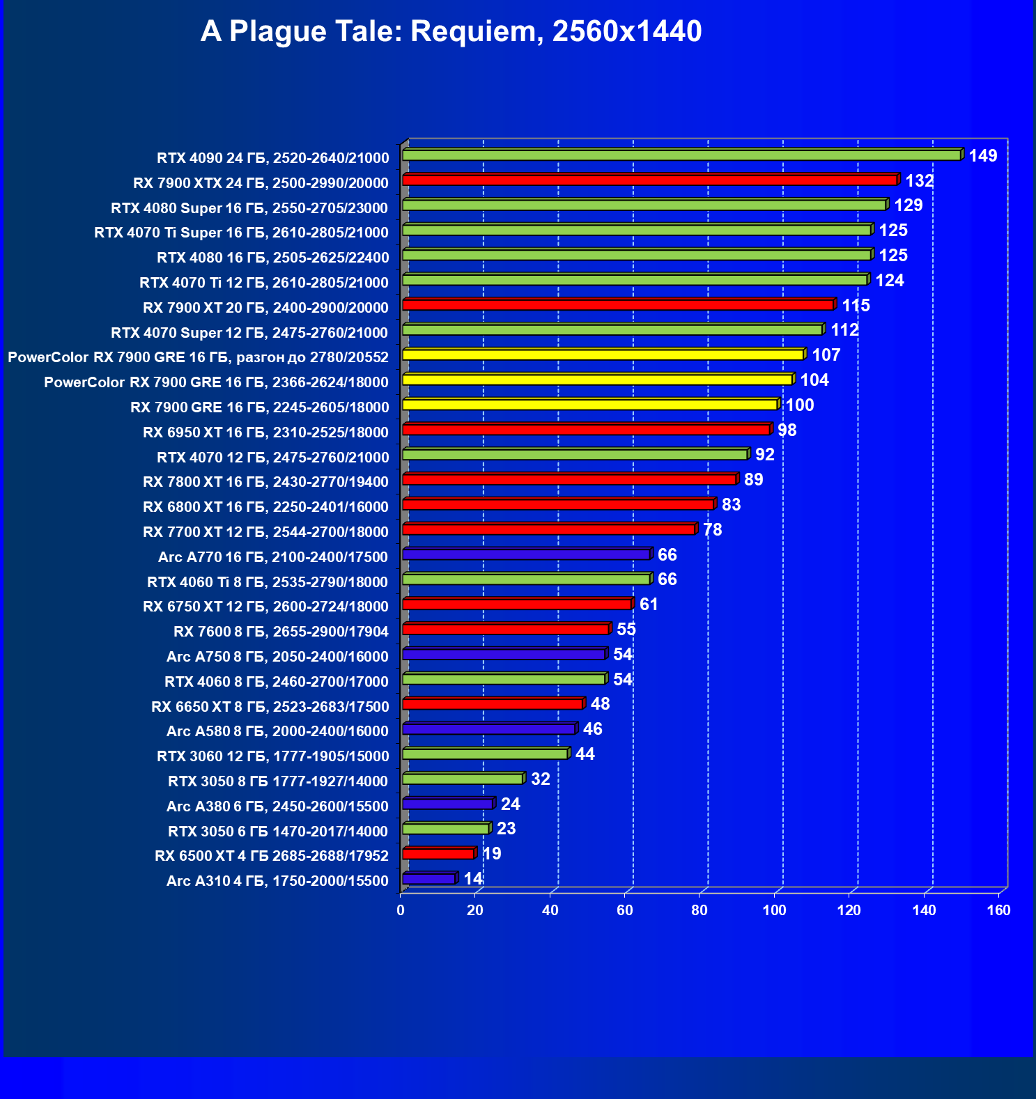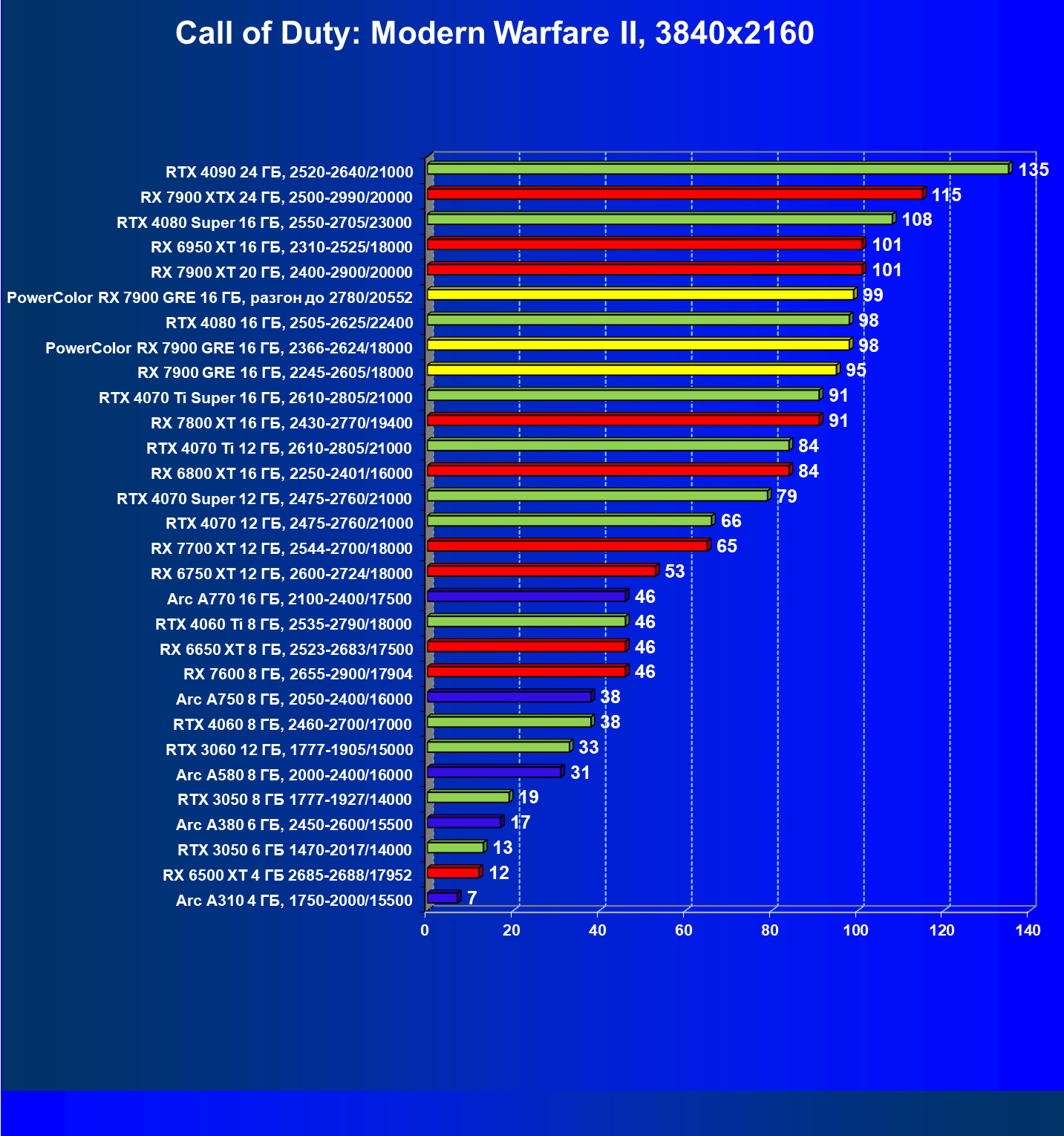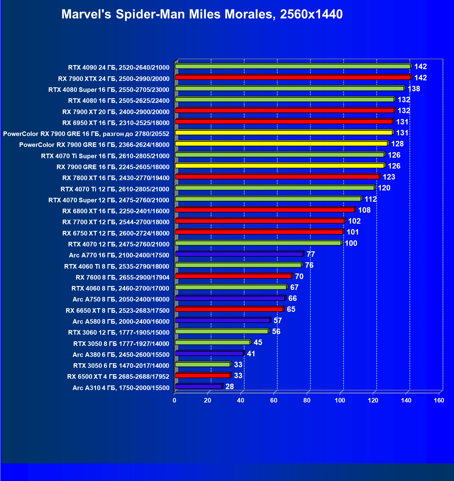 | 07 | PowerColor RX 7900 GRE 16 ГБ, разгон до 2780/20552 | 132 | 885 | 67 000 |