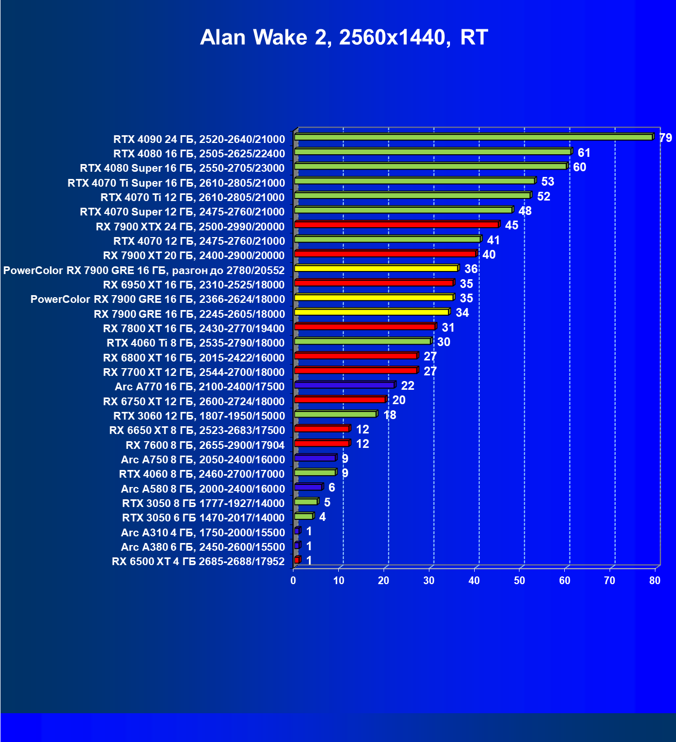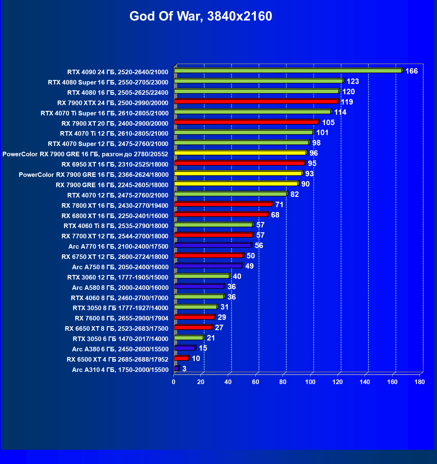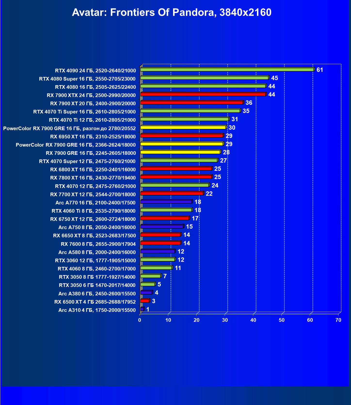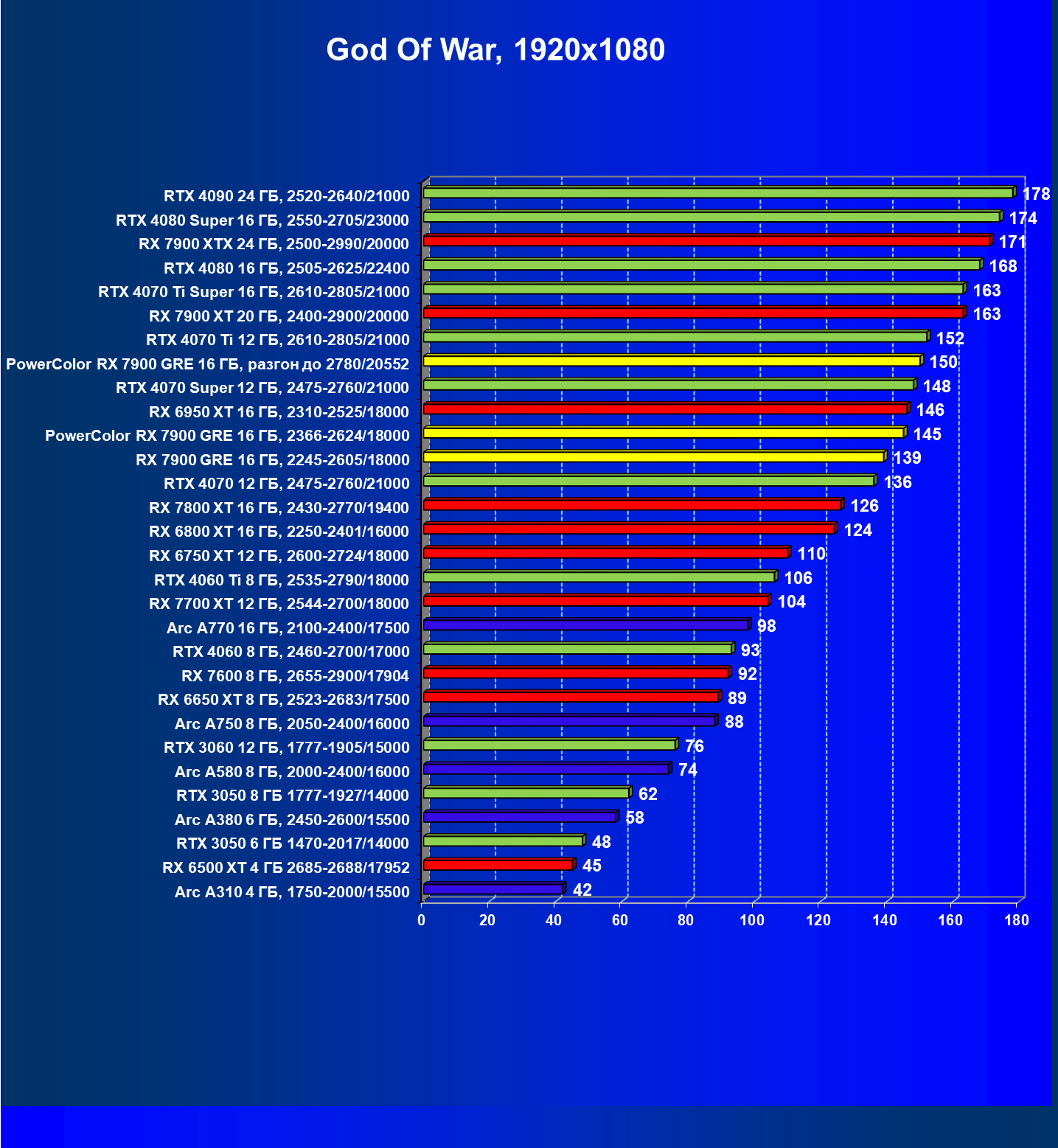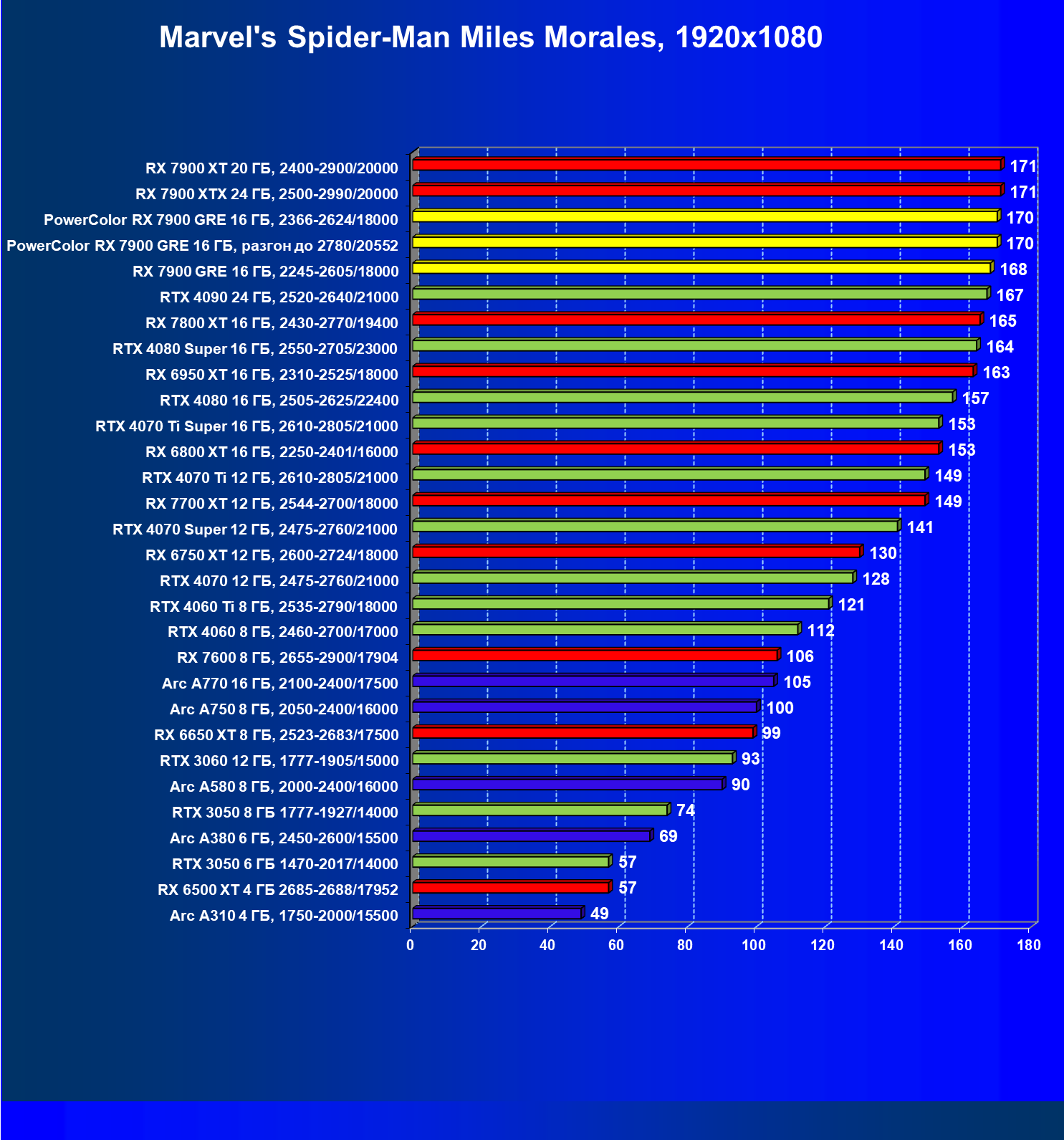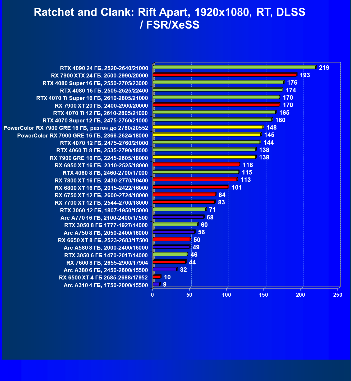 | 07 | PowerColor RX 7900 GRE 16 ГБ, разгон до 2780/20552 | 132 | 885 | 67 000 |